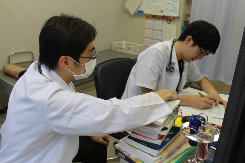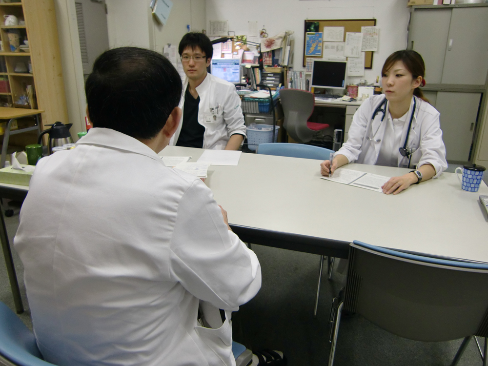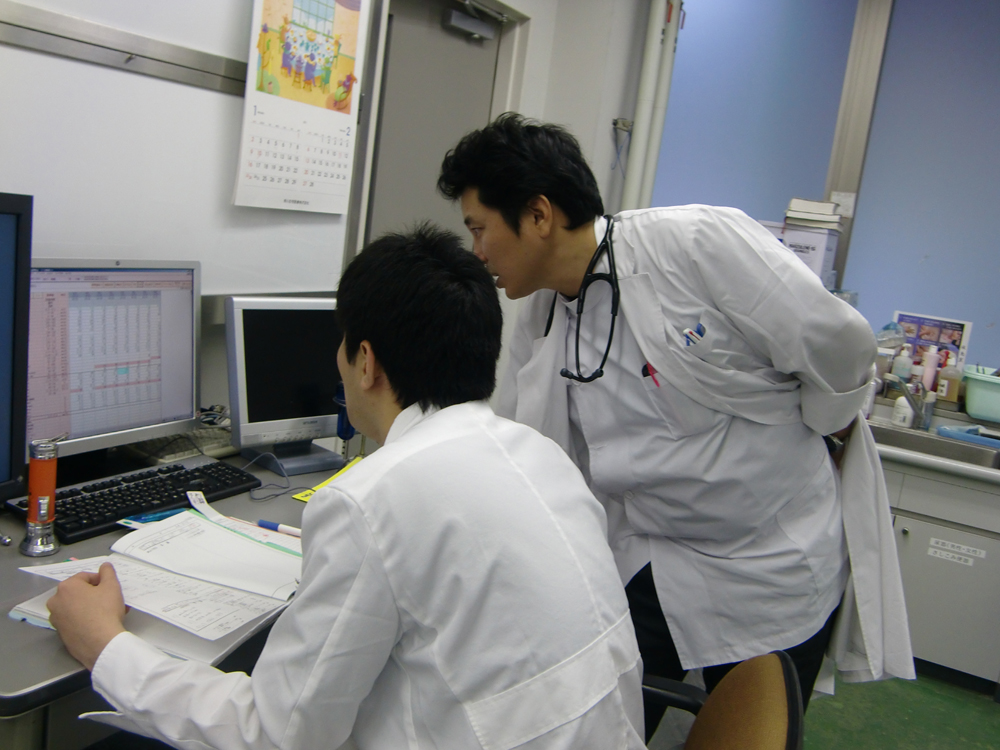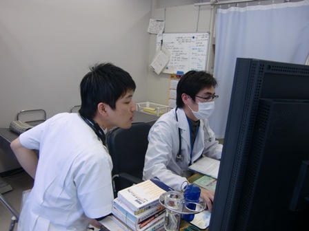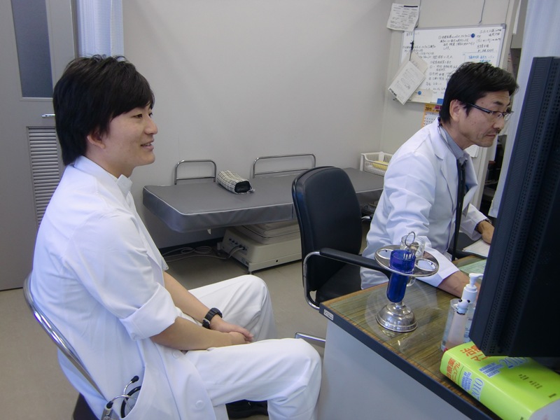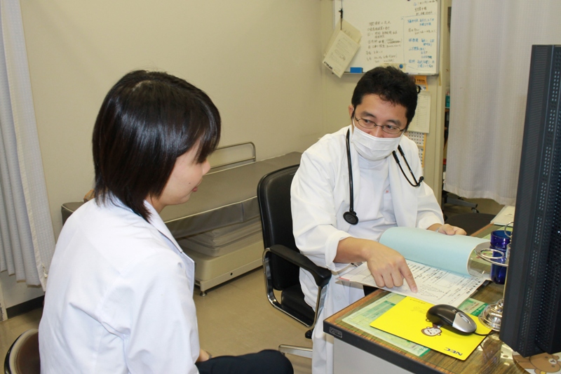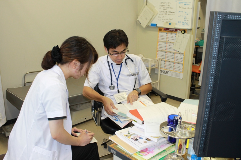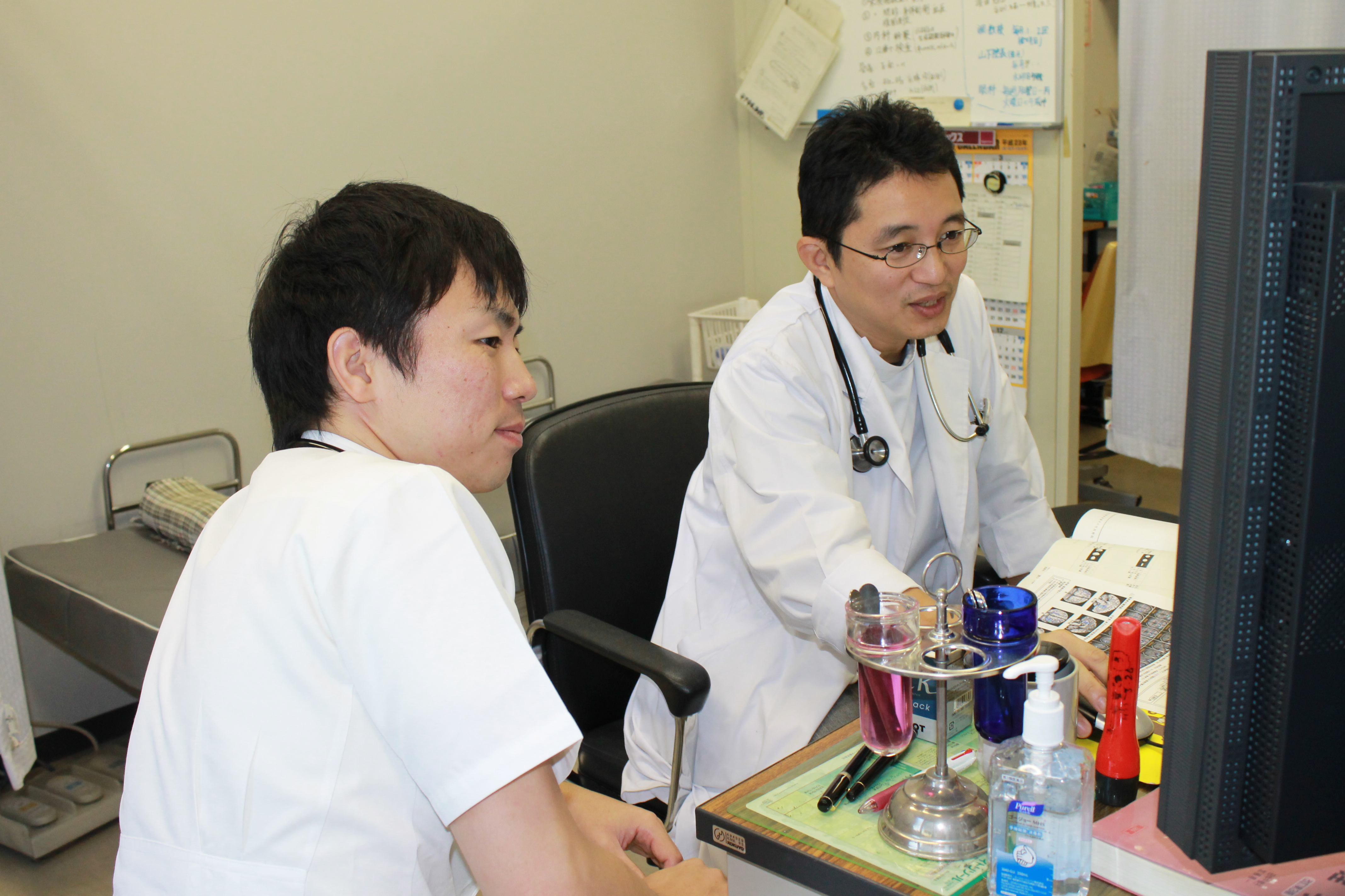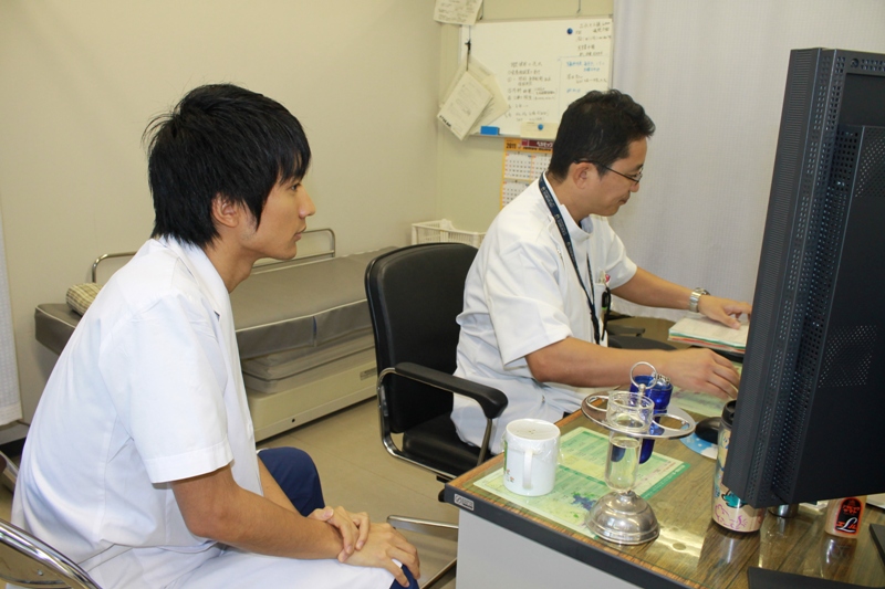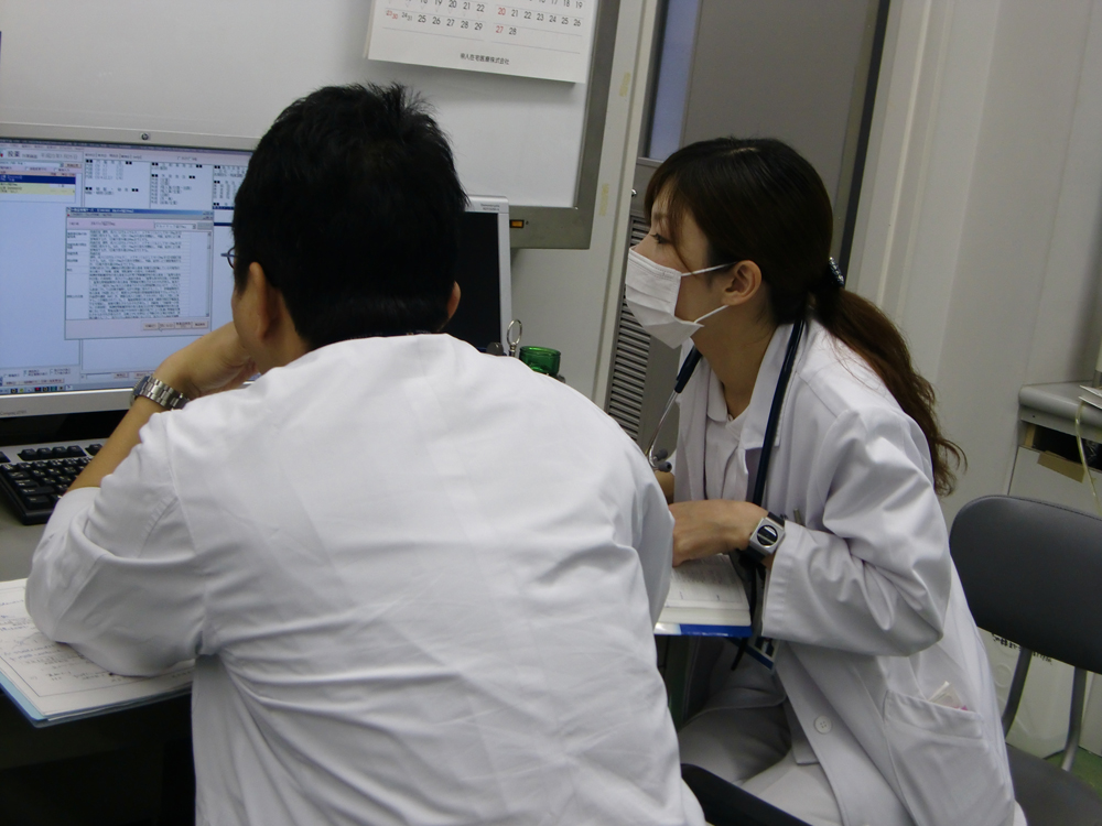 新患外来実習中指導役のドクターがマンツーマンで指導します。研修医と指導医師がディスカッションしながら診察を進めていきます。
