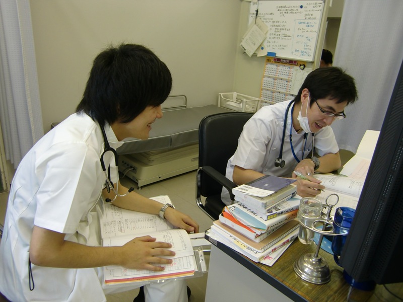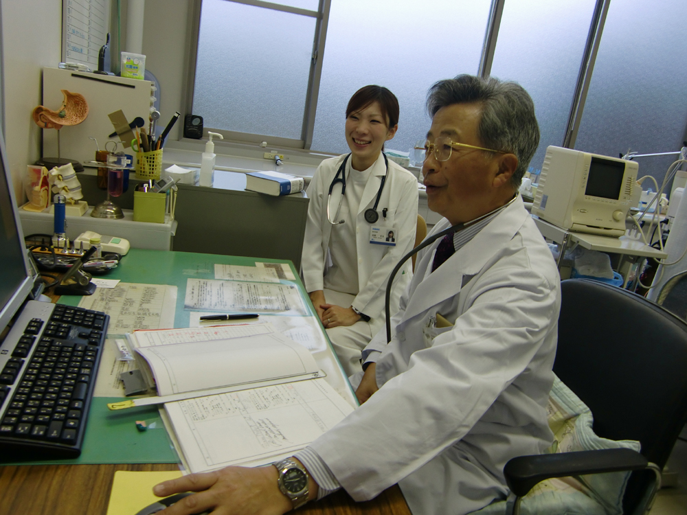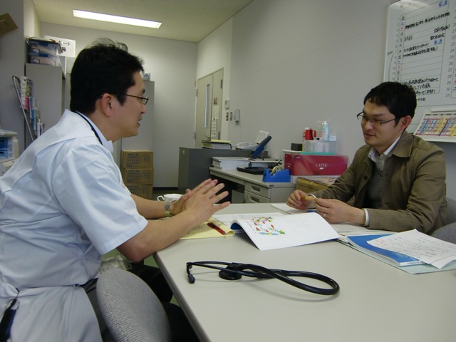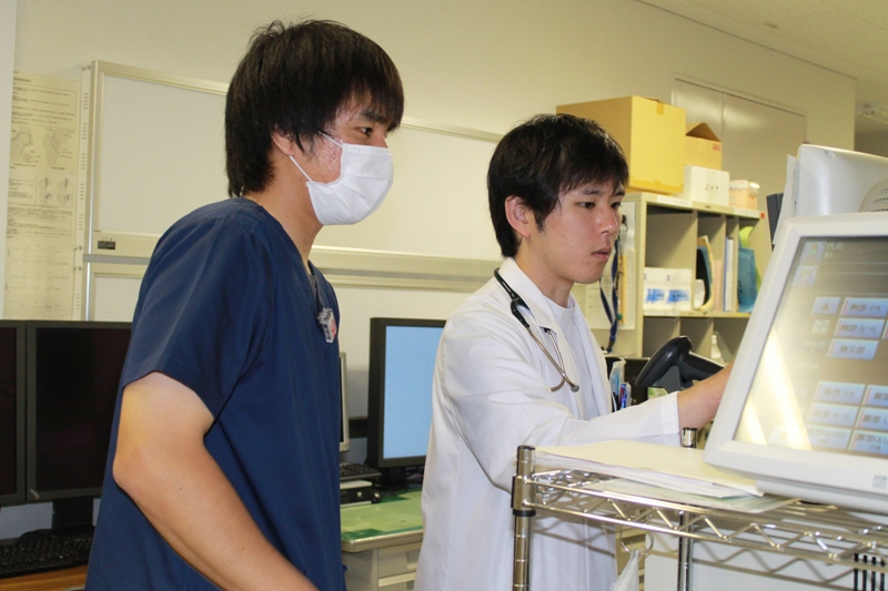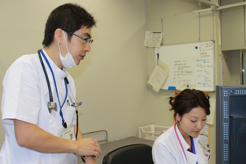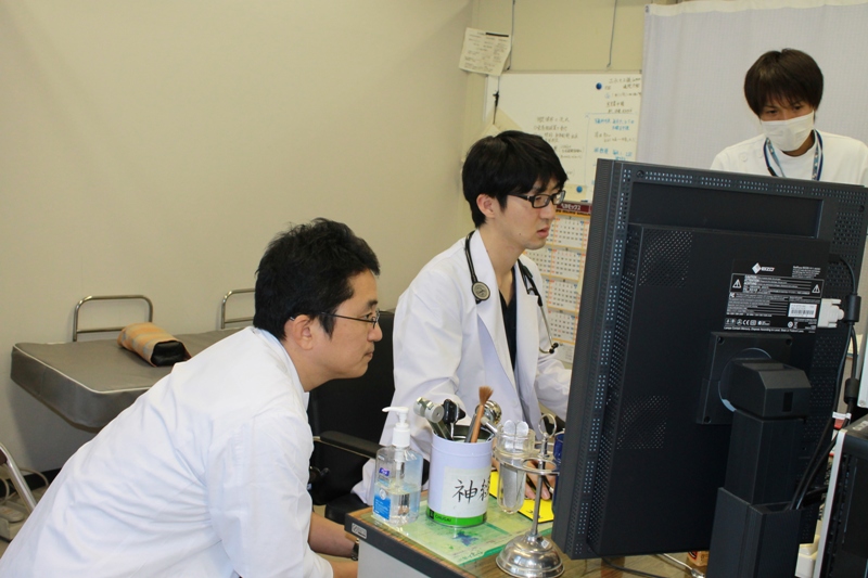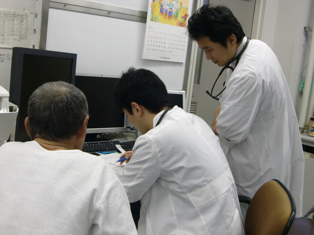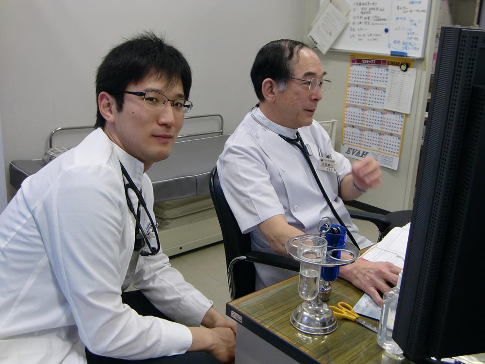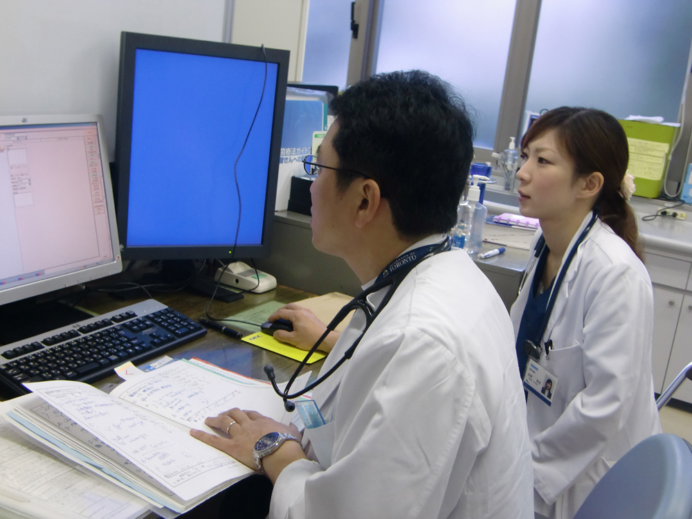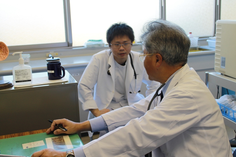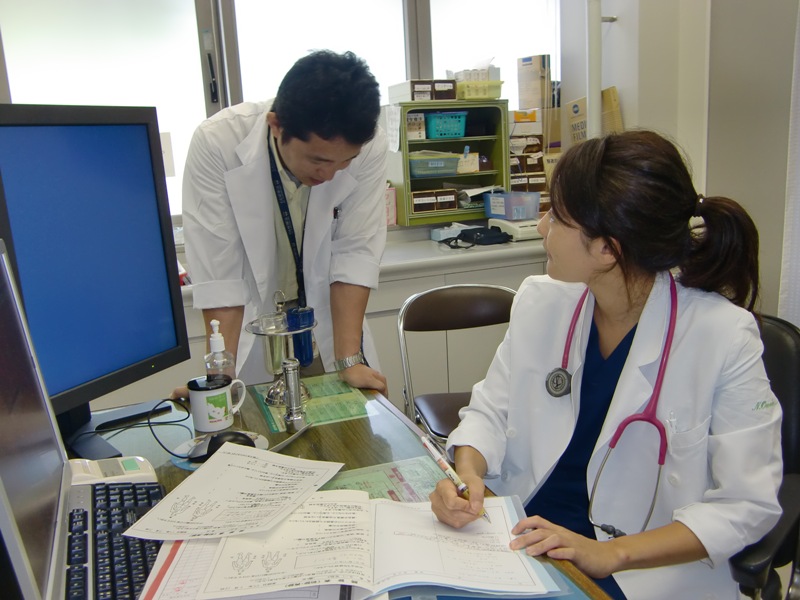新患外来実習中指導役のドクターがマンツーマンで指導します。研修医と指導医師がディスカッションしながら診察を進めていきます。