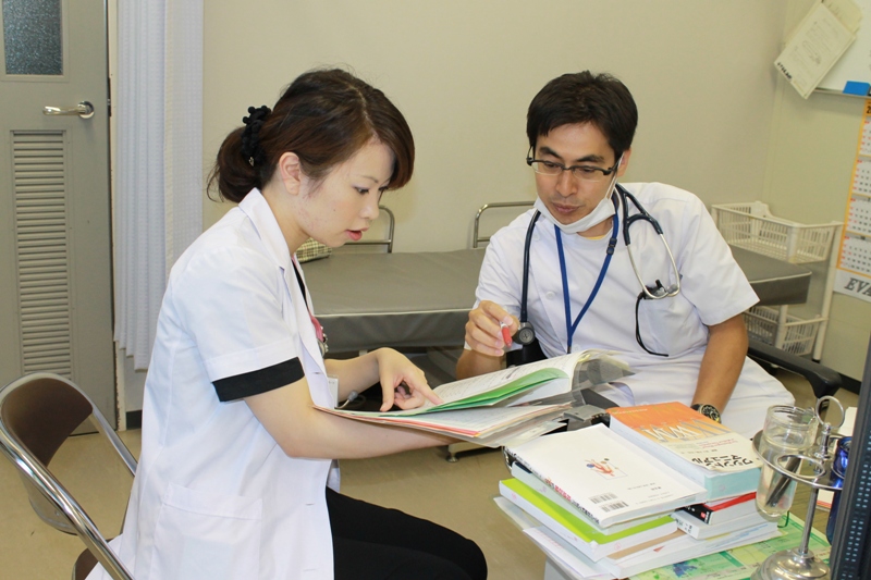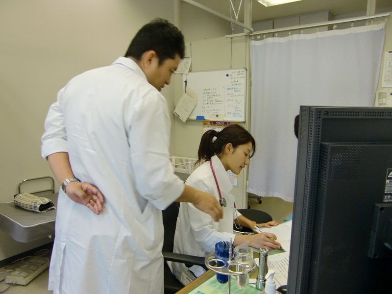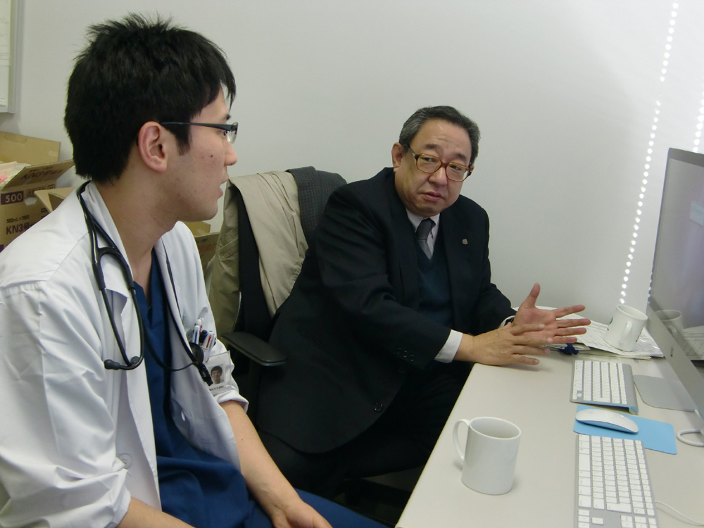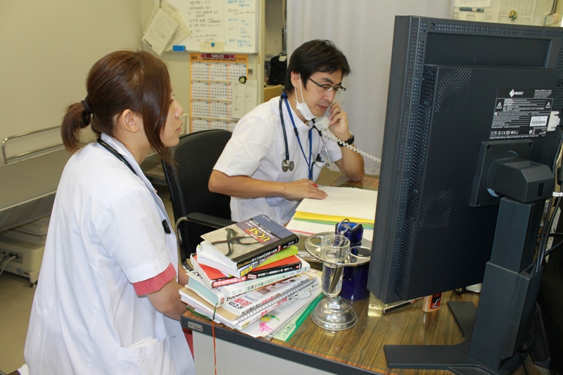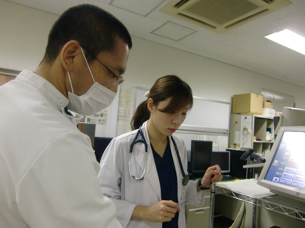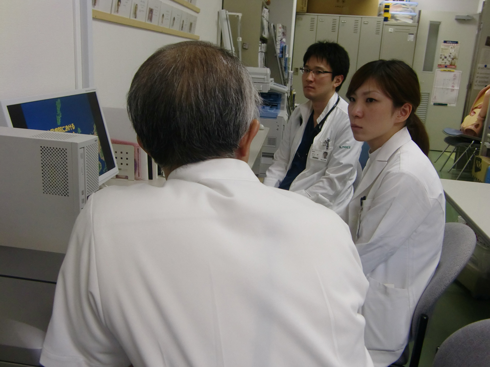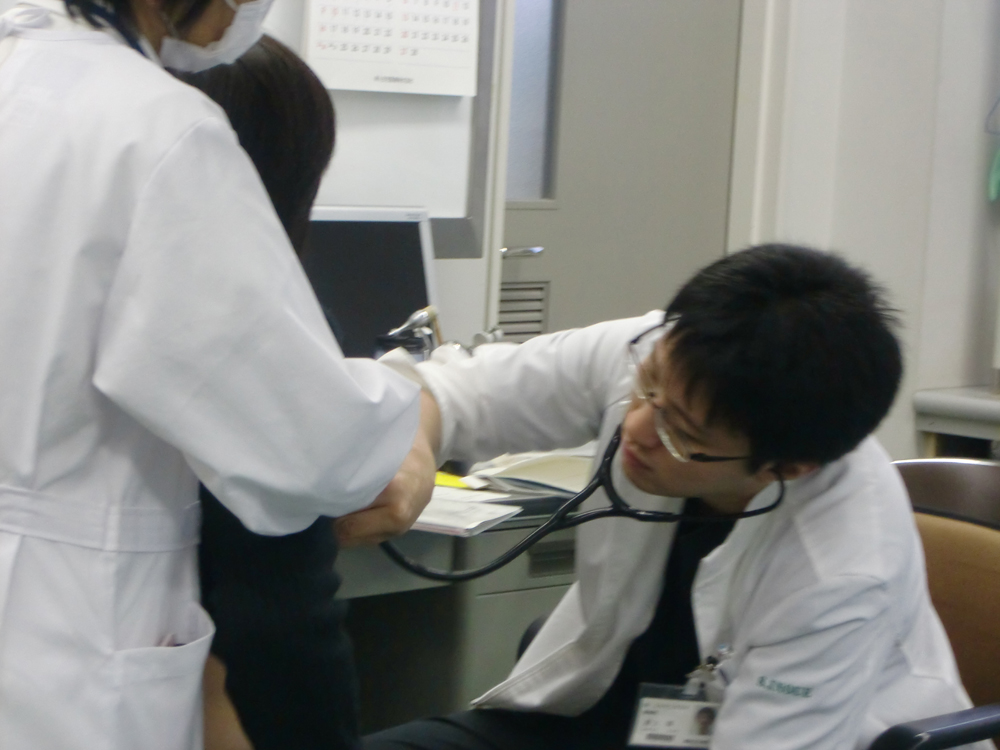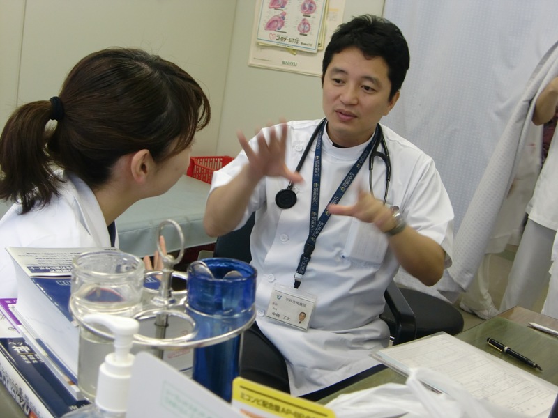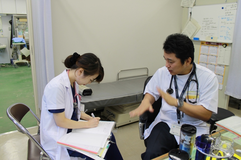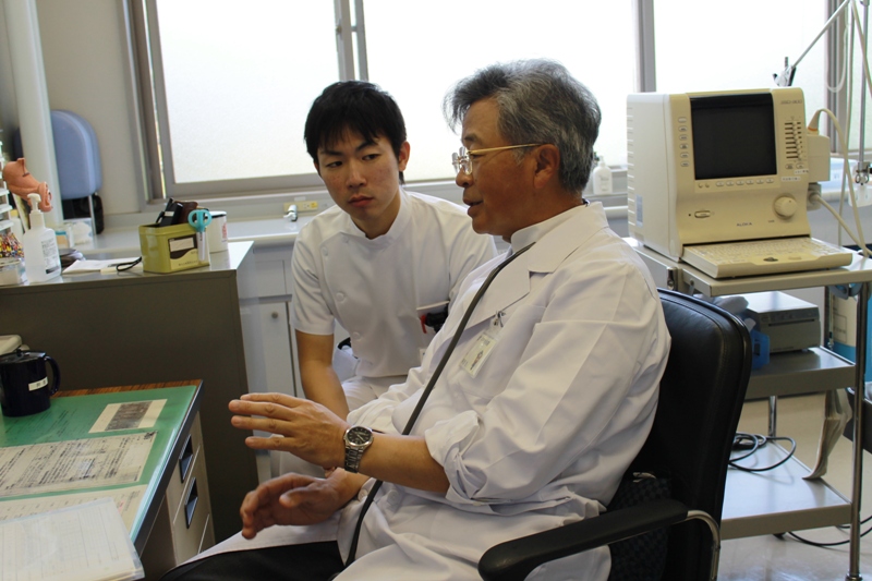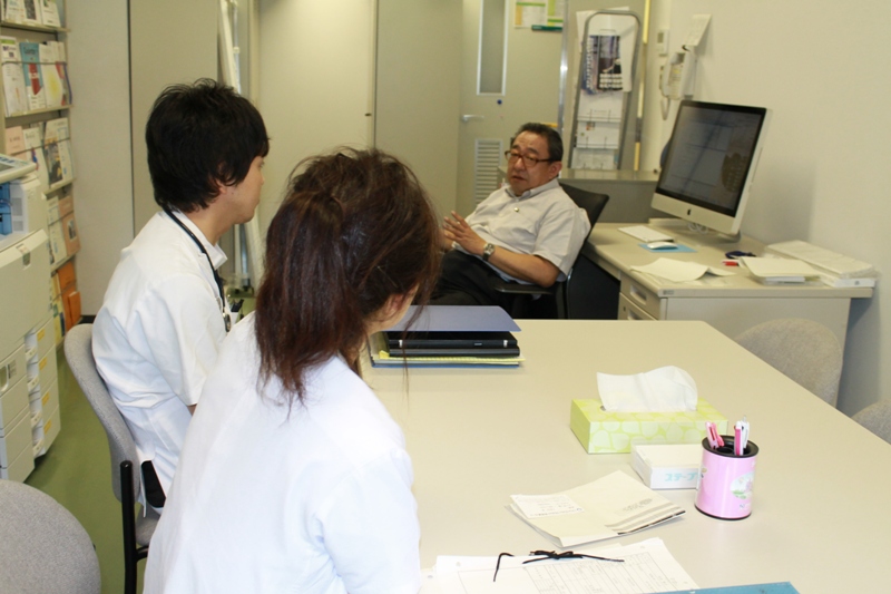 新患外来実習中指導役のドクターがマンツーマンで指導します。研修医と指導医師がディスカッションしながら診察を進めていきます。