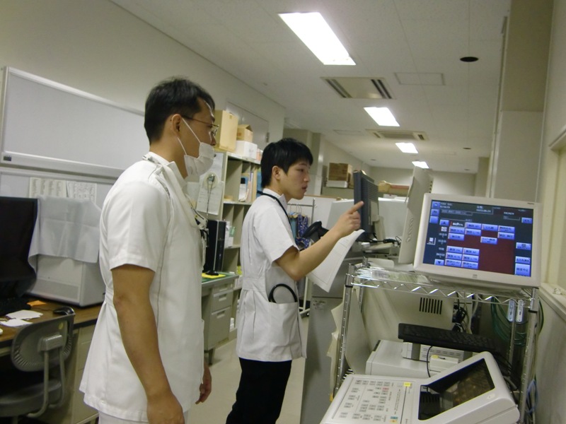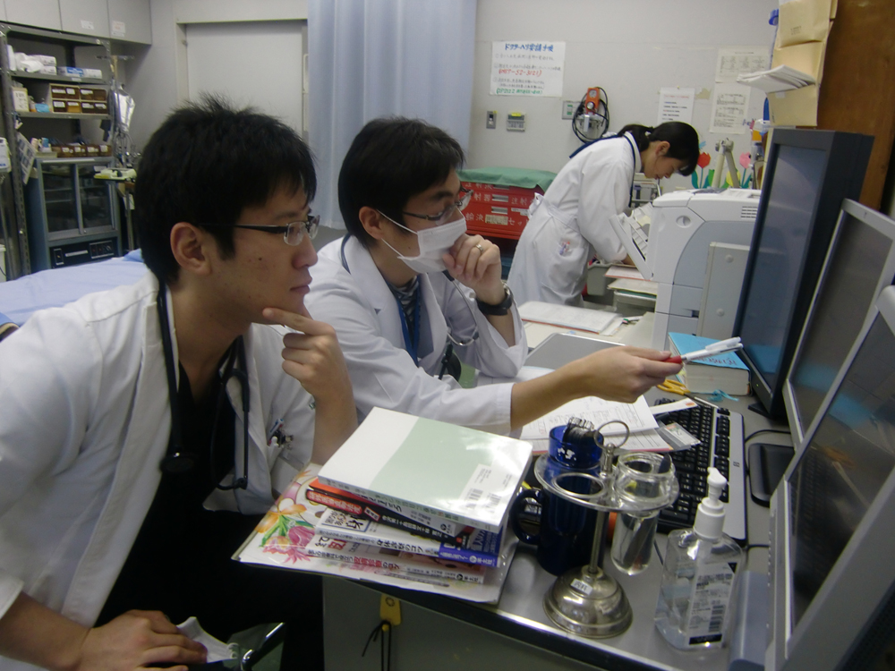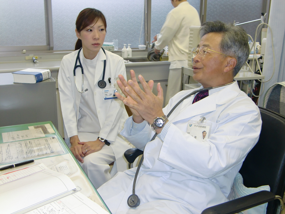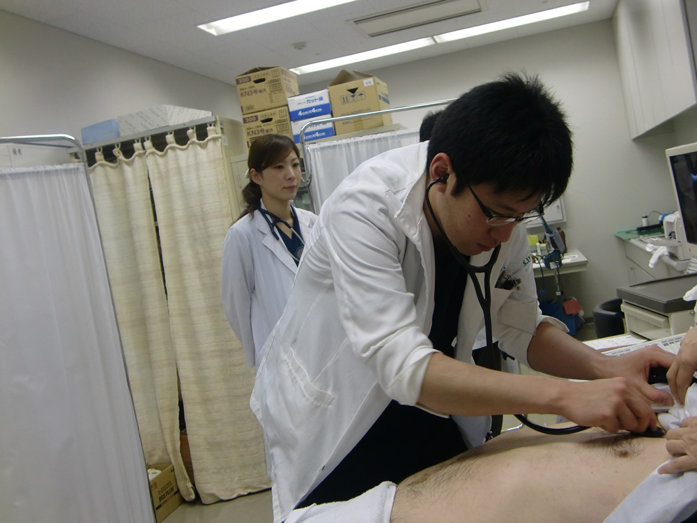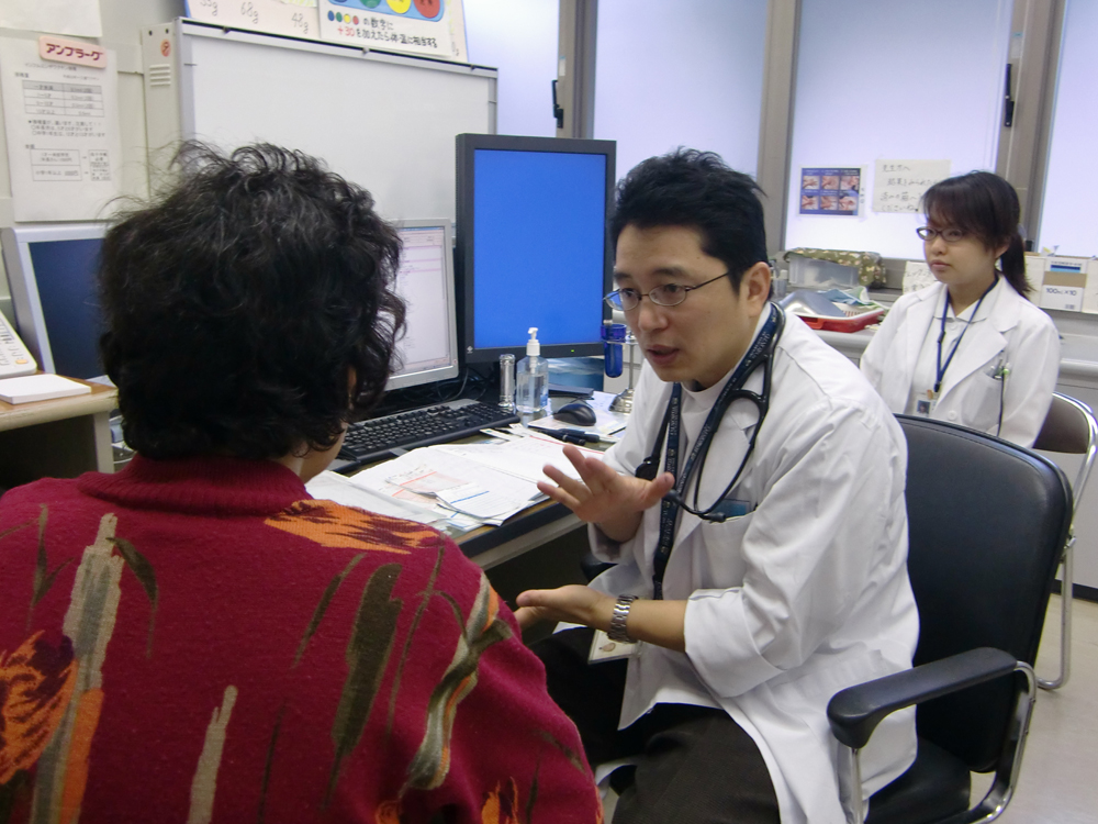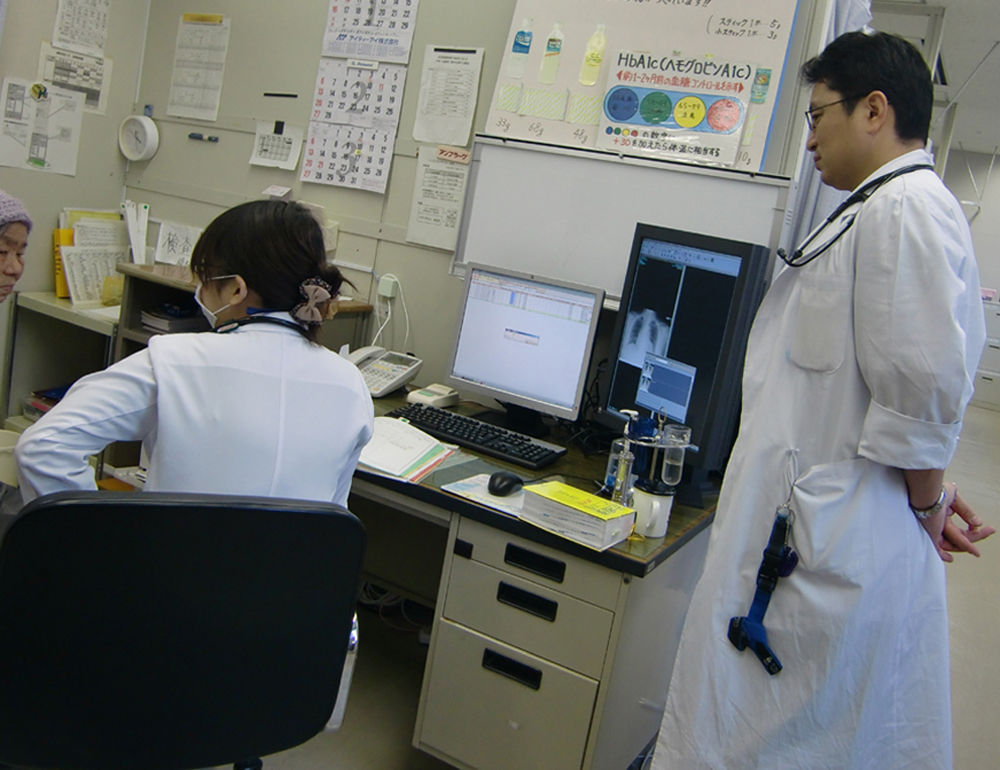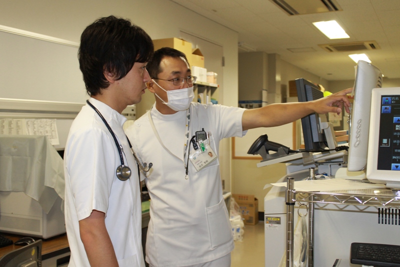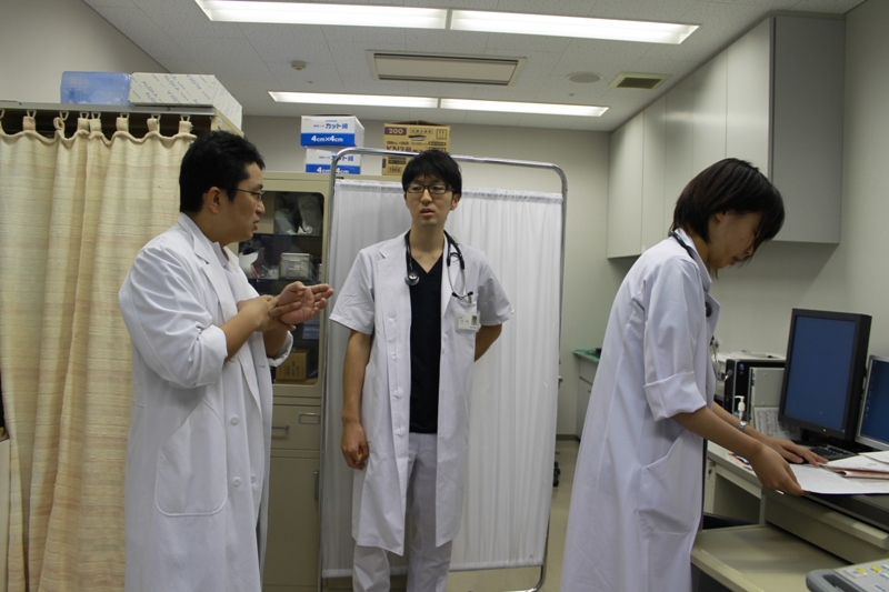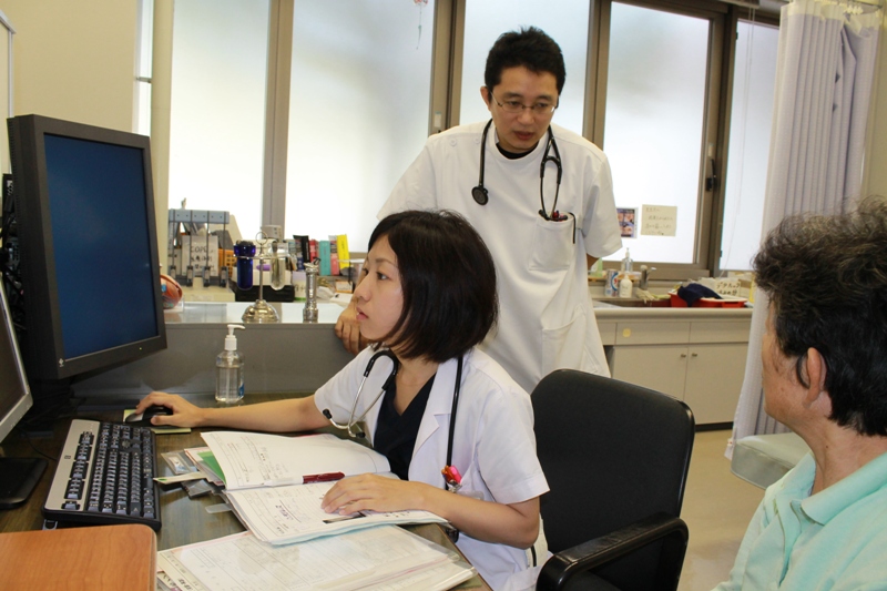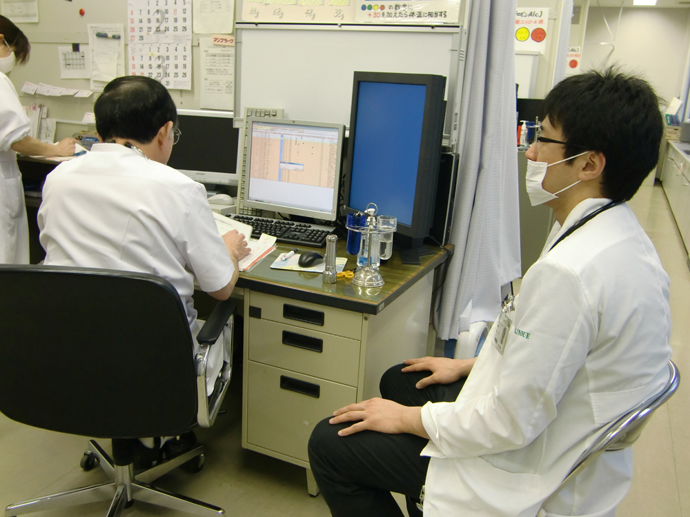 新患外来実習中指導役のドクターがマンツーマンで指導します。研修医と指導医師がディスカッションしながら診察を進めていきます。