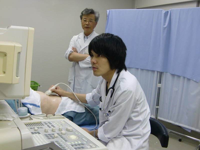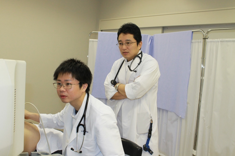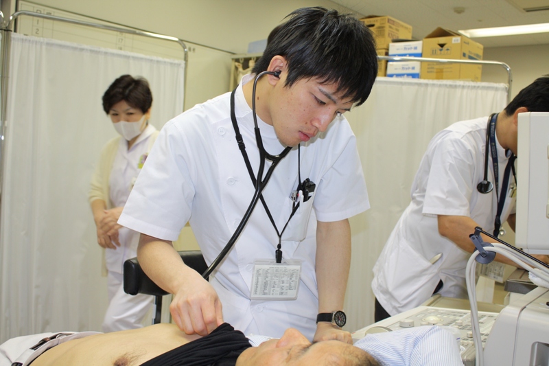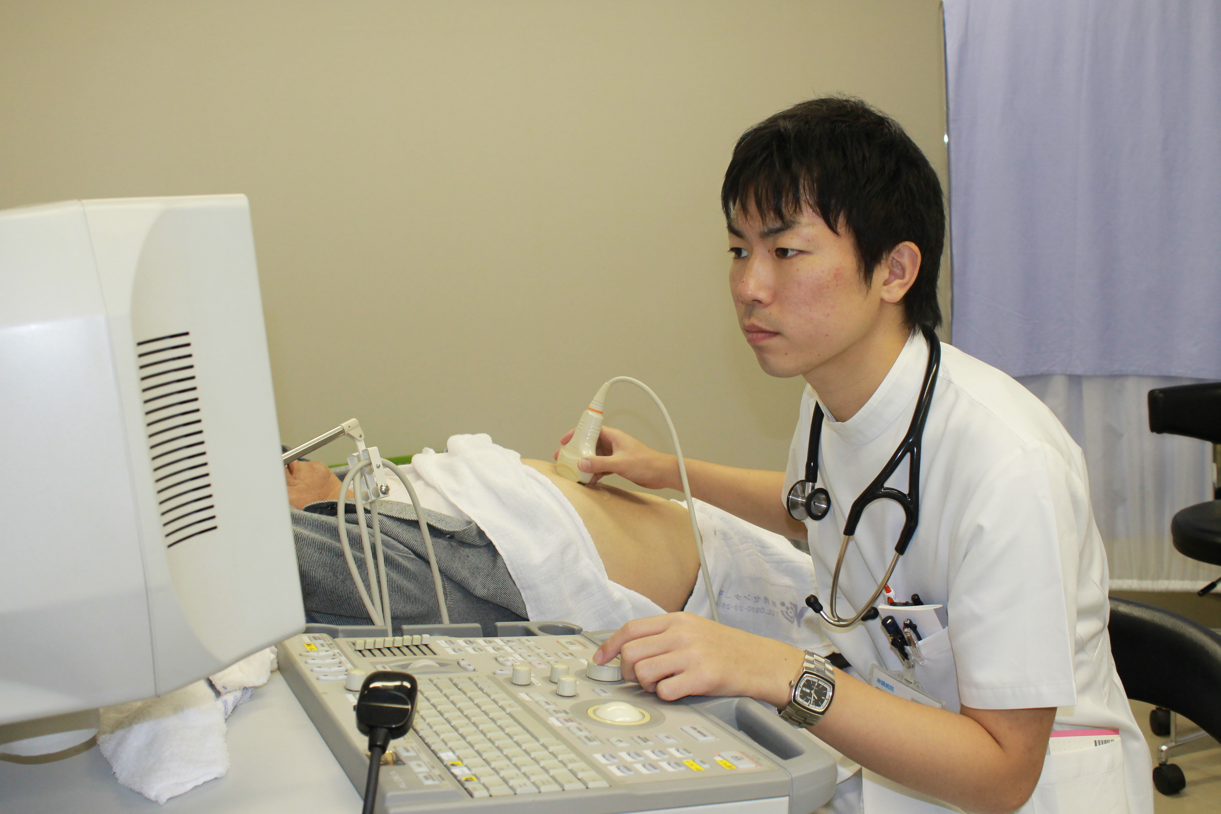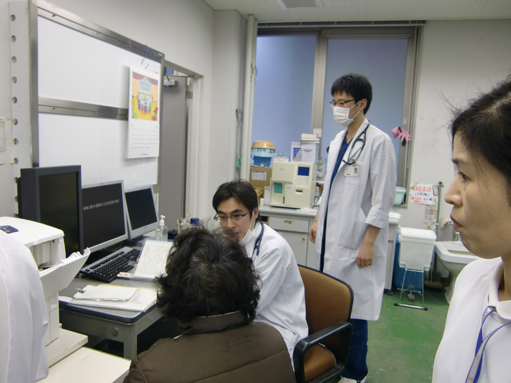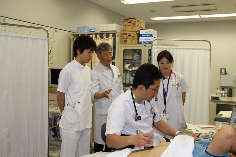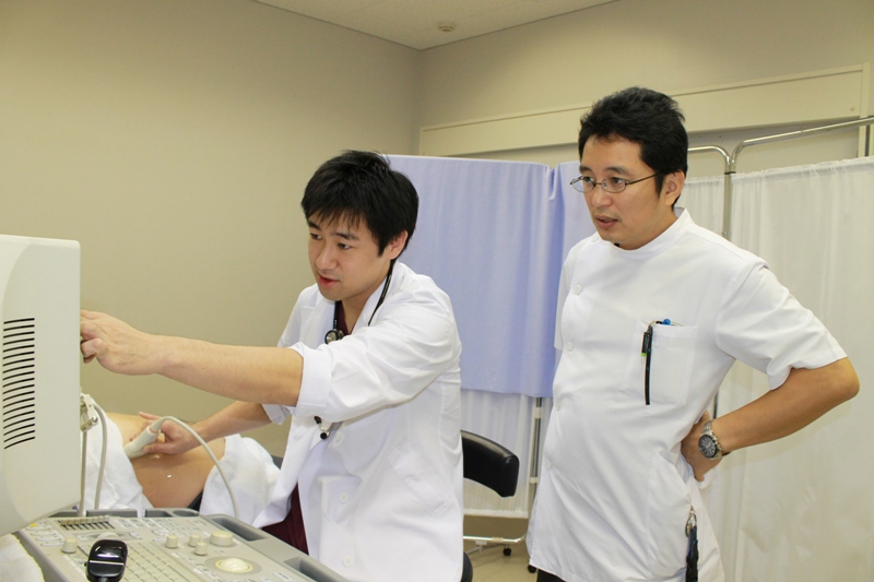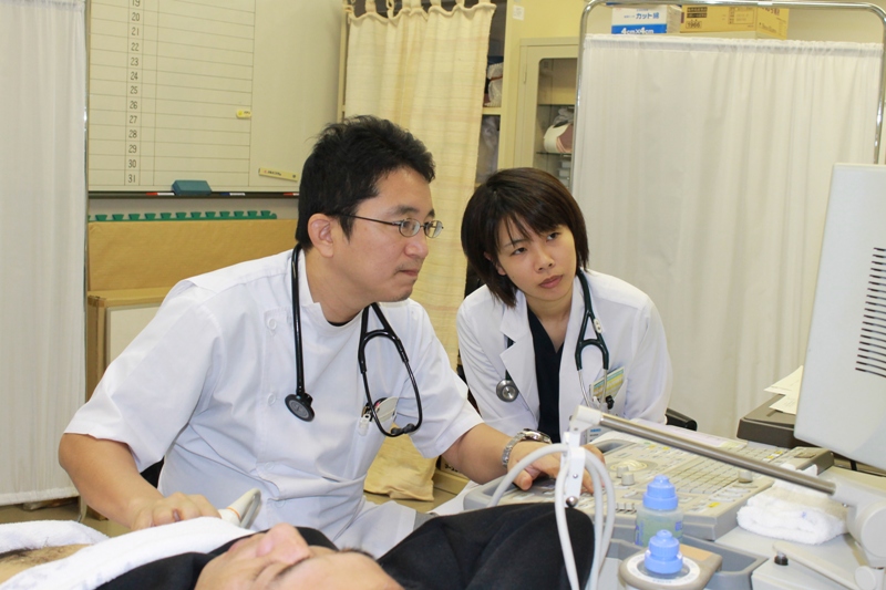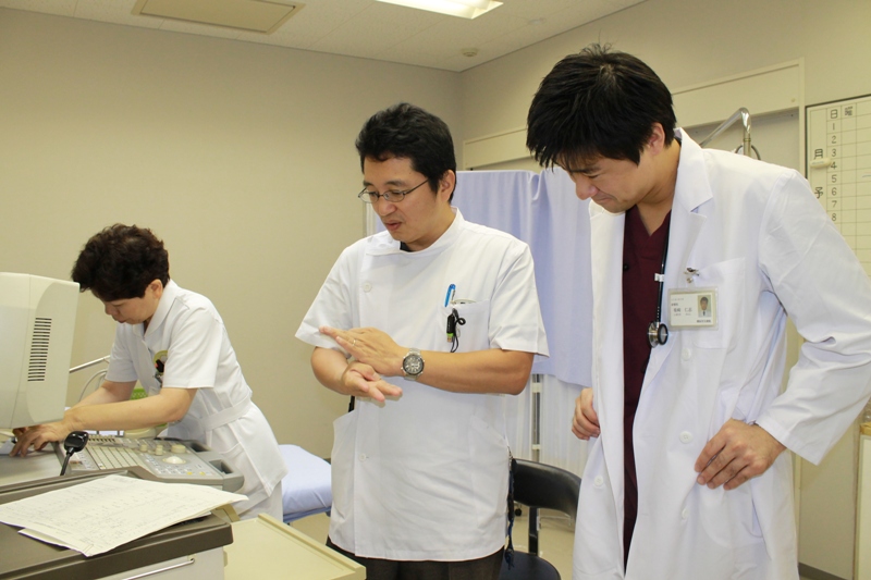 平戸市民病院に隣接している保健センターでは、地域の事業所健診を実施しています。押淵院長が、研修医と一緒に腹部エコー検査。健診で正常所見を学ぶことで、異常が発見できる眼を養います。
