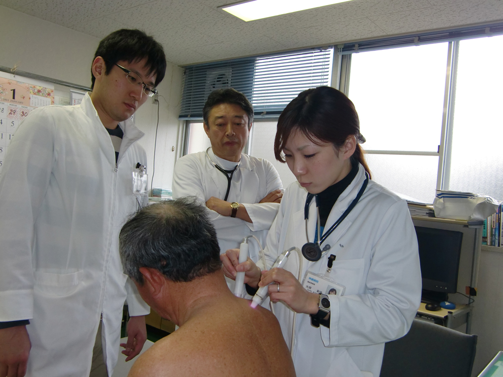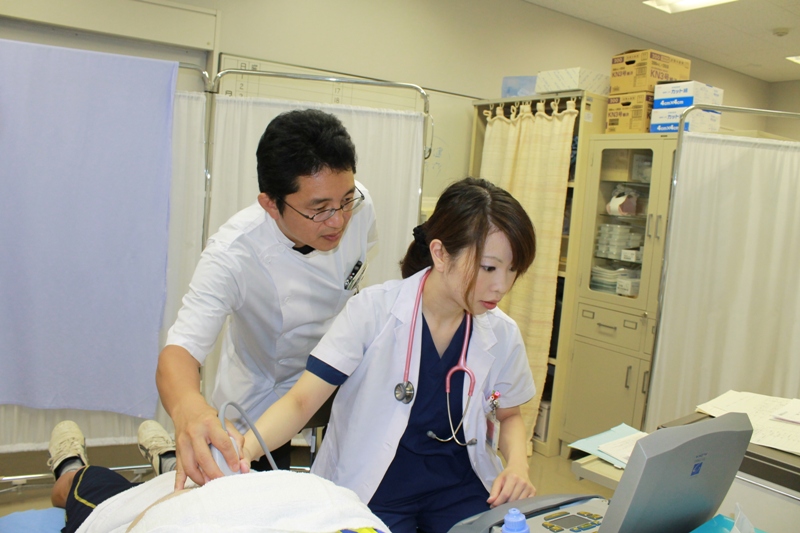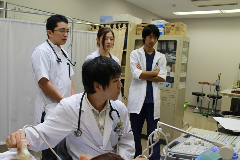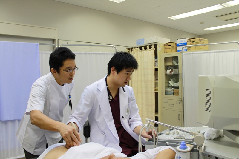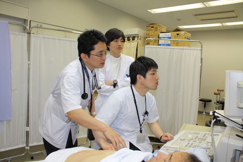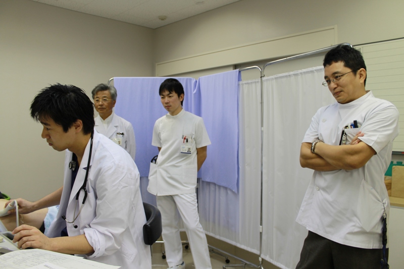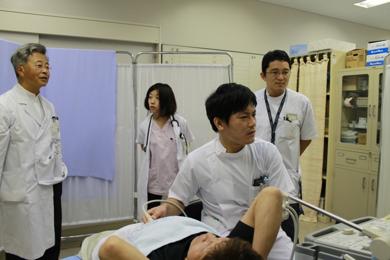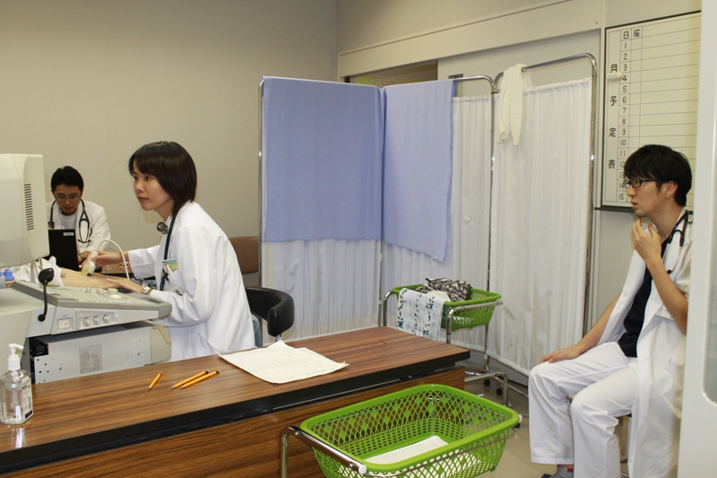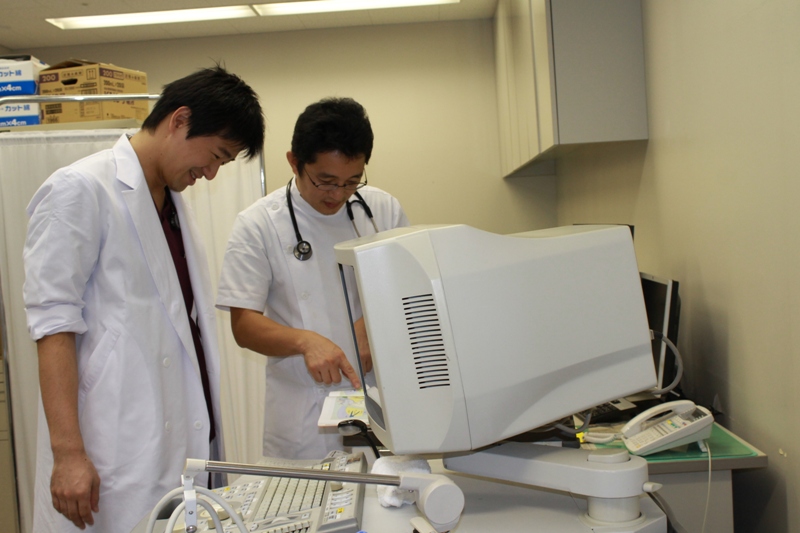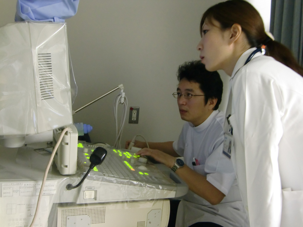 平戸市民病院に隣接している保健センターでは、地域の事業所健診を実施しています。押淵院長が、研修医と一緒に腹部エコー検査。健診で正常所見を学ぶことで、異常が発見できる眼を養います。