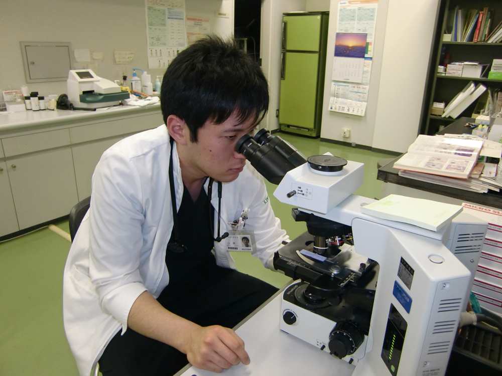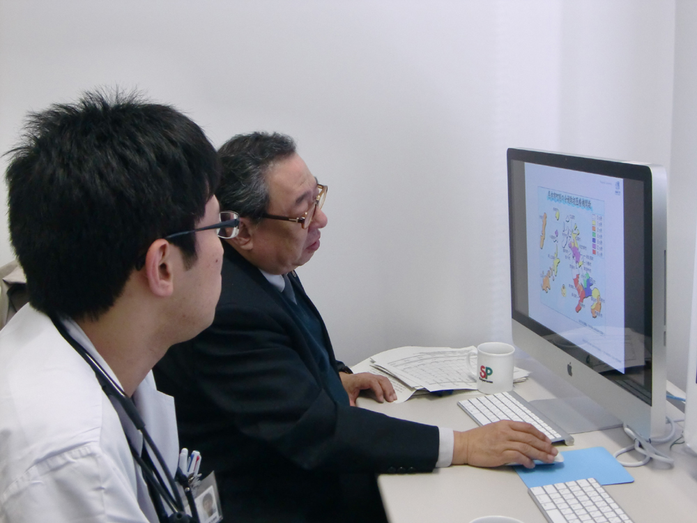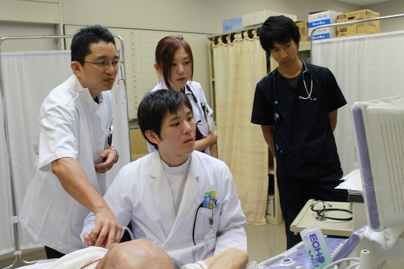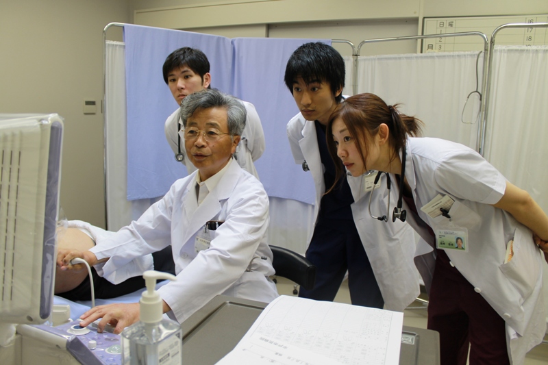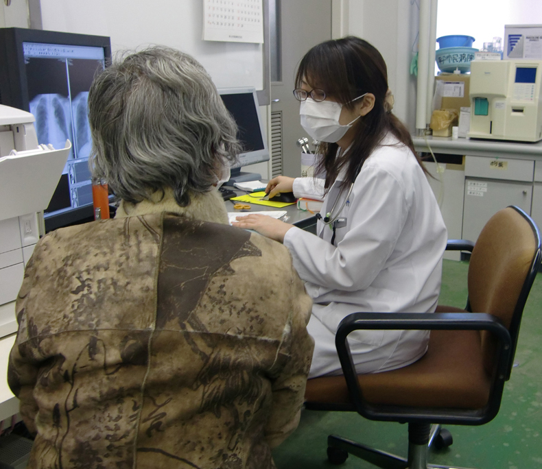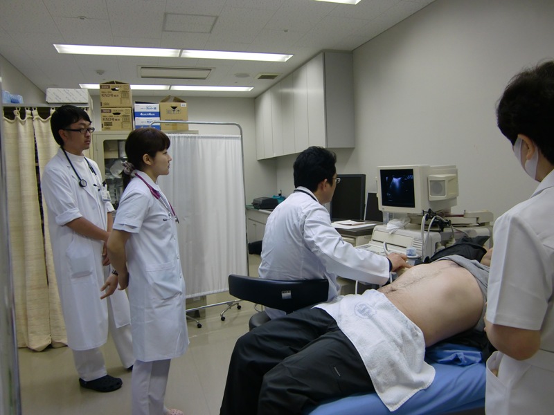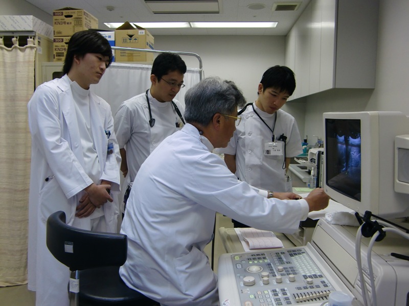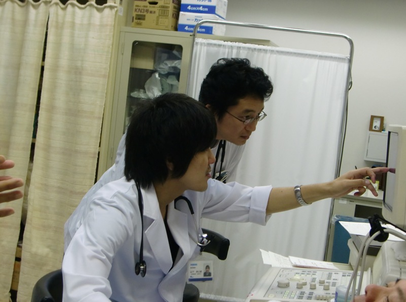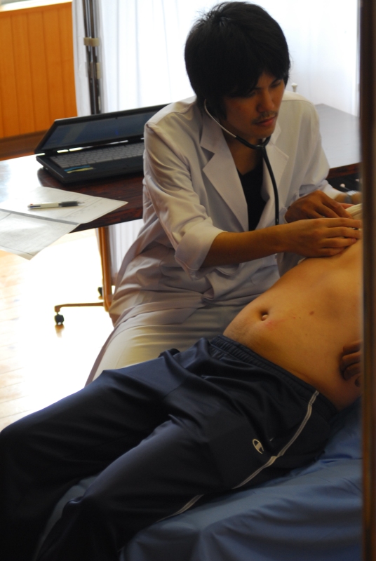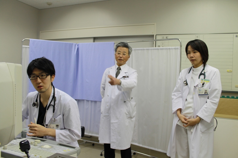 平戸市民病院に隣接している保健センターでは、地域の事業所健診を実施しています。押淵院長が、研修医と一緒に腹部エコー検査。健診で正常所見を学ぶことで、異常が発見できる眼を養います。