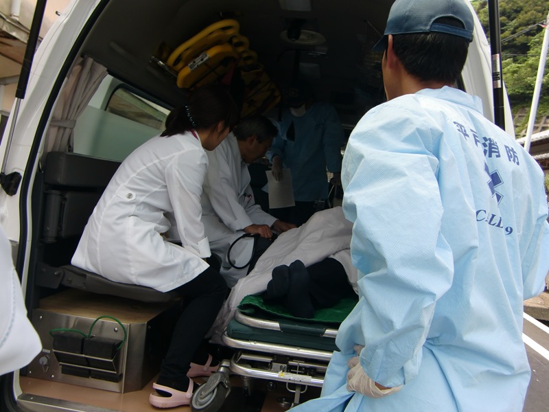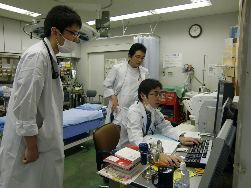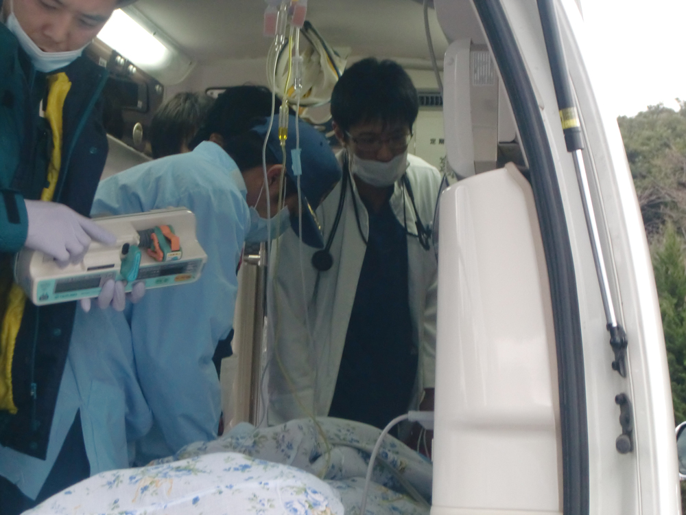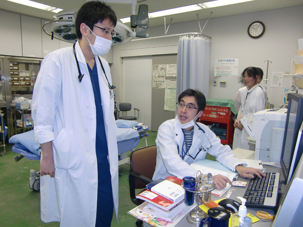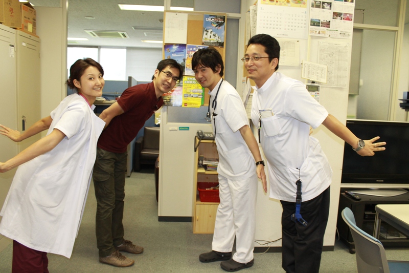 横浜労災病院より、井上先生が地域医療研修に来られました。患者さんの親族の方に高橋先生が病状説明をしている様子です。この後、佐世保まで救急搬送に同行されました。井上先生は、医療における情報技術の応用について、来年より大学院で研究をされるようです。平戸の研修では地域医療、在宅医療の現場を体験し、そこに最先端のITがどのように融合していくのかを学びたい!と抱負を語られました。なんだか、へき地に、心強い先生が来られたようです☆1ヶ月間、よろしくお願いいたします。たくしま