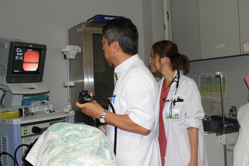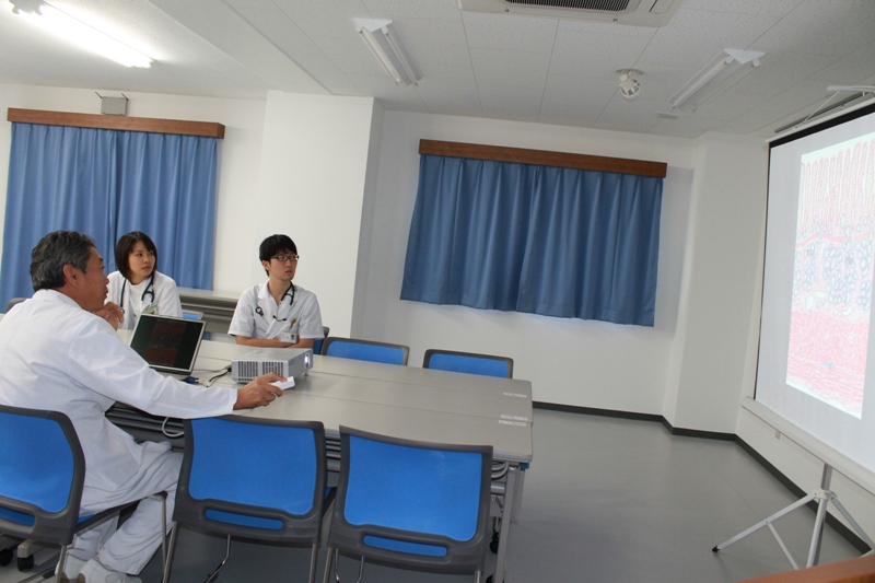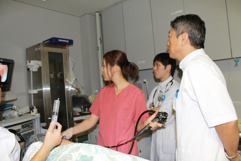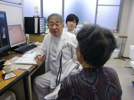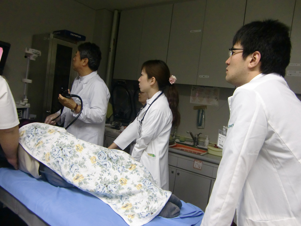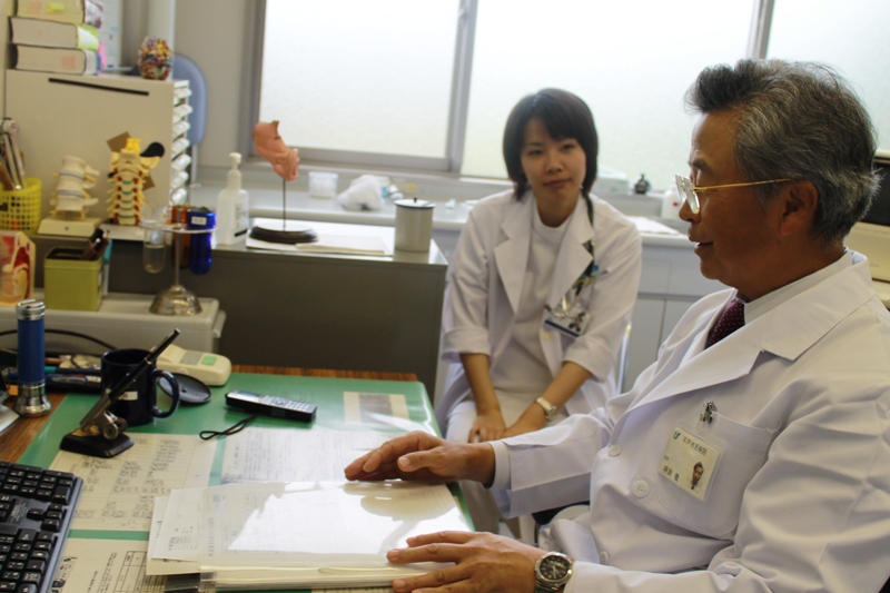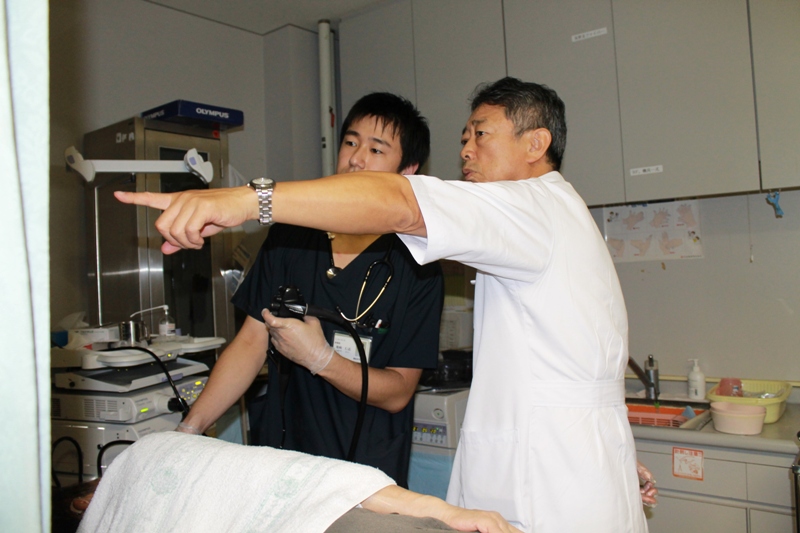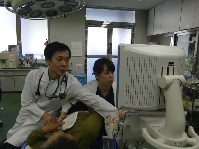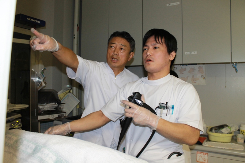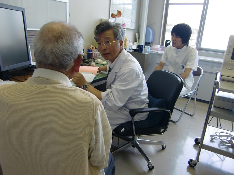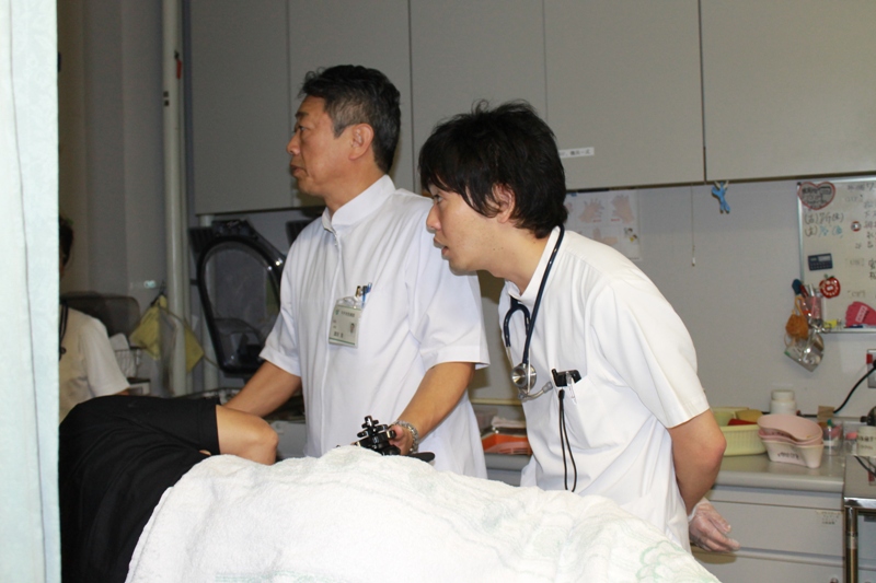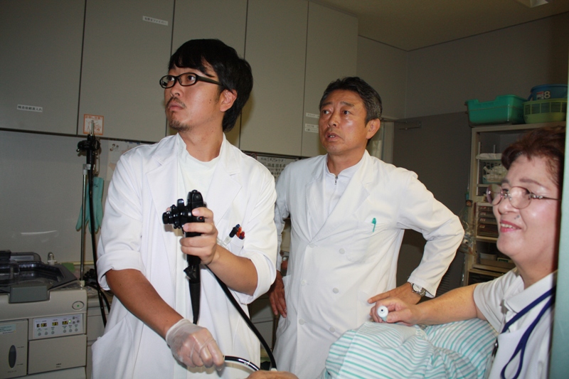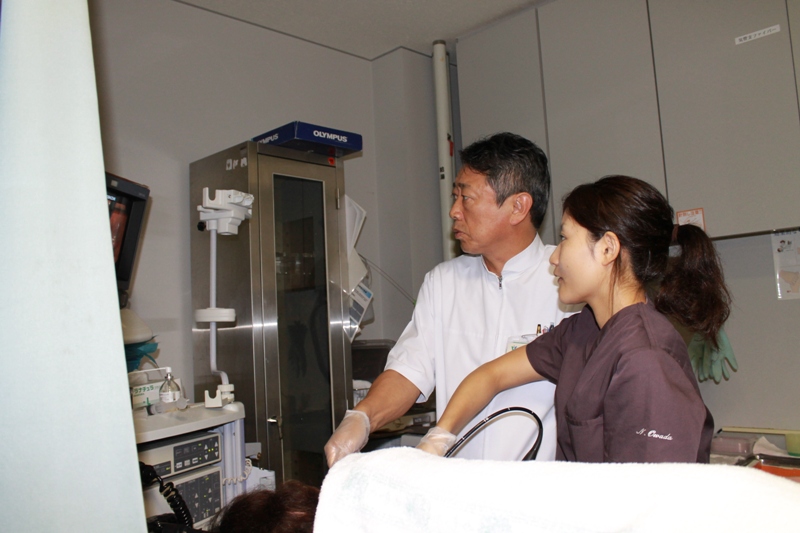 濱田先生の内視鏡検査を見学される井上先生と光岡先生の様子です。光岡先生は、患者さんの体をさすってくださっていました。検査の後、病状説明をされる濱田先生。濱田先生は、内視鏡の本をだされているほどの名医なのです。たくしま