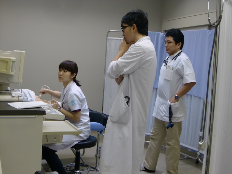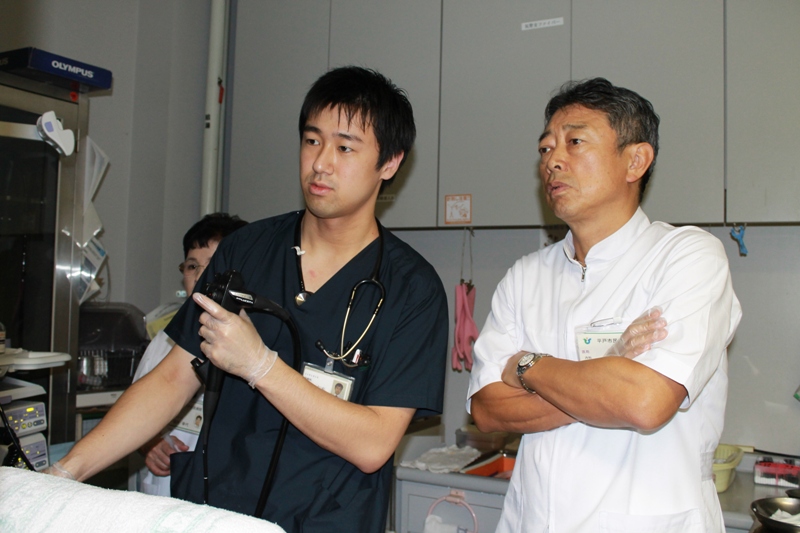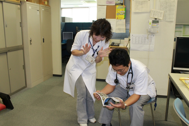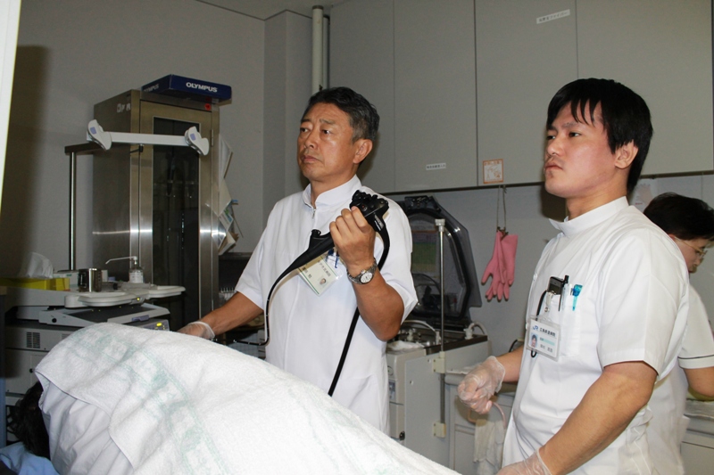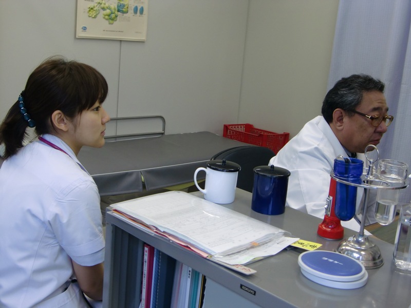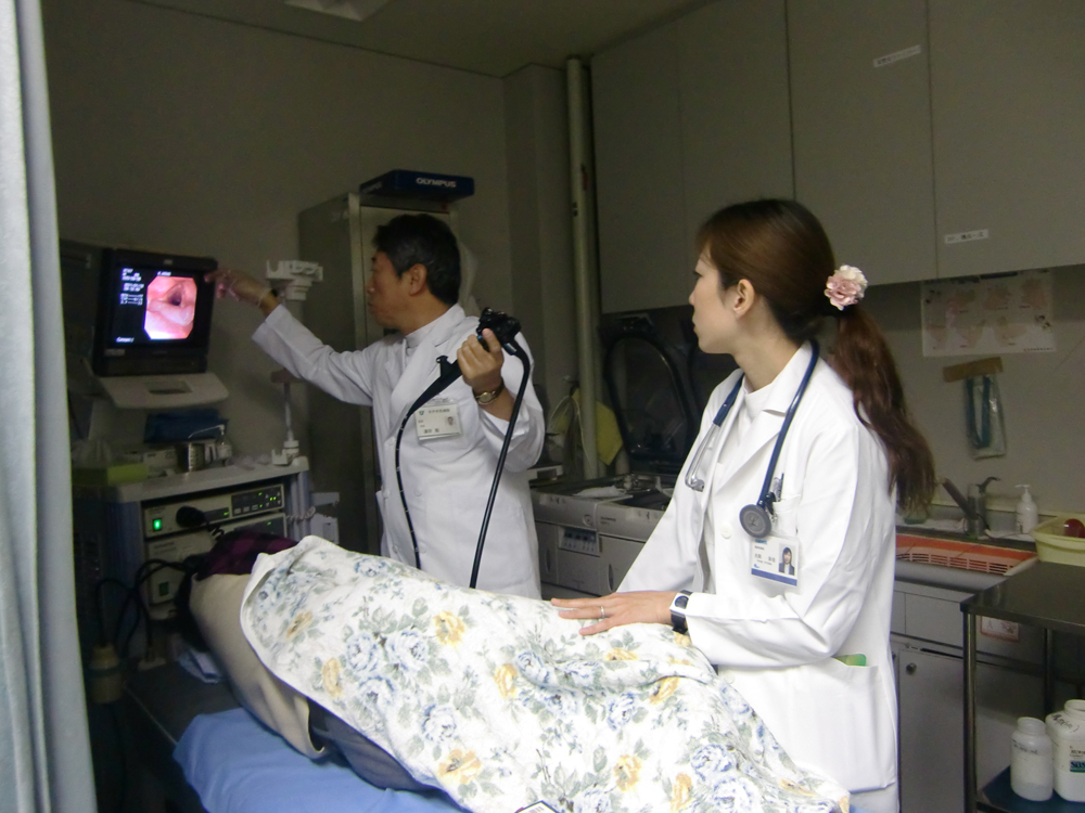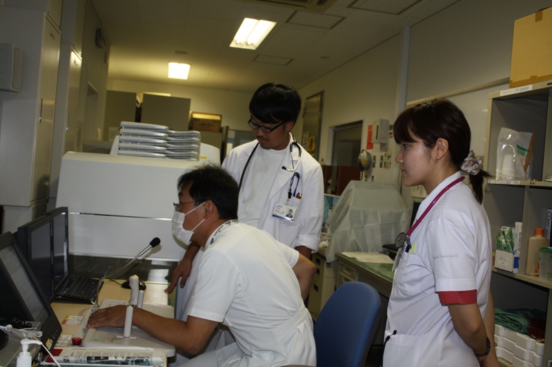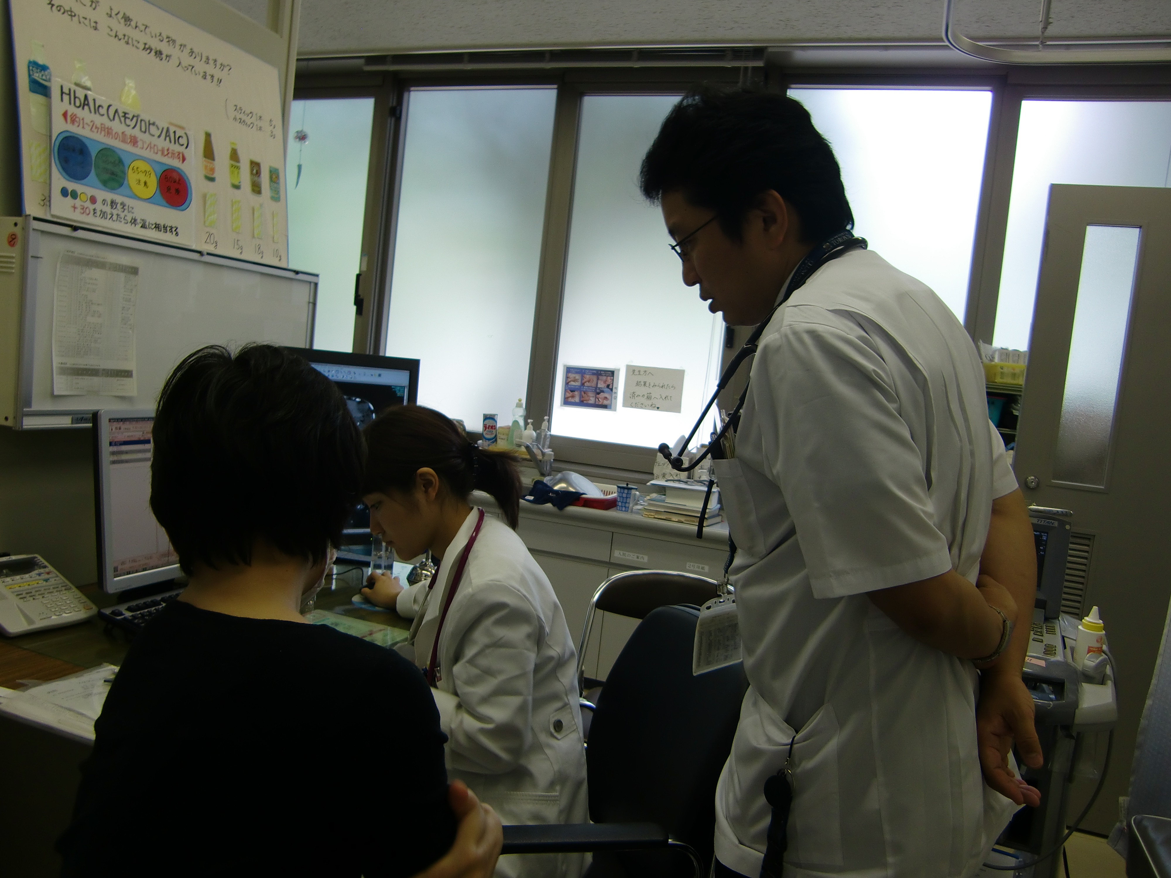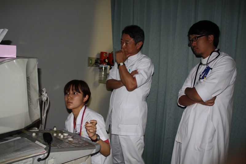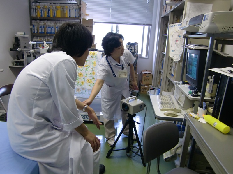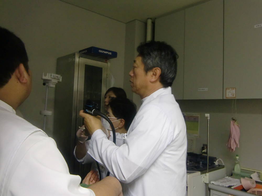 濱田先生の内視鏡検査を見学される井上先生と光岡先生の様子です。光岡先生は、患者さんの体をさすってくださっていました。検査の後、病状説明をされる濱田先生。濱田先生は、内視鏡の本をだされているほどの名医なのです。たくしま