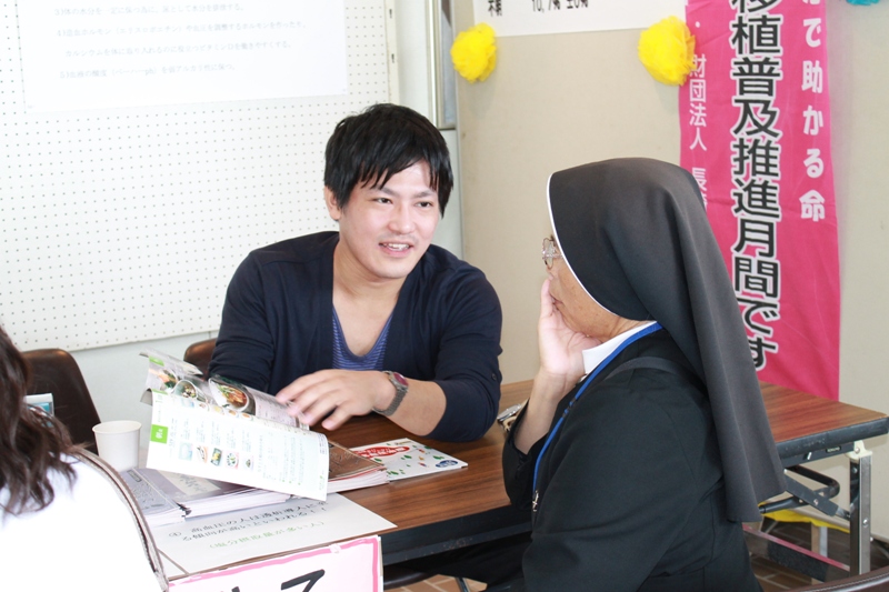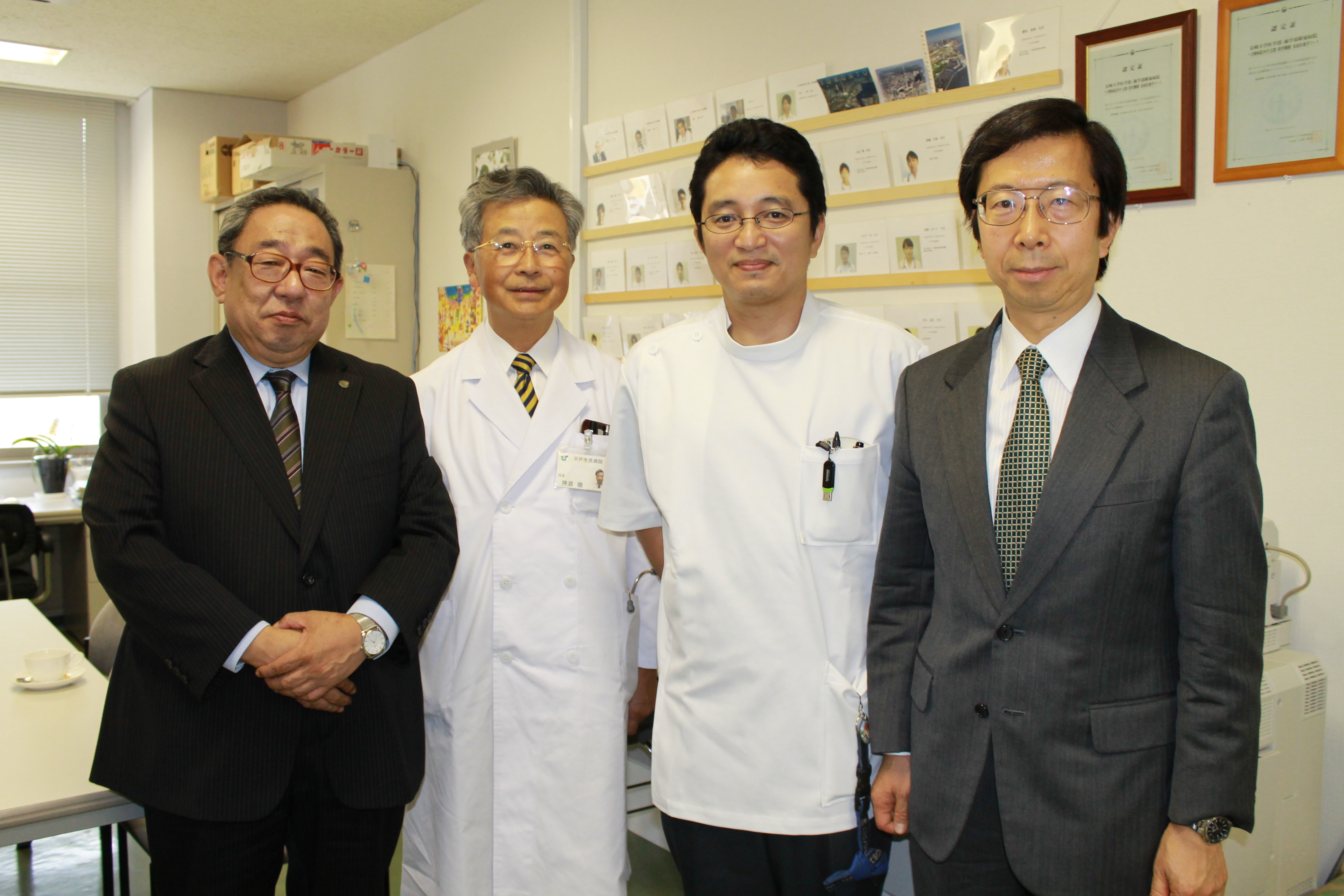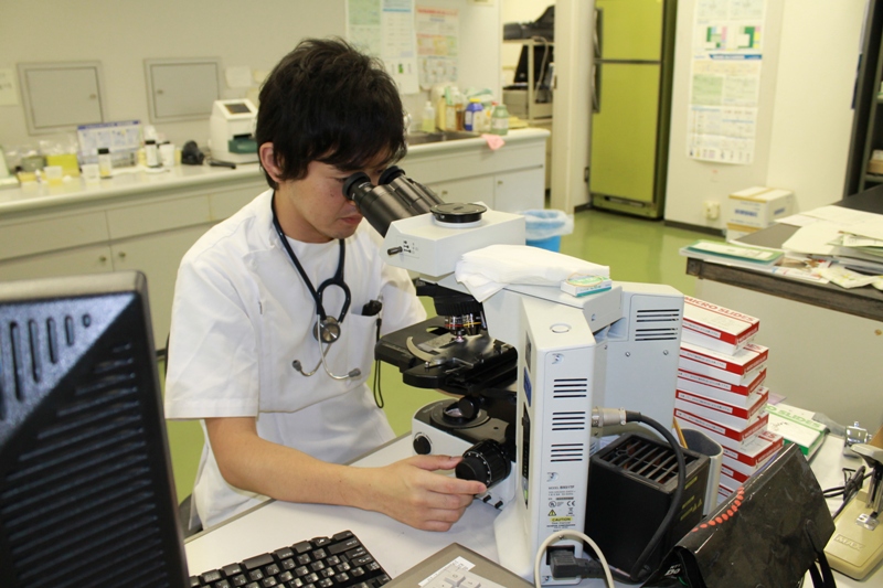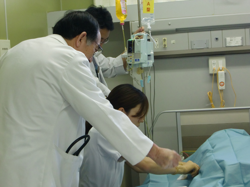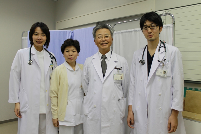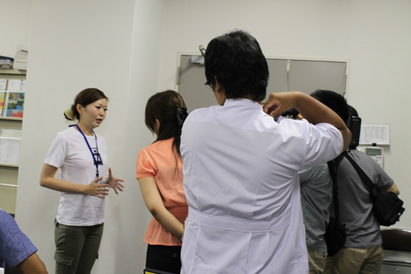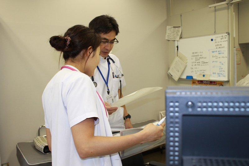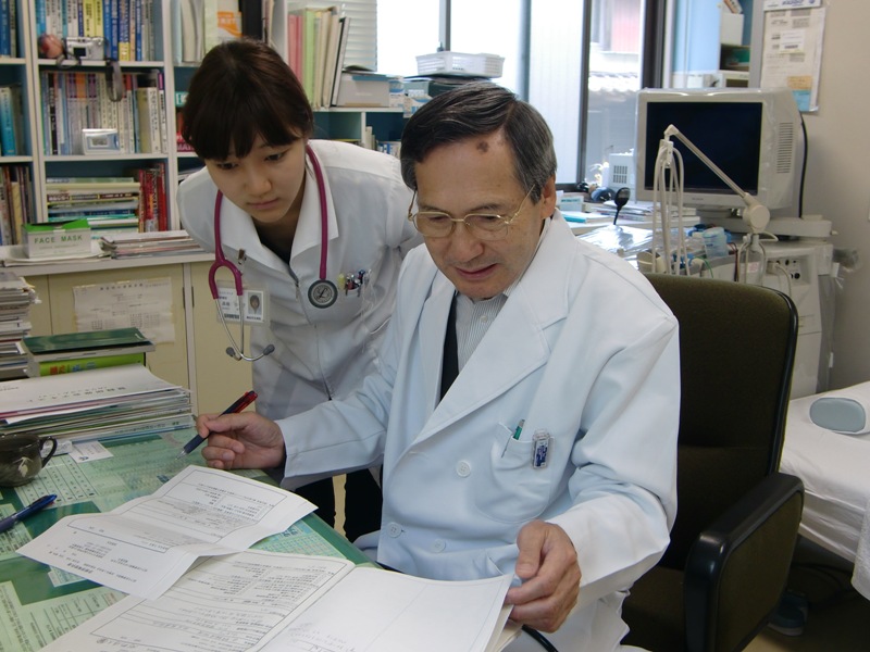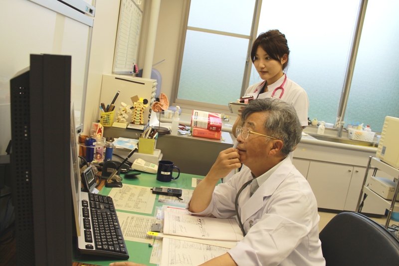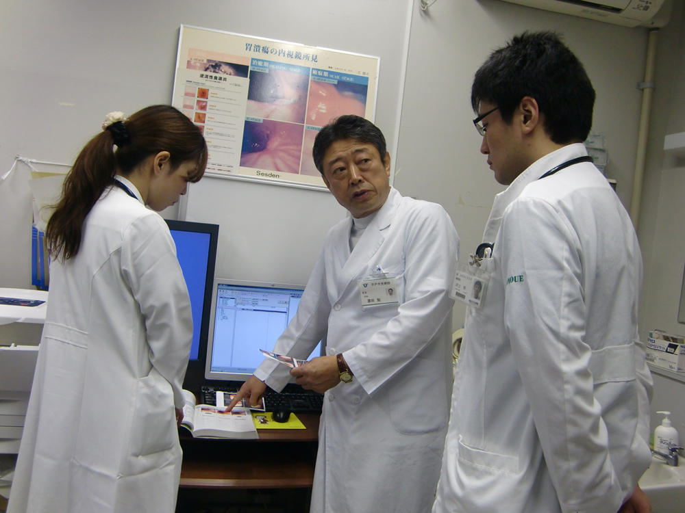 濱田先生の内視鏡検査を見学される井上先生と光岡先生の様子です。光岡先生は、患者さんの体をさすってくださっていました。検査の後、病状説明をされる濱田先生。濱田先生は、内視鏡の本をだされているほどの名医なのです。たくしま