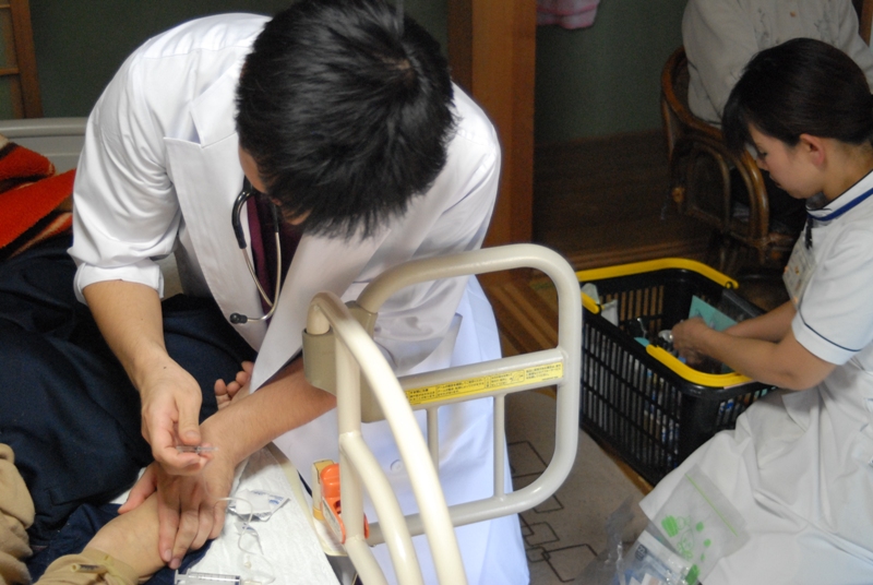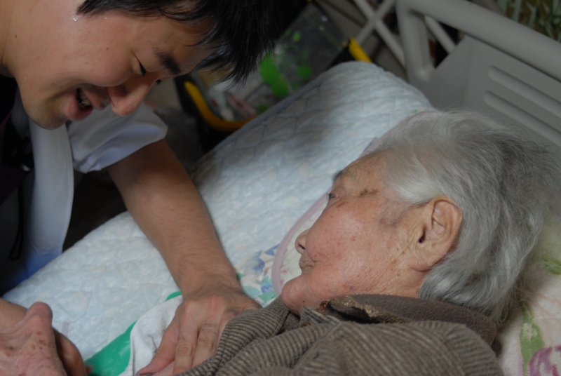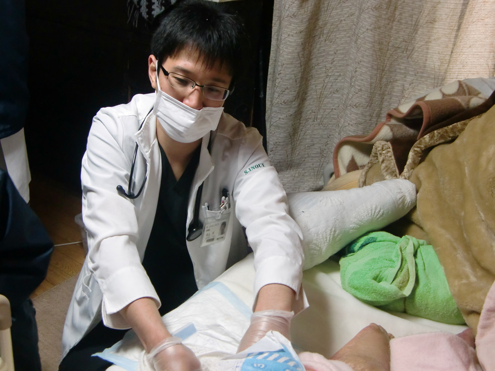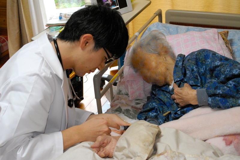 内視鏡検査の後、井上先生と光岡先生は、99歳になる患者さんのお宅へ訪問看護に行かれました。褥創の処置をされる井上先生。光岡先生は、患者さんの目の動きを気にされ、朝食時の様子など家族の方に伺っていました。井上先生は、来月で100歳になられる患者さんにお会いして、100歳まで生きたときの自分に思いを馳せていました。