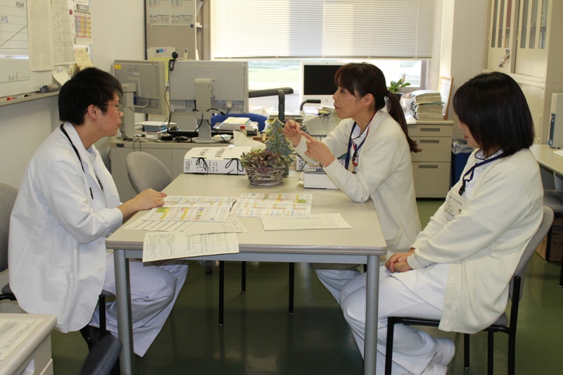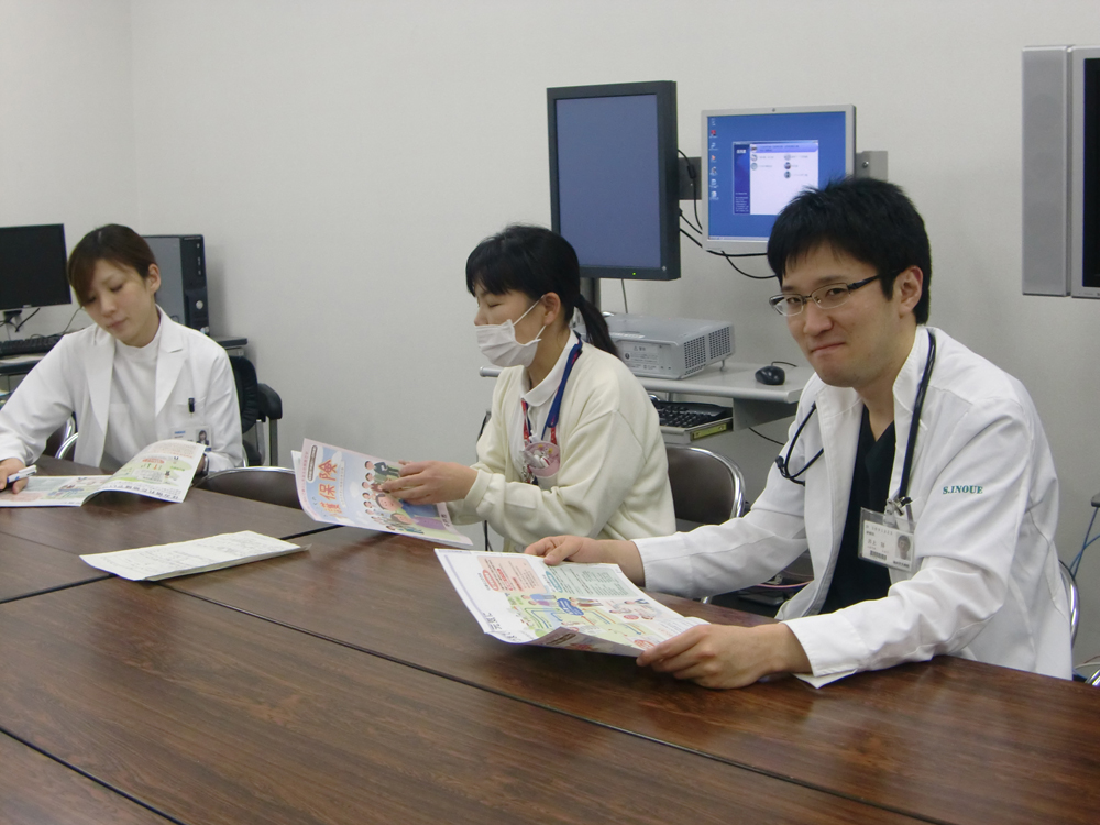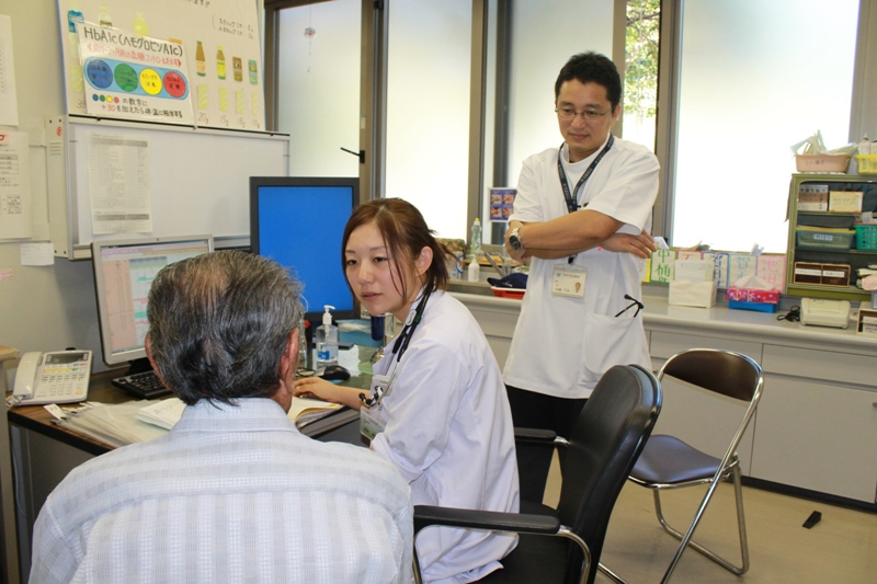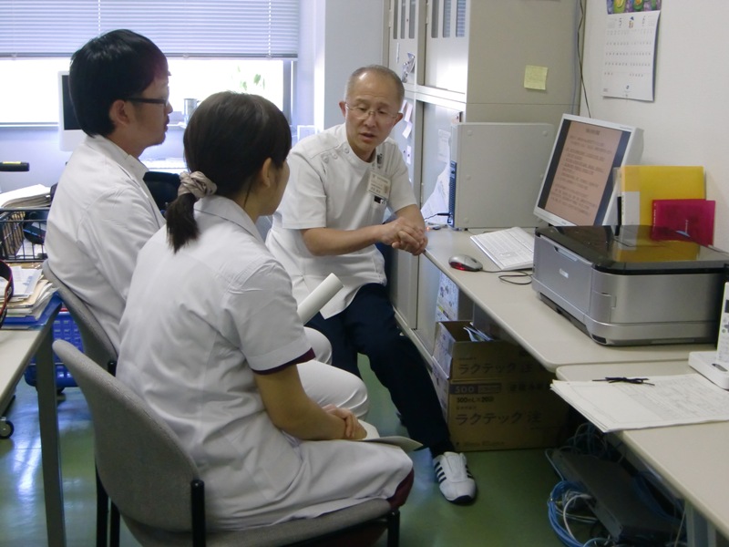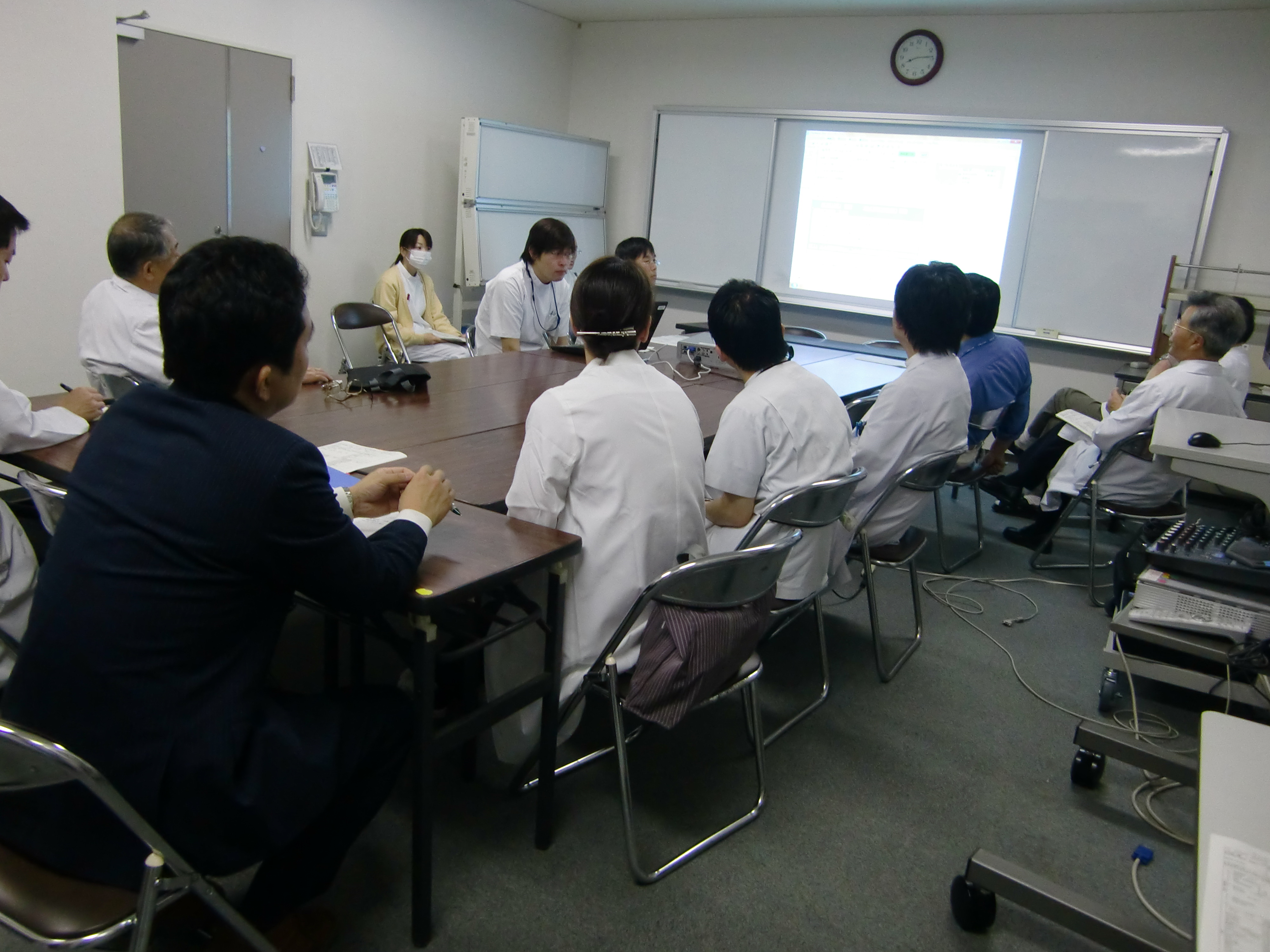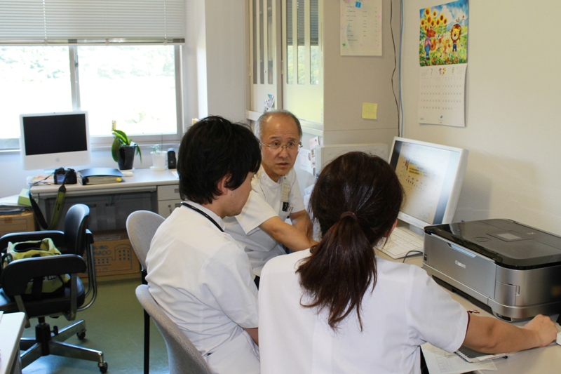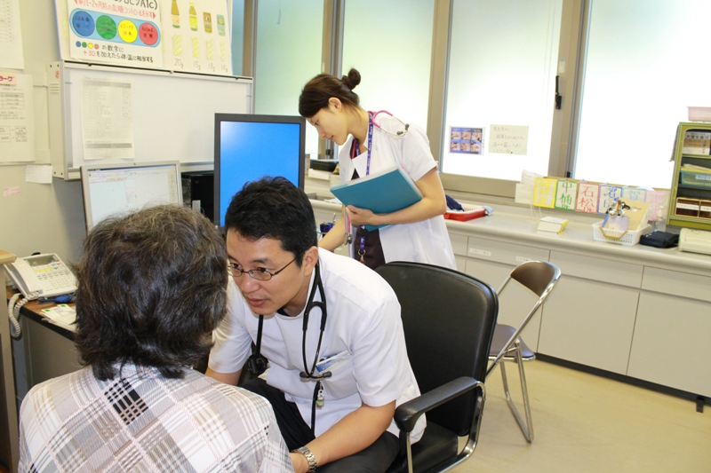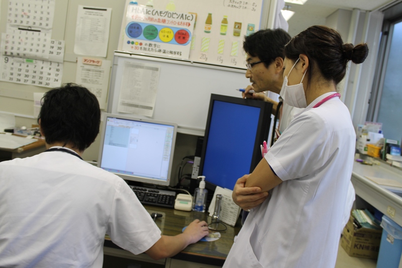 午後から、3名の研修医の先生方は、回診、デイリーカンファに取り組みました。デイリーカンファでは、外来に来られた糖尿病のある患者さんについて、検討されました。技師さんが検査中に伺った情報により、家族・親戚背景が分かりました。看護師さんも参加して共通理解を深めていました。たくしま