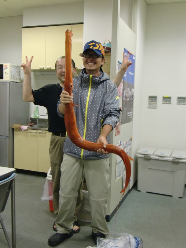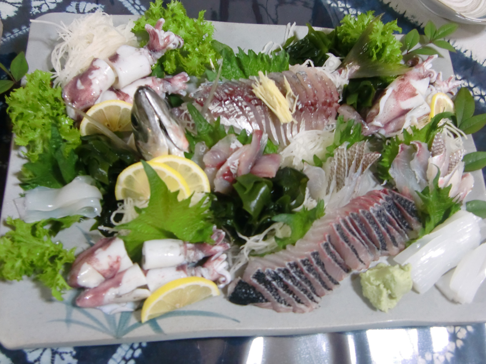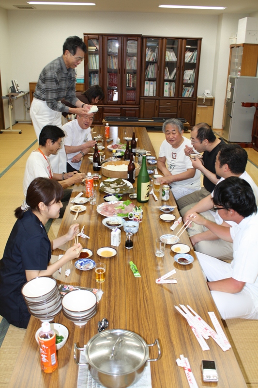 先週の金曜日の昼食に、イカのお刺身とゲソ焼きをお出ししました。井上先生も、新鮮なイカに大喜びでした。かと、思っていたら、なんと濱田先生が3.8キロもあるスズキを釣り上げられ、夕食はスズキのお刺身が追加されました。この後、かなりお酒がすすんだようです☆たくしま
