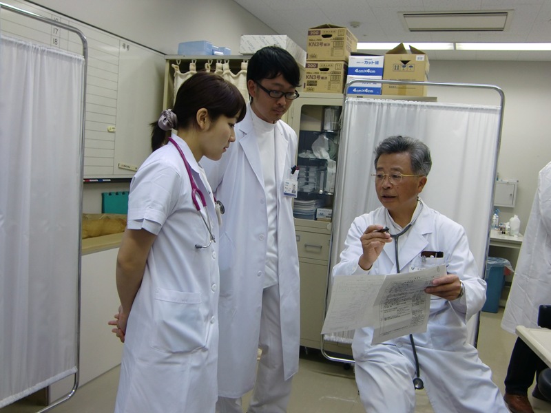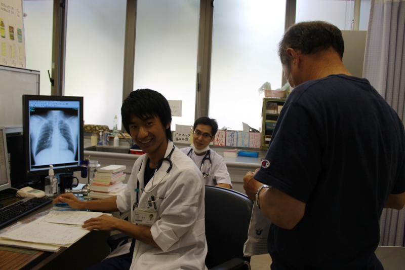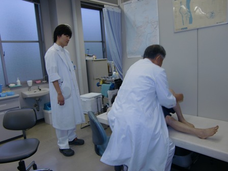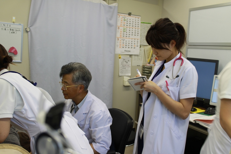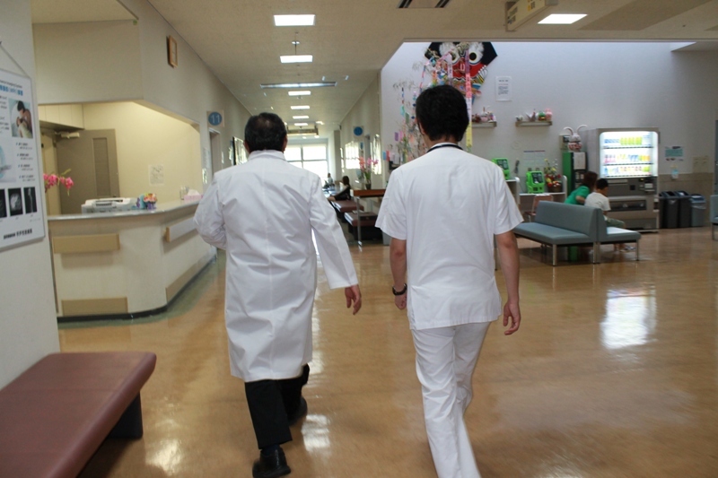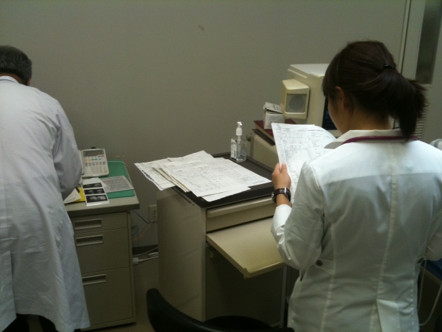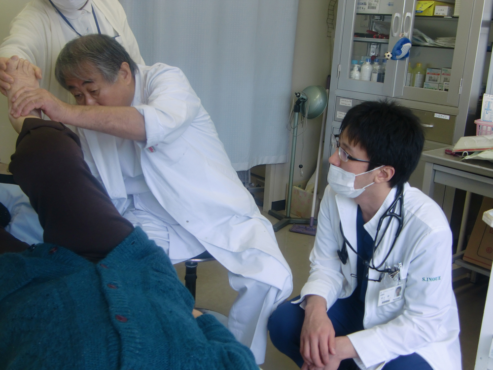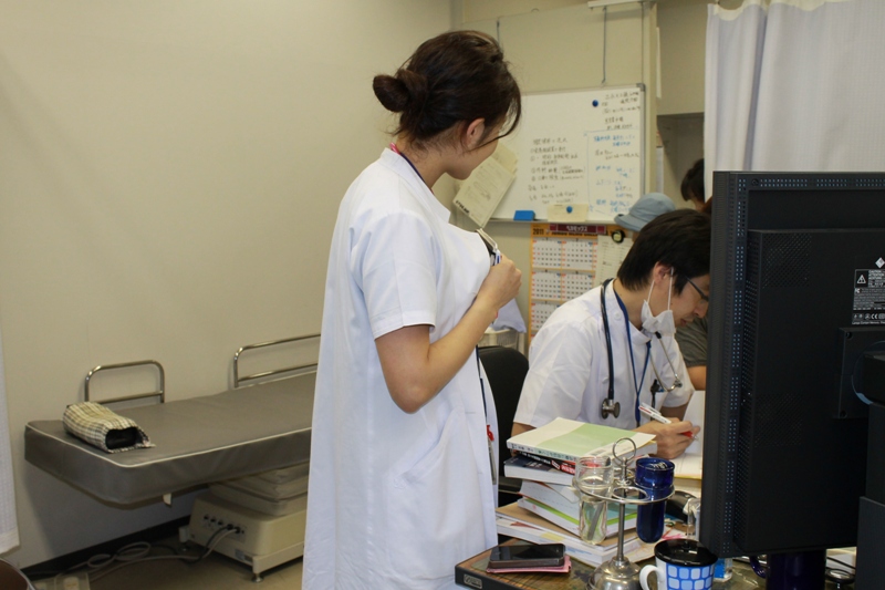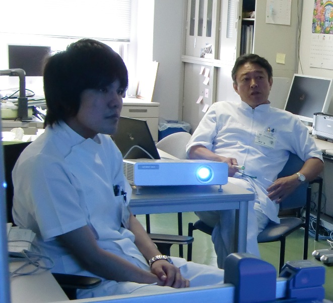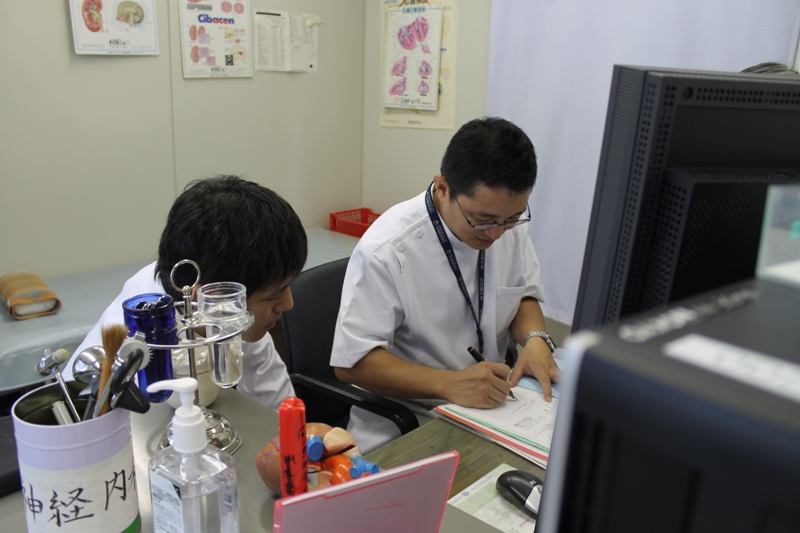 今日、大原先生は、中桶先生と新患外来をしました。神経診察が終わった後、中桶先生がレクチャーをしている様子です。横浜労災病院では急性期の患者さんが多く、こちらで再診医療がみれるのがよかったそうです。たくしま
