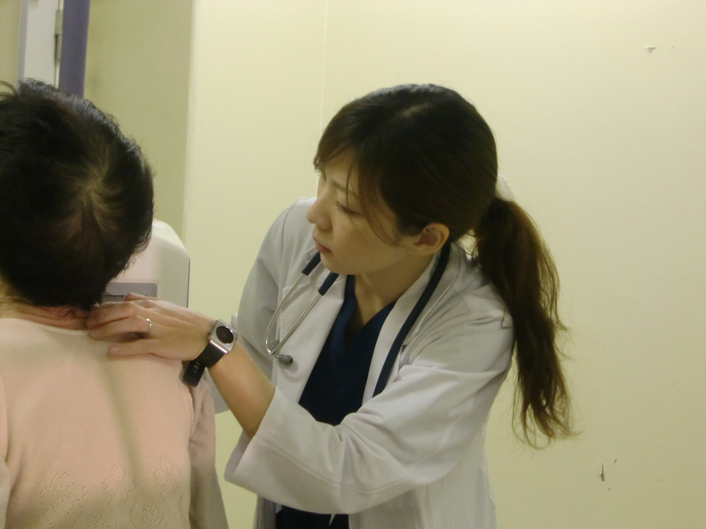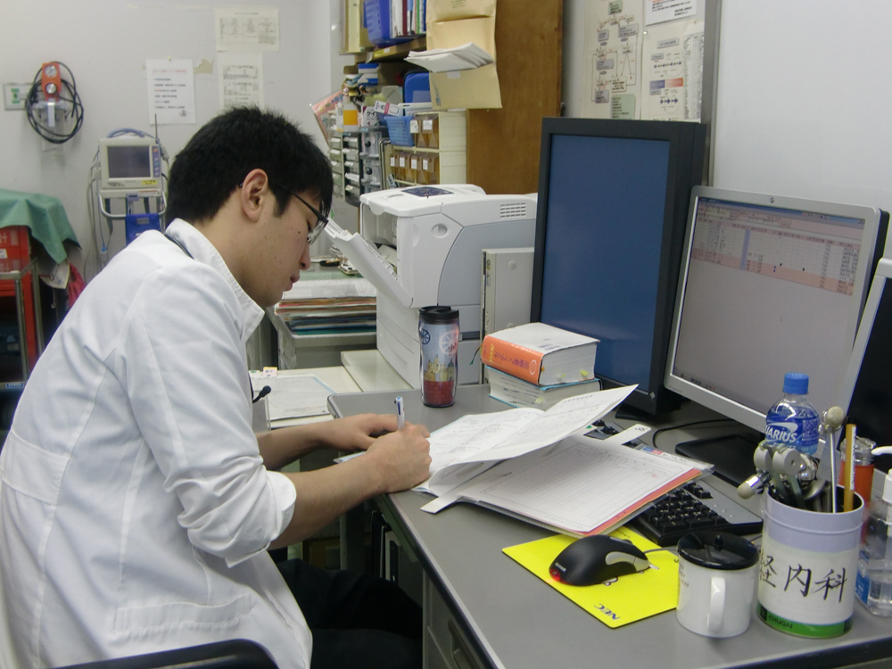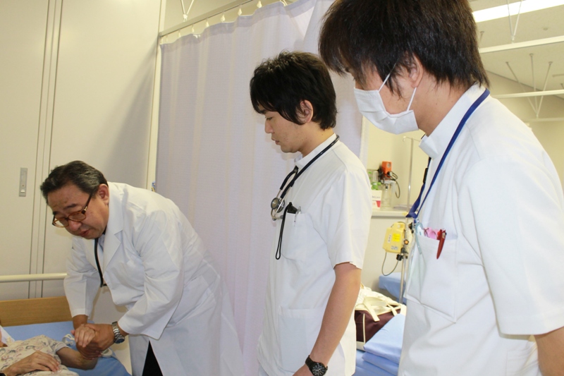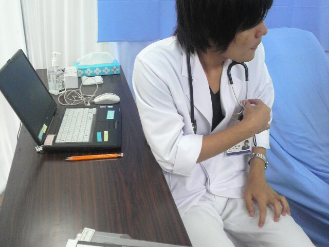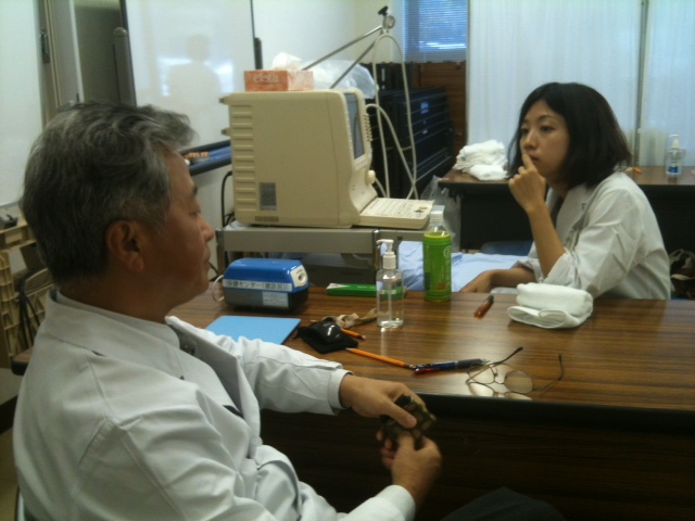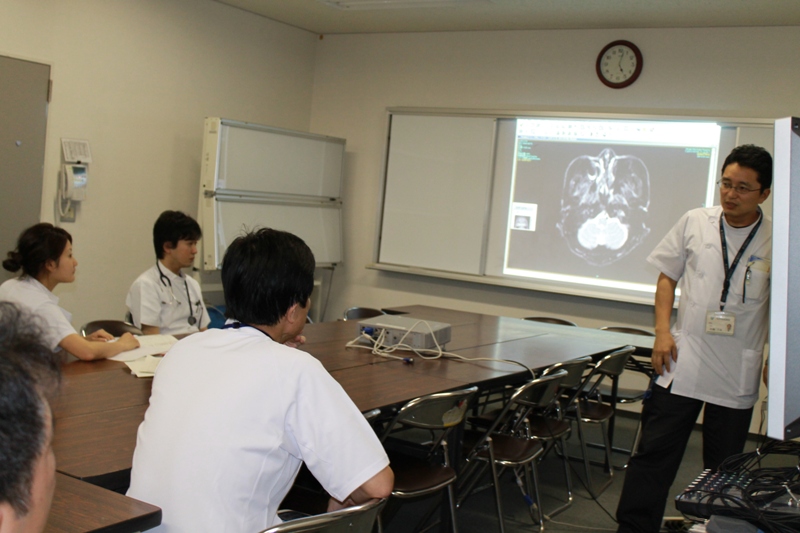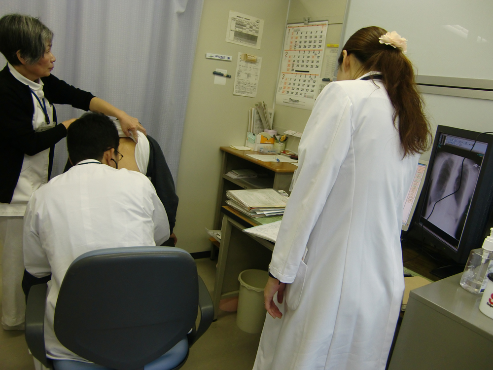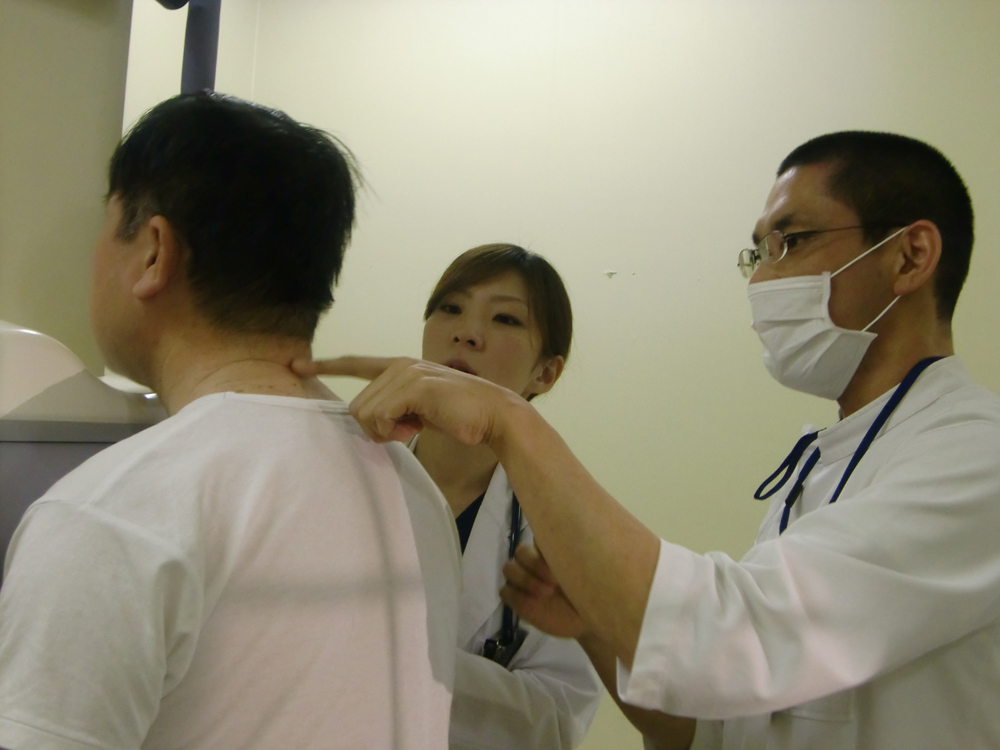 今日、大原先生は、中桶先生と新患外来をしました。神経診察が終わった後、中桶先生がレクチャーをしている様子です。横浜労災病院では急性期の患者さんが多く、こちらで再診医療がみれるのがよかったそうです。たくしま