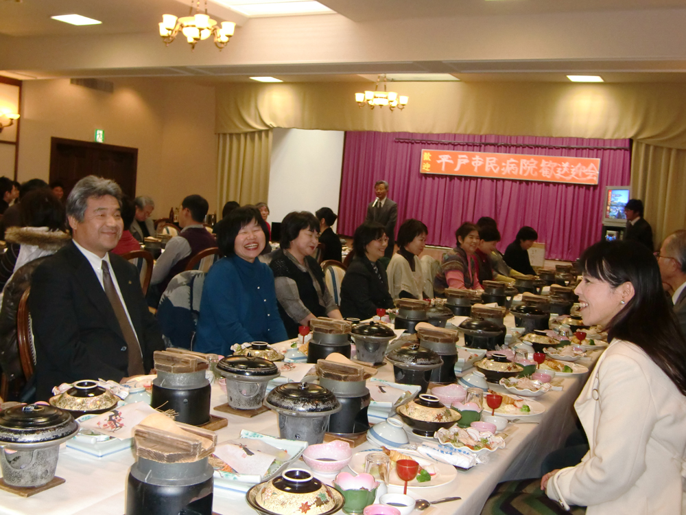昨晩、歓送芸会が行われました。主役は、来月より長崎労災病院へ転勤になられる飯野先生、今月より小児科に着任されました森永先生、そして研修医の井上先生、光岡先生です。押淵院長先生のご挨拶の後、池田先生のお言葉、賀來先生の乾杯の後、宴会がはじまりました。10年もの間、平戸市民病院に勤務された飯野先生に、病院から記念品と花束の他、病院スタッフより寄せ書きをいただいていました。機講からは、先生方との集合写真や研修医の先生方との研修風景の写真をおくりました。にぎやかに盛り上がる宴会の中、密かに、井上先生と薩長同盟ならね、横長同盟が締結され、明るい未来が見える気がしました。最後に、飯野先生の胴上げでおひらきとなりました。左手には、記念品としていただいた腕時計が輝いていました☆たくしま