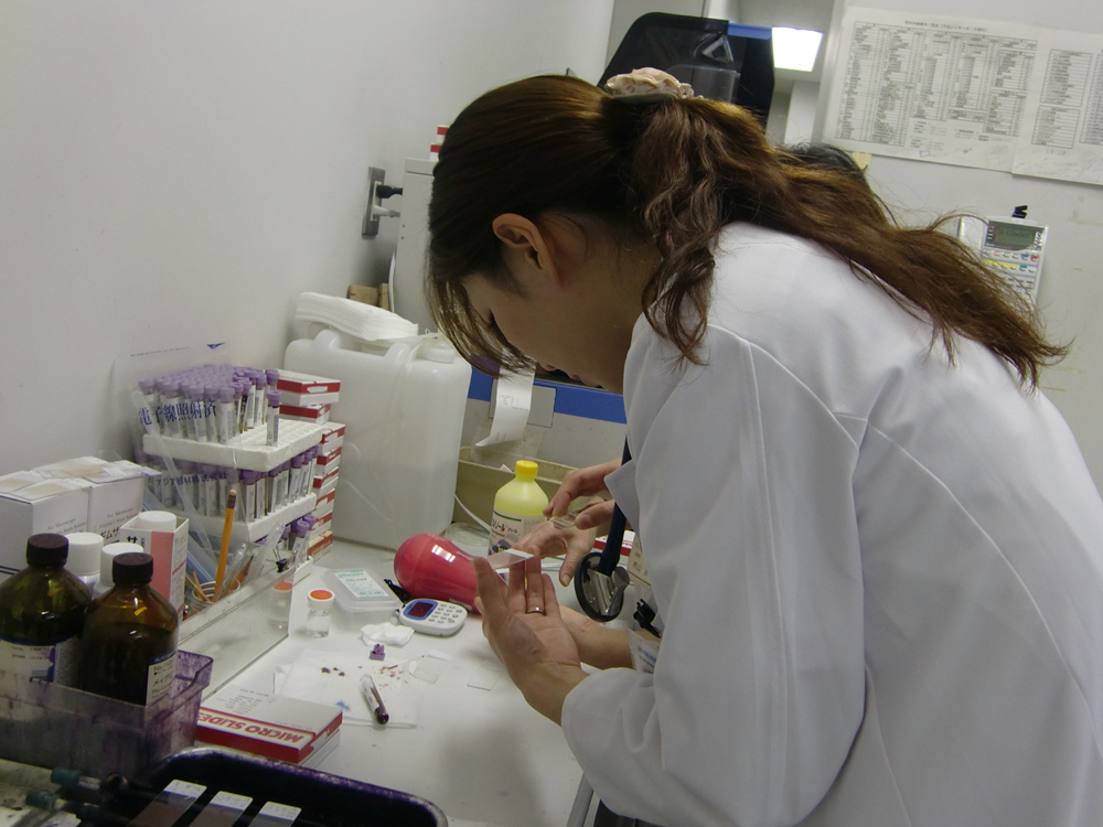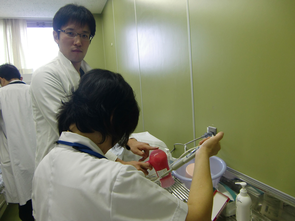 今日は朝の健診の後、外来、検査実習、オペ、介護保険講義、ディリーカンファ、リハビリ講義と取り組みました。検査実習実習では、リンパ節や高橋先生自身の血液の検境などをしていました。昨晩の疲れがちょぴりありつつ頑張っていらっしゃいました。たくしま
