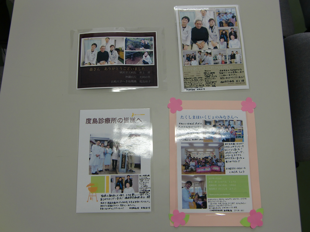 今日、研修医の先生方は、研修の合間に度島研修の御礼をつくりました。度島診療所、度島へき地保育所、イノシシを捕獲した森さん、そして・・一番お世話になった濵田先生に、井上先生の素晴らしいMacさばきによる写真カードと、光岡先生によるお花のデコレーションで素敵な贈り物ができました☆濵田先生も、大変、喜ばれました!!ここで、また、いい思い出ができました。本当に、よかったですね