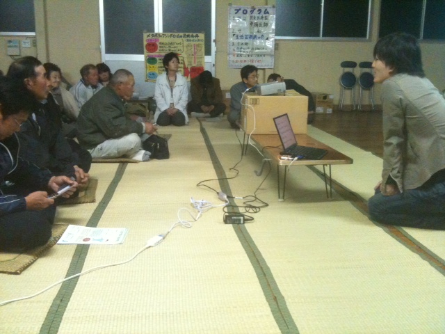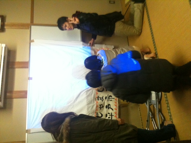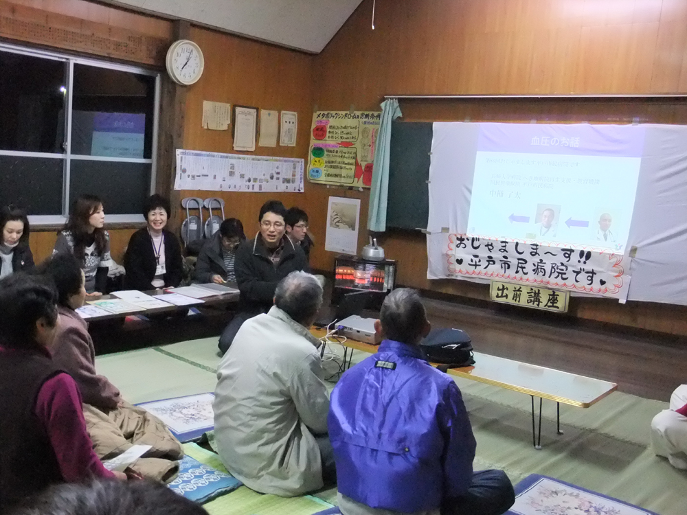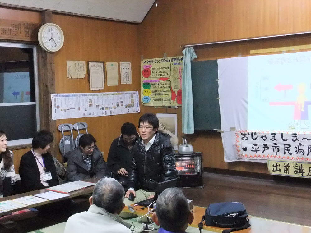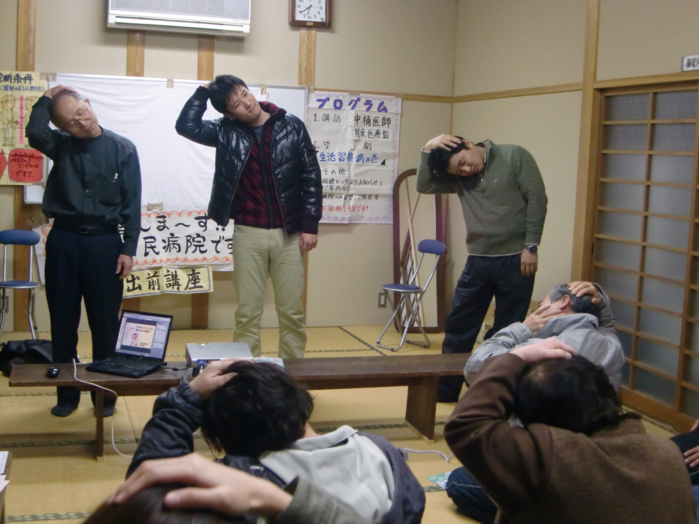 昨晩、紐差2地区において、出前講座行われ、研修医の先生達も参加されました。小雪がちらつく寒い夜でしたが、13名の方が来られました。中桶先生の血圧の講話の後、生活習慣病の寸劇、賀來医療監の「タバコとメタボの関係」の講話の後、井上先生は、肩こり体操のインストラクターをされました。寒い中、かたまっていた肩がほぐれたようでした。たくしま