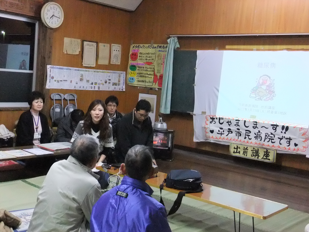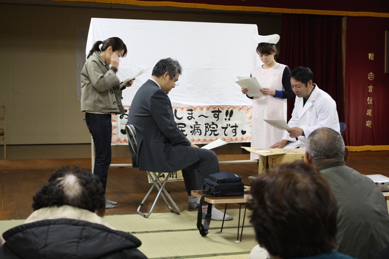 ちょっと遅くなりましたが、25日に紐差3地区において、出前講座が行われました。とても寒い中、19名の人が集まりました。中桶先生の講話の後に続いて、光岡先生と井上先生による「糖尿病」の講話が始まりました。分かりやすい表現で話され、好評で客席からは「1番よかった!」と掛け声がでました。また、井上先生は住民の方からの質問に応じていました。その後、賀來副院長・脚本による生活習慣病の寸劇に、井上先生は、ドクター役で登場しました。本物のドクターによる、おもみのあるはなし方と、患者役の大石PTのアドリブに続く、井上先生のアドリブがおもしろく、会場の皆さんは聞き入っていました。たくしま