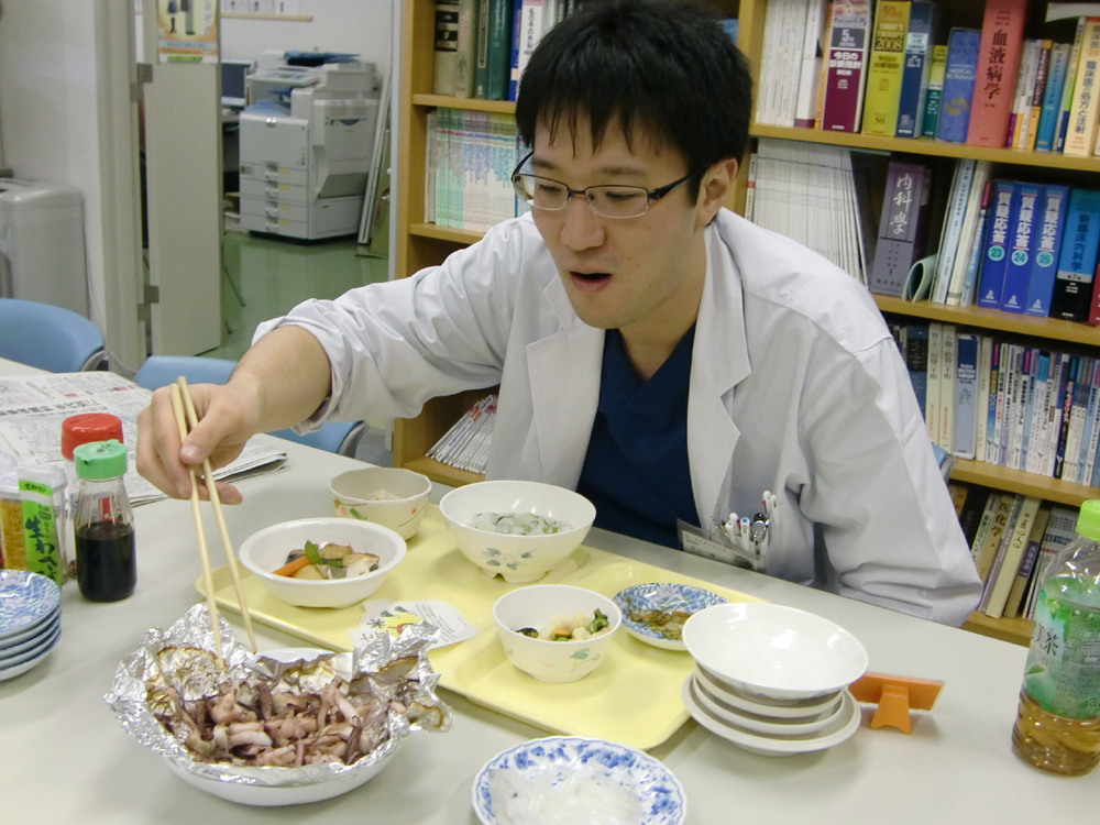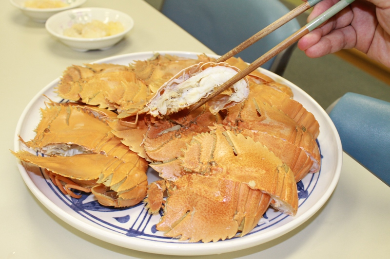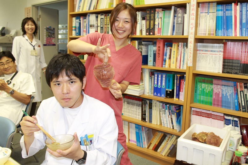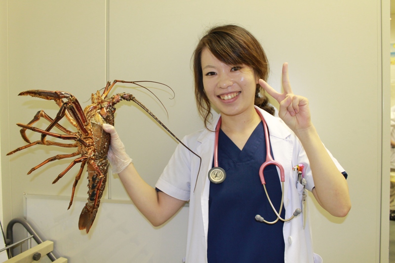 昨日、濱田先生による内視鏡検査実習がありました。今回は、三宅先生がご指導いただきました。研修が終わって、濱田先生から、たくさんのウチワエビを研修医の先生達にいただきました☆早速、医局事務の原さんが、調理してくれました。さっきまで生きていたウチワエビのお刺身は、特においしかったようです。濱田先生、ありがとうございました。たくしま