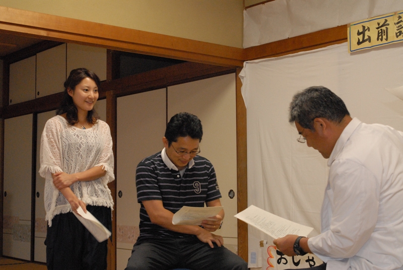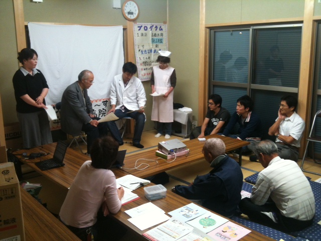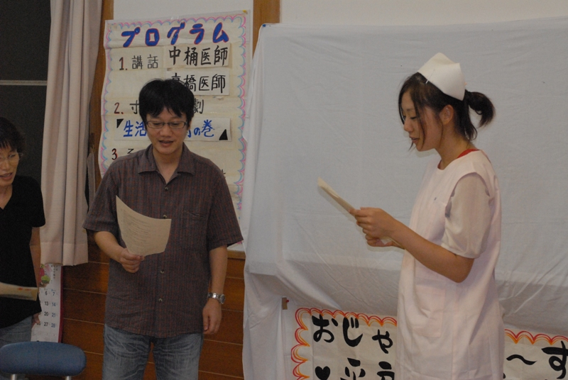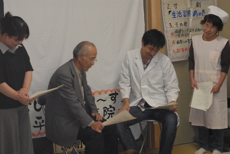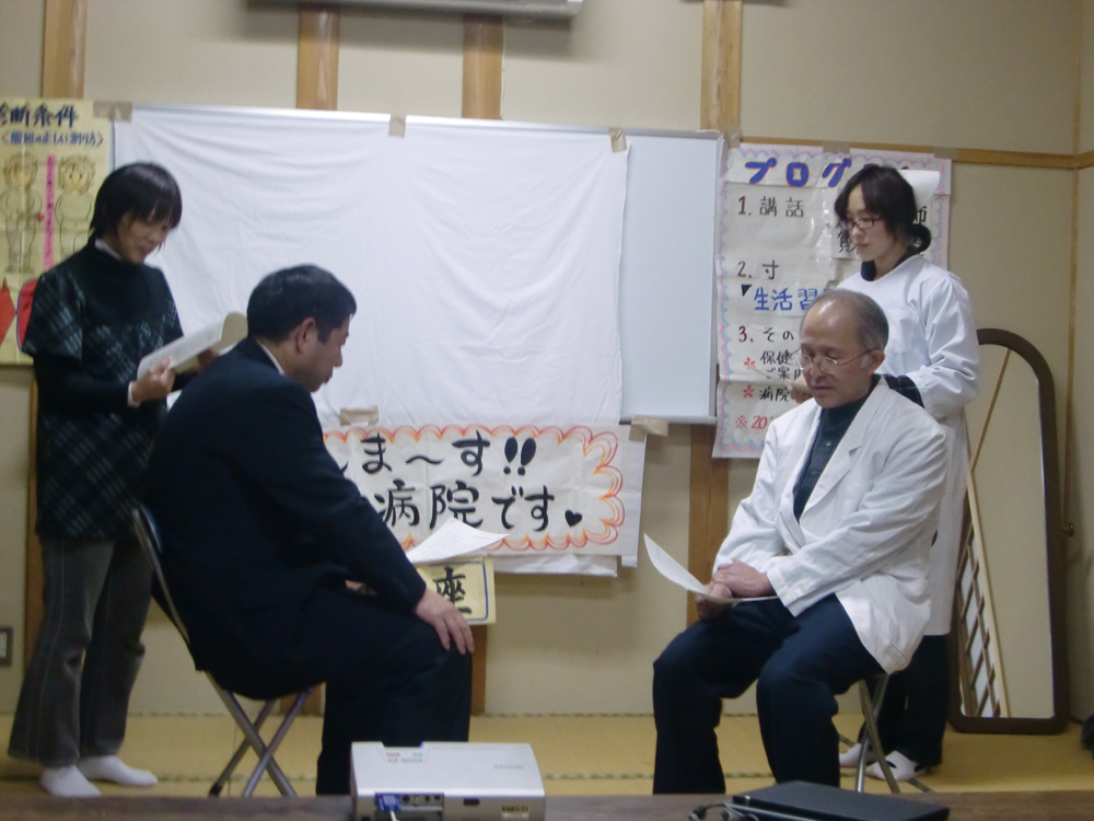 今週、猪渡谷町において、出前講座が行われました。尾崎先生と三宅先生は、生活習慣病の寸劇で、患者の妻役とドクター役をしました。最後に、大成先生が糖尿病の講話をしましたが、ぶっつけ本番だったにもかかわらず、とても上手だったそうです☆たくしま