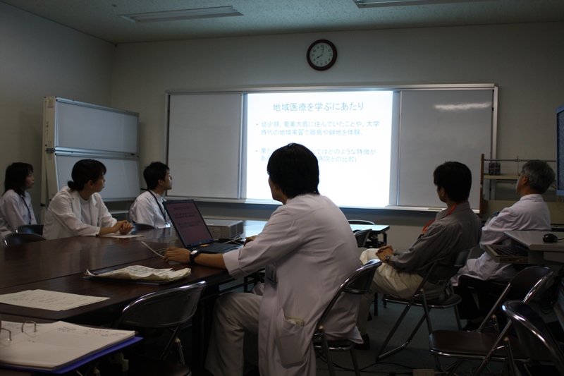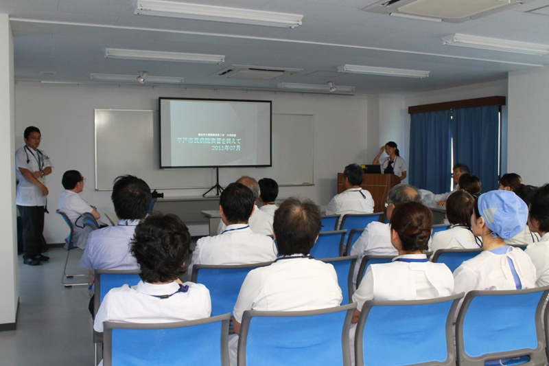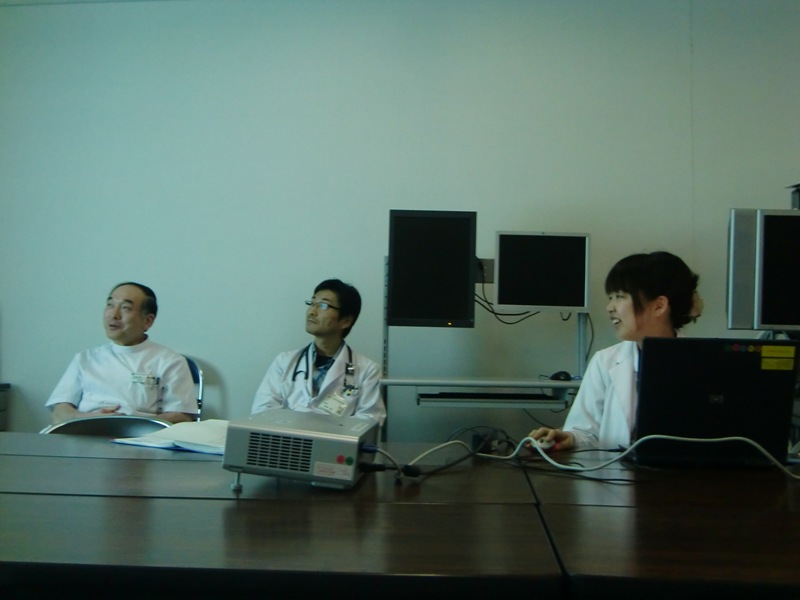今朝、井上先生と光岡先生の実習発表が行われました。まず、井上先生の週ごとの研修と思い出、公私交えての発表がはじまりました。また、これから情報テクノロジーと医療の研究者になられる井上先生から、ITを利用した地域医療は、このように変わる!と提案がありました。平戸と横浜の双方の良い点を伸ばす、シナジー効果、地域医療と先端医療の融合☆明るい未来を覗いたような気がしました。最後に、I Shall return…と、名言を残されました。中桶先生からは、You have to do!と返事が飛びました。引き続き、光岡先生の発表になり、先生が来られる前の地域医療の印象のお話から始まり、実際、こちらに来られてから、感じたことを話されました。手技経験ができたことや、地域医療にかける先生方・病院スタッフの方々の熱意が、特に心に残られたようでした。最後に、これらを「しっかり神戸に持ち帰りたいと思います」と言われました。