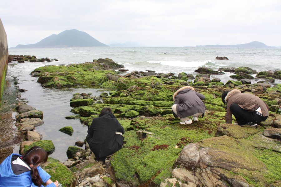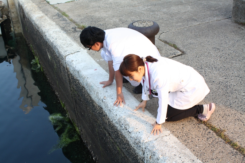 宇久島では綺麗な景色と共に 海の幸をごちそうになりました。ちょうどアオサのシーズンですから、近所の海岸で食材の採取です。実習後の懇親会では天ぷらになって出てきました。ふわふわのモチモチの食感と磯の香りがとてもおいしかったです地域の医療とは?話し合いは夜遅くまで続きました。翌朝は 5時30分起床 6時25分発の高速艇で上五島 有川港へ向かいますが・・・大丈夫でしょうか?