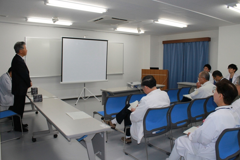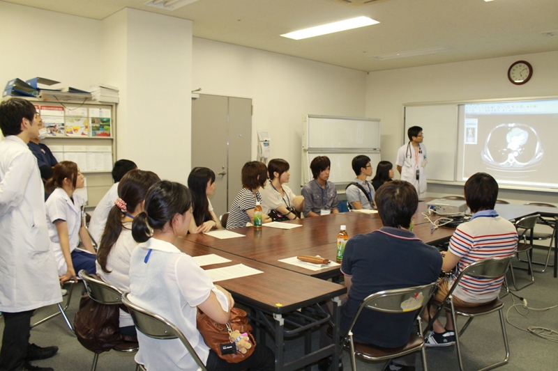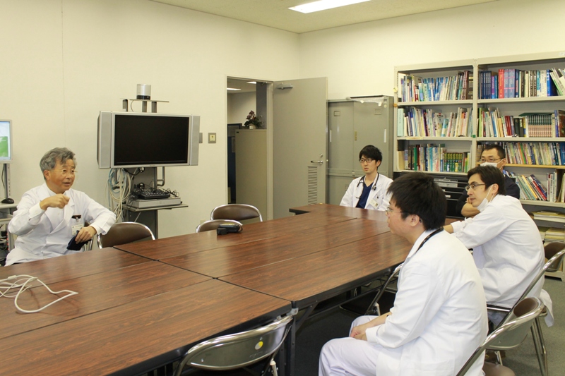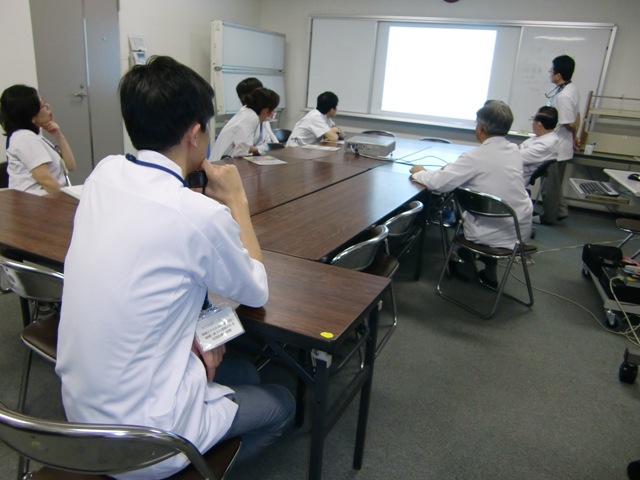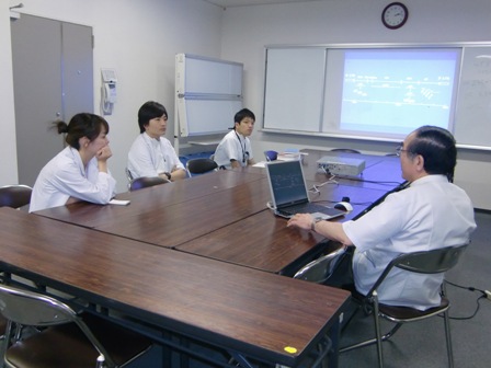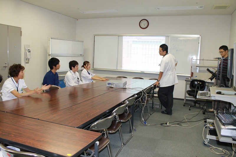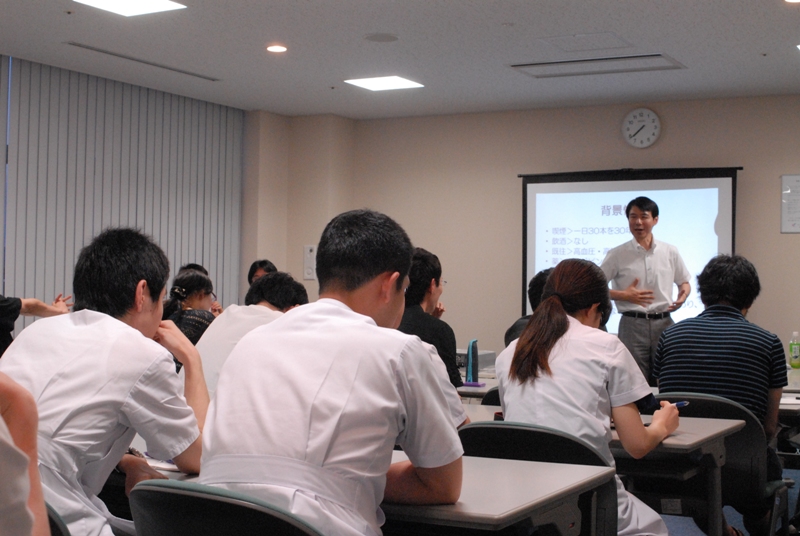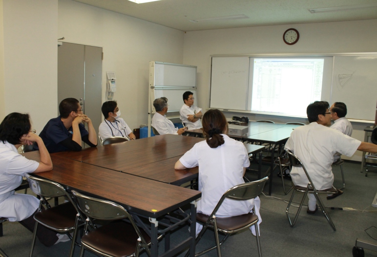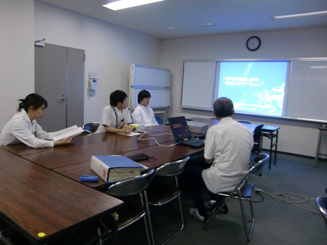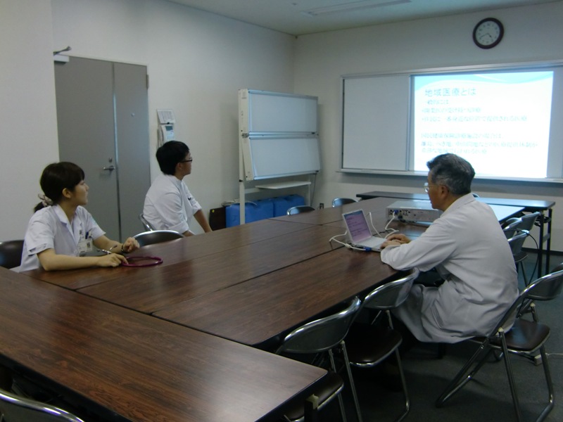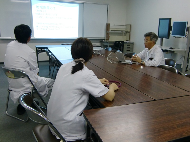 院長による「平戸における地域医療」講義と、種岡検査技師長による「HTLV-1」講義を受講している様子です。種岡検査技師長の講義では、20数年前より、ある地域の承諾をいただいてHTLV-1の追跡調査をしてこられた成果など話されたようです。