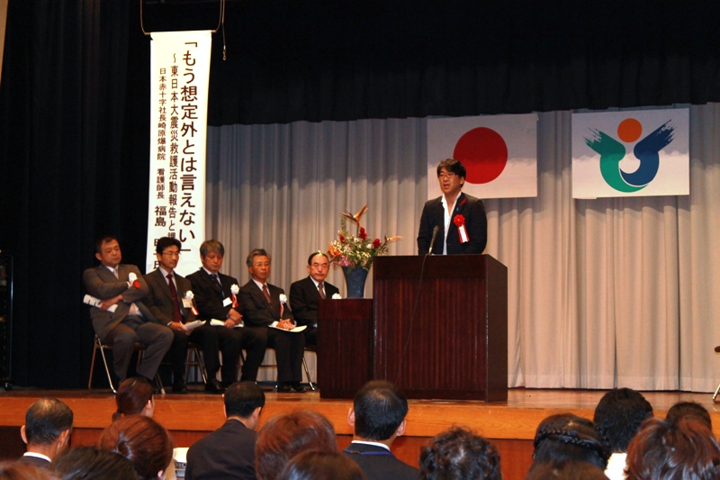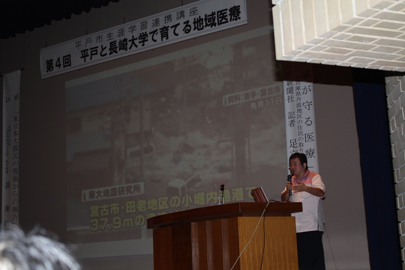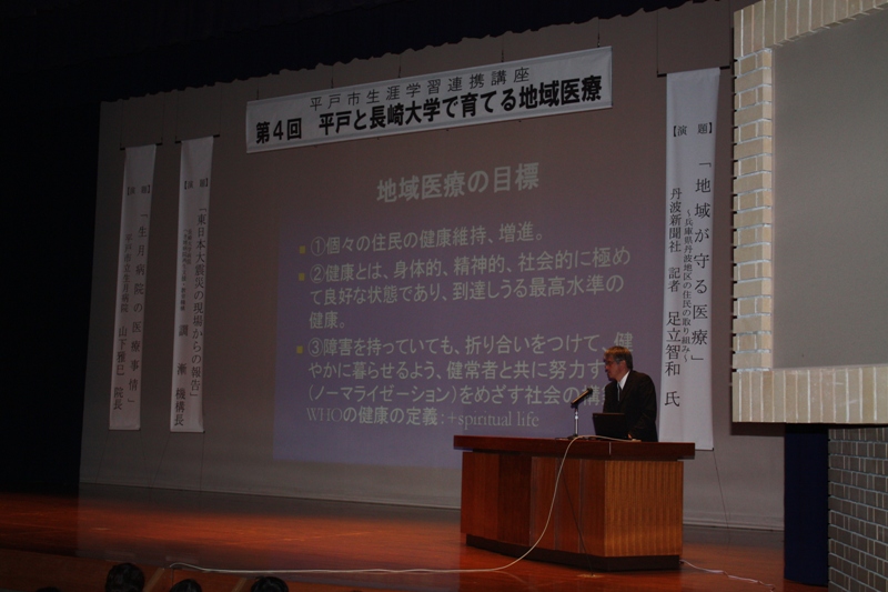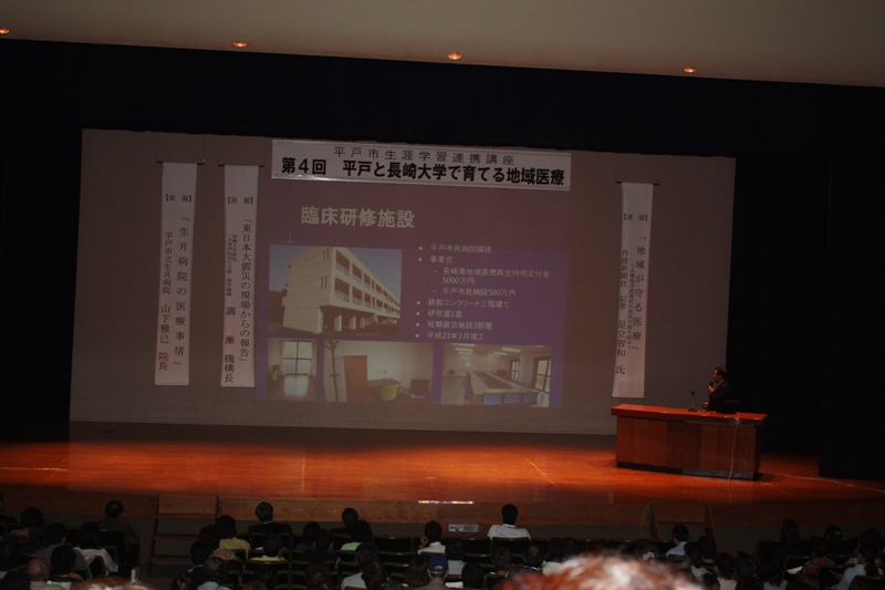 先週末生月町において、へき地機構と平戸市民病院・生月病院主催による地域医療講演会が行われました。460人以上の方が会場に集ってくださいました。まずは、池田事業管理者の開会の挨拶の後、今年完成しましたレジデントハウスの概要について、長崎保健福祉部藤田次長にお話いただき、「東日本大震災の現場からの報告」と題して、調機構長が長崎大学の支援の様子を講演しました。早く現場にかけつけたこと等、長崎大学の支援に感銘したという感想がありました。引き続き、生月病院山下院長による「生月病院の医療事情」講演の後、丹波新聞記者、足立さんの「地域が守る医療」〜兵庫県丹波地区の住民の取り組み〜の講演が始まりました。足立さんの軽快なお話に会場では、時折笑い声が聞こえました。地域の方の取り組みと心に、人(医師)を動かす力があるのだと感じました。また、足立さんの丹波での取り組みが会場に来られていた方達にも伝わったようでした。(詳しくは、News&Topicsにて紹介します)たくしま