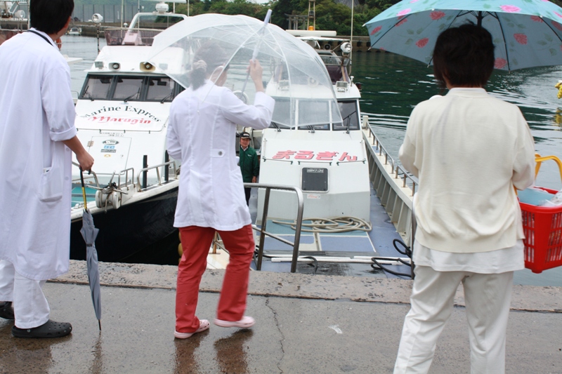 今日、研修医の先生方は、高島へ訪問診療に行きました。高島は、平戸の最西端にある野子町の先にある小島です。丸銀さんに御協力をいただき漁船で高島へ渡りました。(高橋先生は、ちょっぴり舵をとったみたいです)高島は、人口約30名で医療機関がありません。小学校もありましたが、閉校になり、児童は船で野子小中学校まで通学しています。先生方が訪問に来て、喜んでいただけたようです。雨の中。お疲れ様でした。たくしま