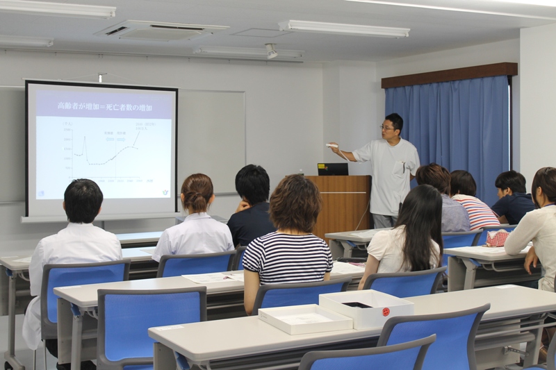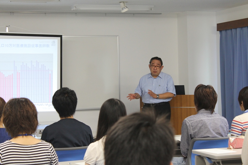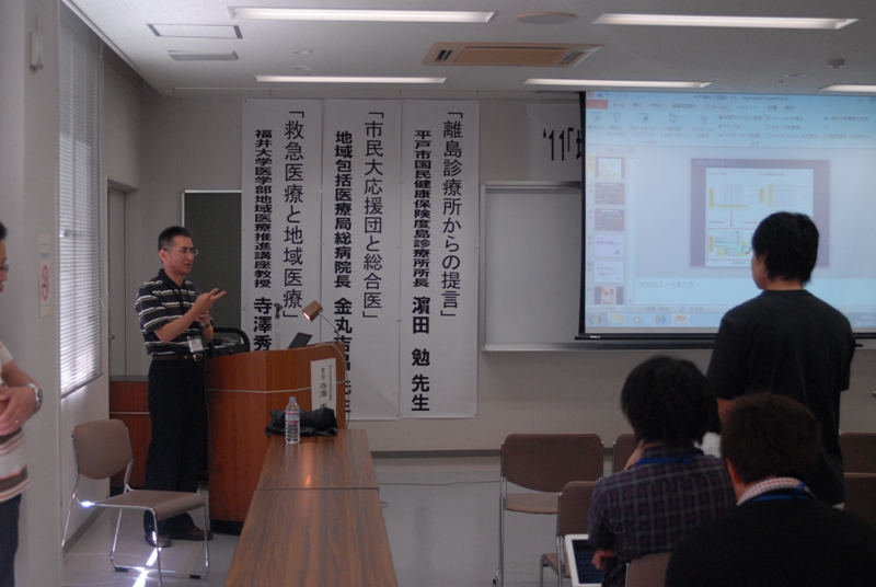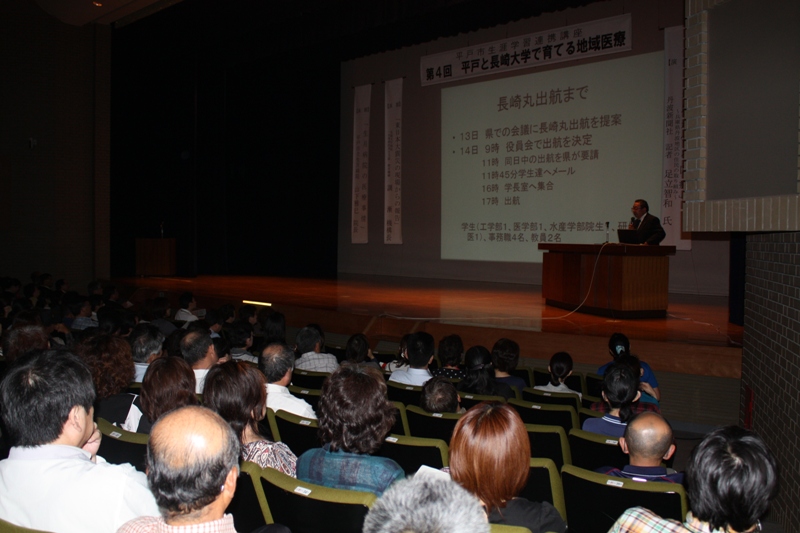 押淵先生による、地域医療講義。平戸での、予防、医療、福祉が一体となった地域包括医療の実践と成果についての講義です。