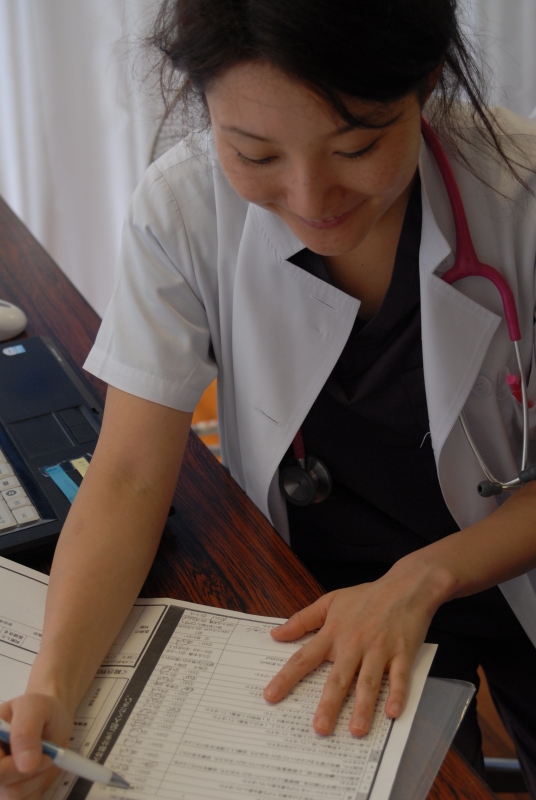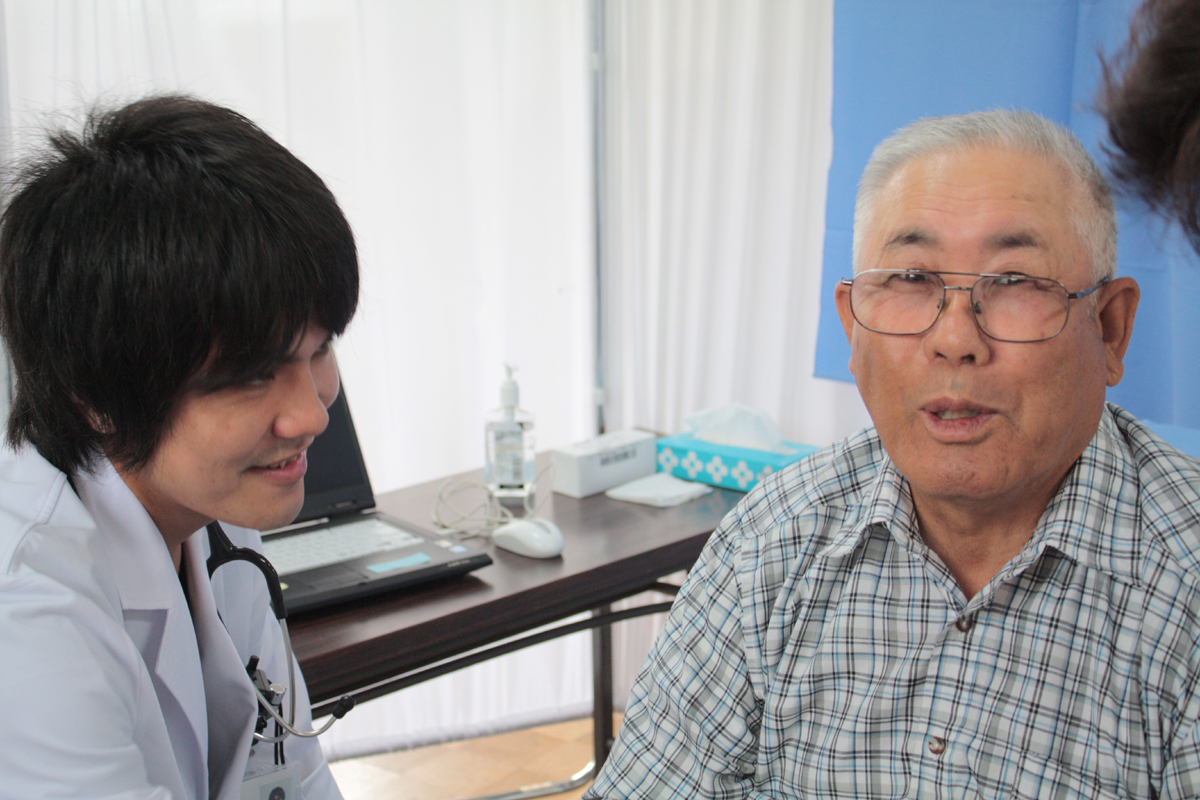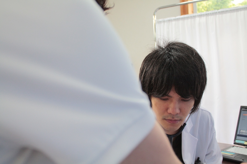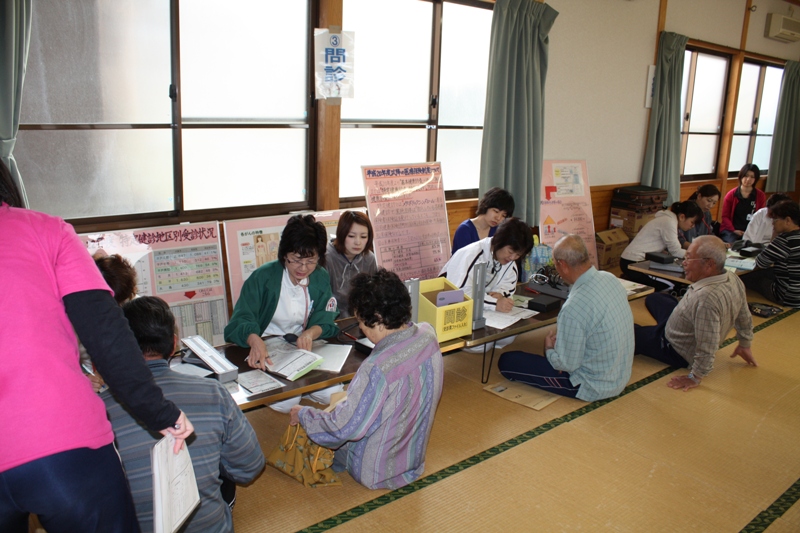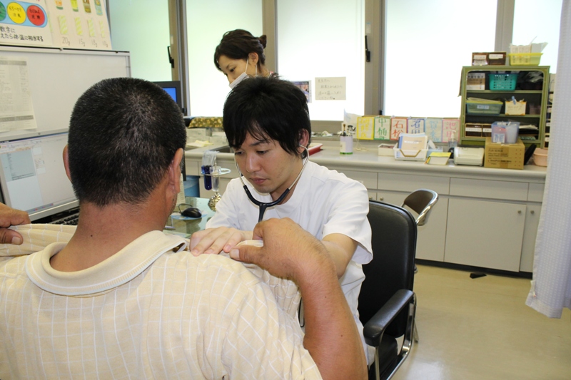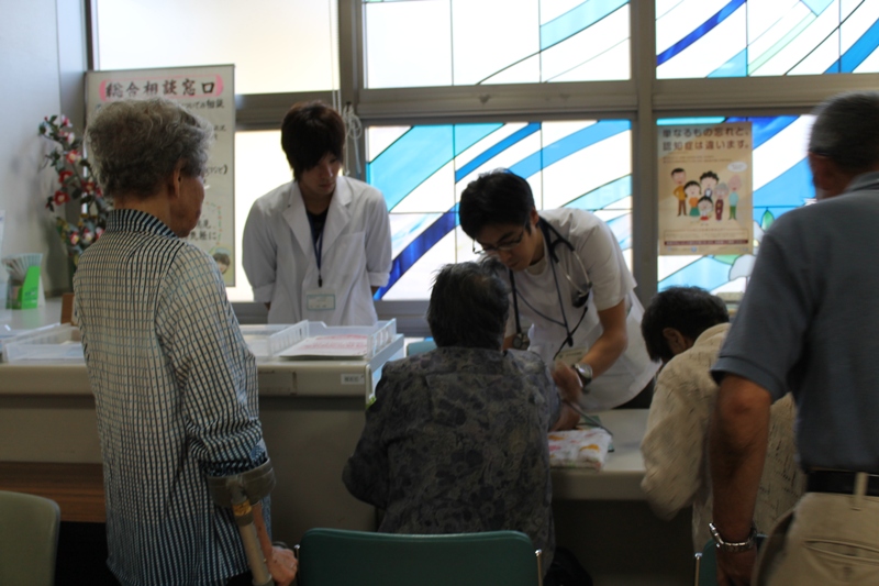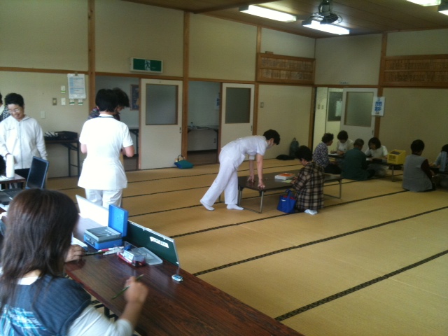 大原先生の研修、午前中は中桶先生の外来でした。この後、患者さんと手で力比べをしたそうですが、患者さんの方が強かったそうです!普段から農作業をされているため、年配の方も強いようです。午後から訪問診療行きました。訪問先で地域の方のあたたかさを感じられたそうです。ディリーカンファの後、今日は年に1度の夜間健診です☆住民健診に仕事等で来れなかった方達のために、実施している夜間健診に大原先生も取り組みました。17時からの受付開始の様子です。たくしま