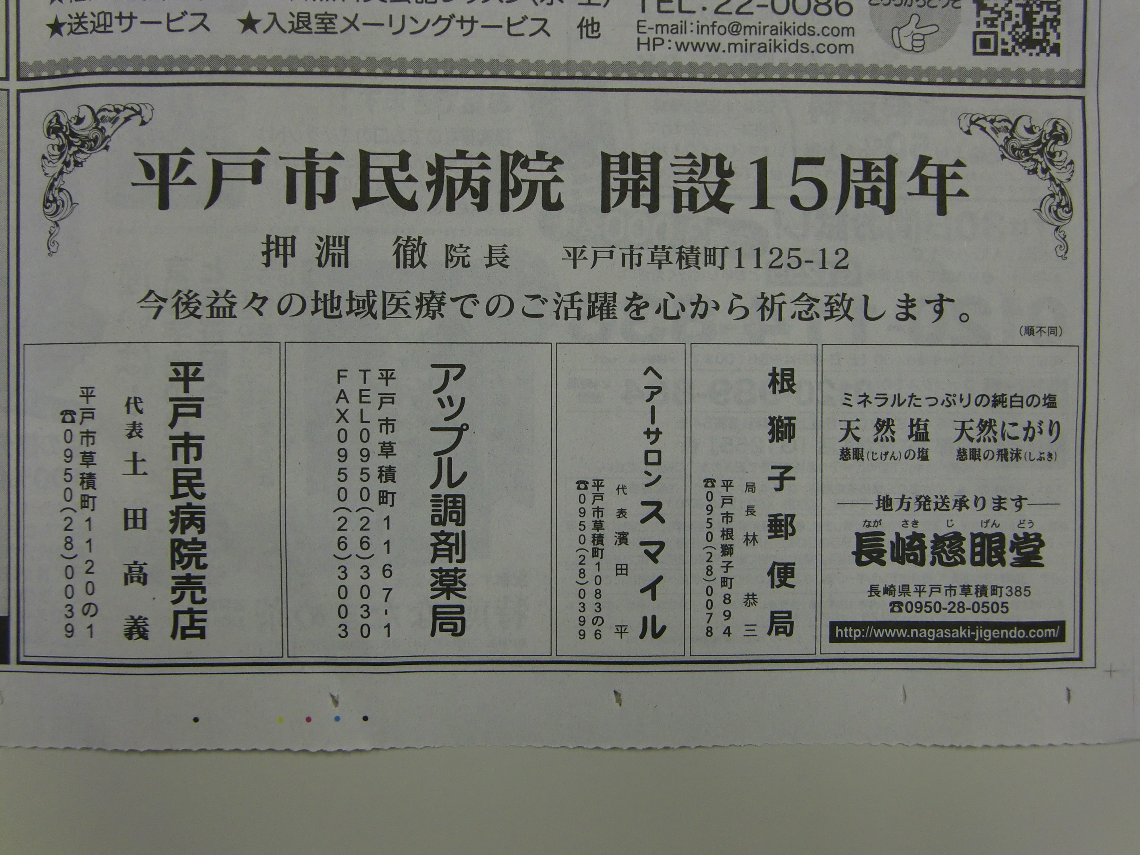 今日、西日本新聞の広告欄を見ていたら、「平戸市民病院開設15周年」と、いう文字に目が止まりました!平戸のある方達により掲載していただいたようです。平成8年4月1日に「平戸市国民健康保険紐差病院」と「平戸市立南部病院」が統合して「国民健康保険平戸市民病院」が開院しました。開設15周年の佳節にレジデントハウスオープンと、おめでたいことが重なりました☆☆