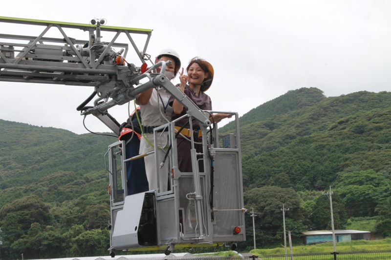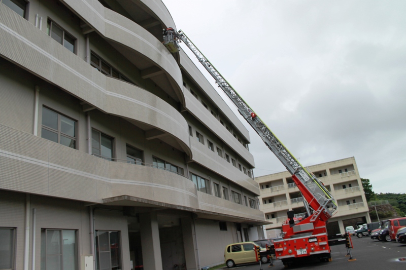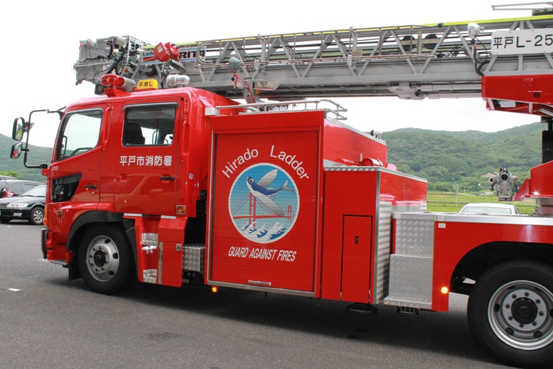 今日、防災訓練がありました。3Fの出火を想定した防火非難訓練では、大和田先生も試運転に乗りました。安定した乗り心地で全く、怖くなかったそうです。消火訓練では、職場体験学習に来ていた学生さんも取り組みました。最後に、消防車のショットです☆平戸のシンボル・平戸大橋と平戸名産・あご(飛び魚)のデザインが可愛いです☆たくしま