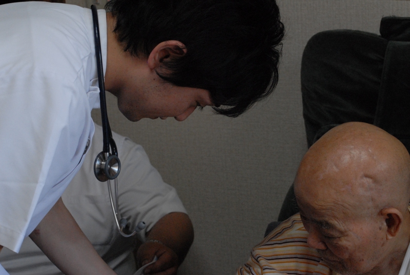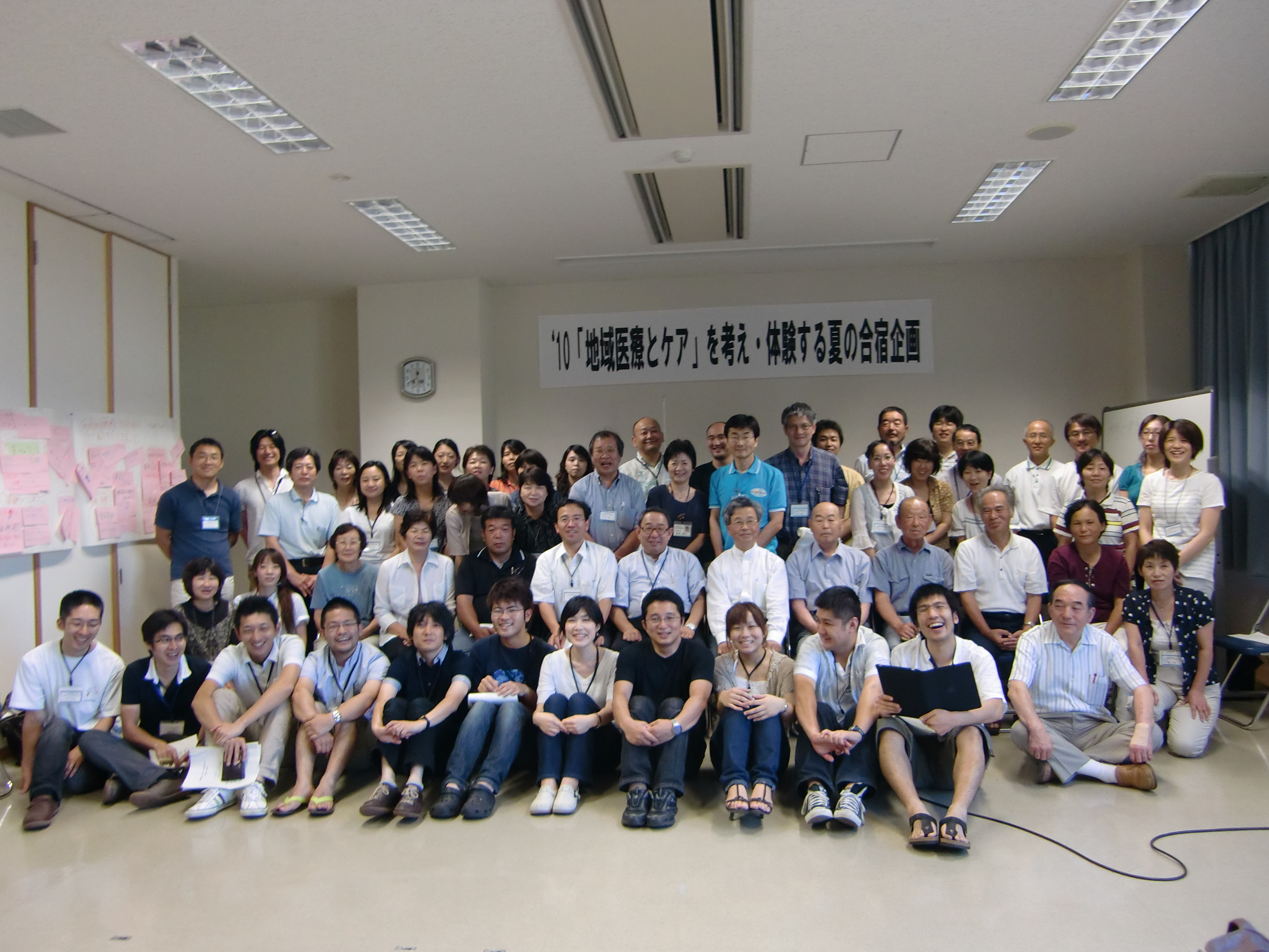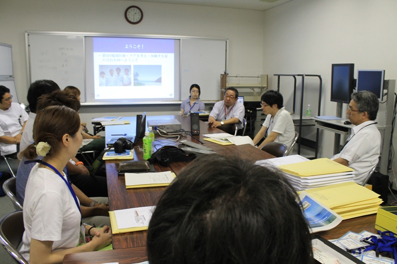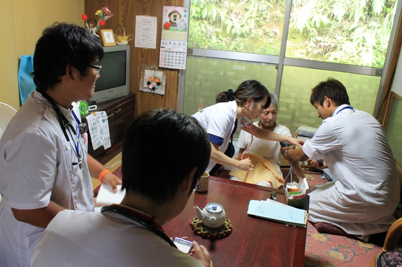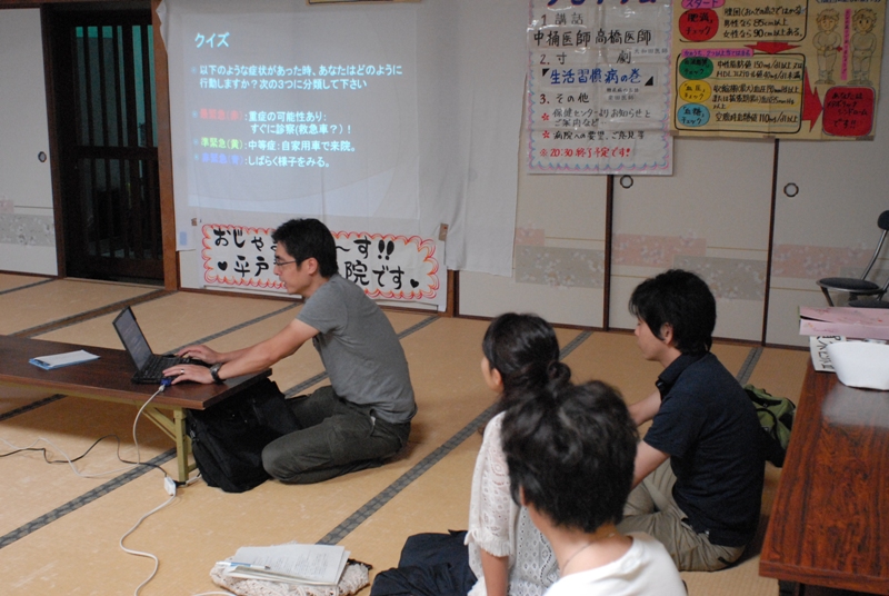 ちょっと、遅ればせながら夏合宿の様子をお知らせします。今年は、医師・医学部学生・医療関係者の方、講師も含め、37名に参加いただきました。また、今年もNHKの方が取材に来られ、長崎大学医学部の本石君もインタビューをされました。まずは、訪問診療に行きました。本石君は、測定器による血圧測定に挑戦しました。訪問から、戻って中桶先生のレクチャーです。中には、今回初めて地域医療に密着してみて、面白いと感じた学生さんもいたようです。夕刻からは、洛和会 音羽病院の松村院長による講演会がありました。6枚目の写真は、講演が終わって、学生さんからの質問に答える松村先生の様子です。たくしま