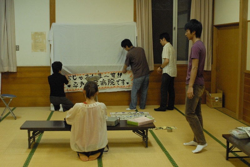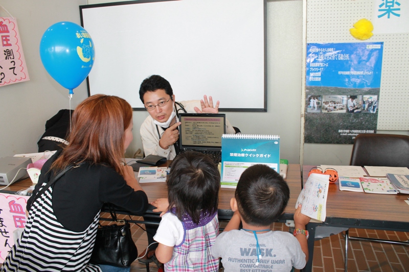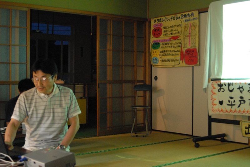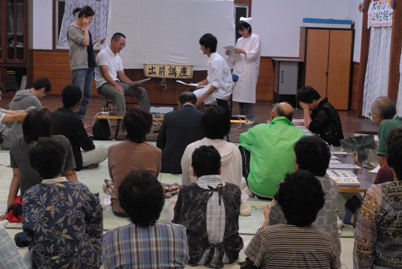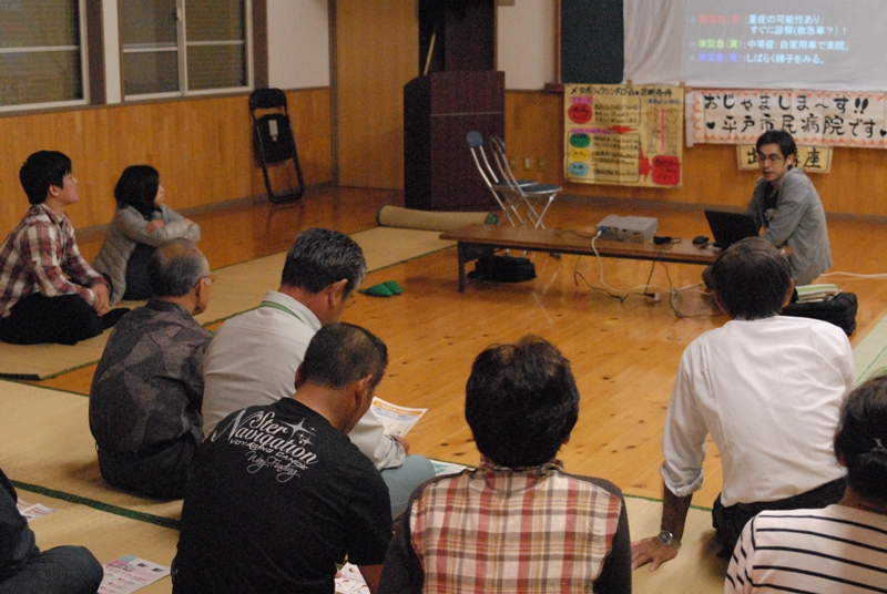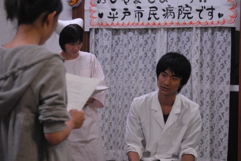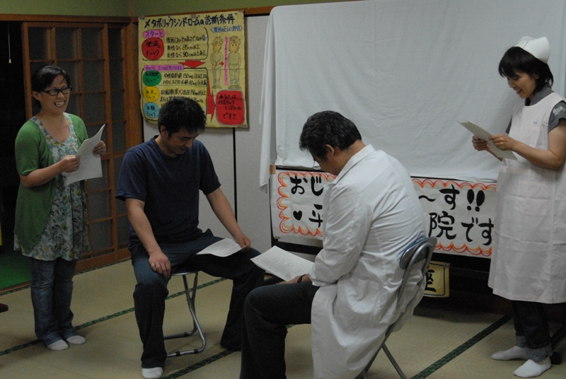 平戸市民病院の出前講座。おじゃまします市民病院です、で木場町にお邪魔しています。メタボリックシンドロームがテーマの寸劇で、解説するドクター役は研修医の一瀬先生です。