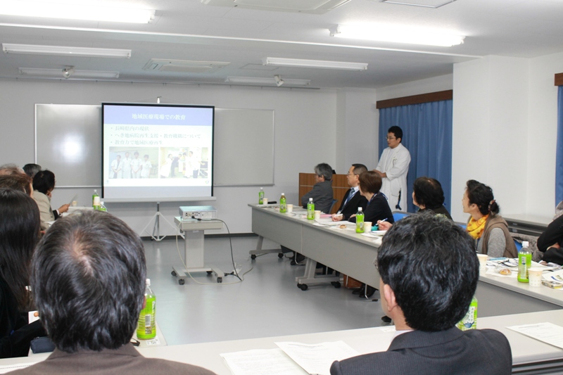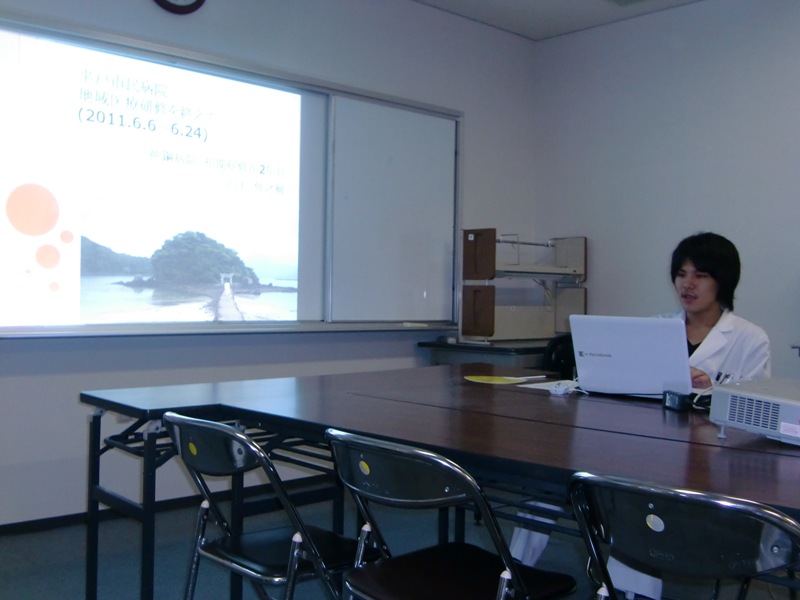 井上先生の実習発表の様子です。雪が降る中、こちらまで車を運転して来られたお話から始まり、血液検査実習や内視鏡検査、訪問診療など初めて経験されたことを話されました。最後に高齢化が進んでいるへき地は、日本の将来の縮図であり、元気老人の創出に成功している平戸市民病院の医療は、先進医療といえると話されました。1ケ月間、本当にありがとうございました。たくしま