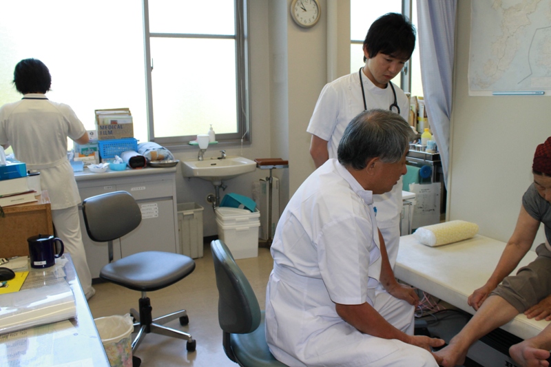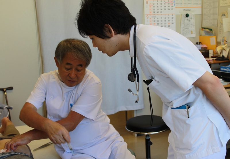 桒田先生の研修が今日で終わりました。実習発表では、地域医療がイメージだけだったものが、こちらに来て実際に経験できたこと、訪問診療、出前講座など院外でかかりあうことができたことなど、話しました。最後の健診を終えて、押淵院長より、マムシ咬傷等こちら特有の症例を教えていただきました。