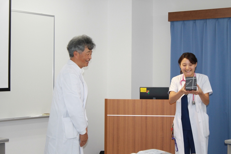 今日で、森下先生の研修が最後となり、実習発表をしました。最後に、平戸市民病院互助会より記念品が、院長先生より渡されました。また、いつの日か平戸を思い出していただけたら幸いです。森下先生、3週間、本当にありがとうございました。たくしま