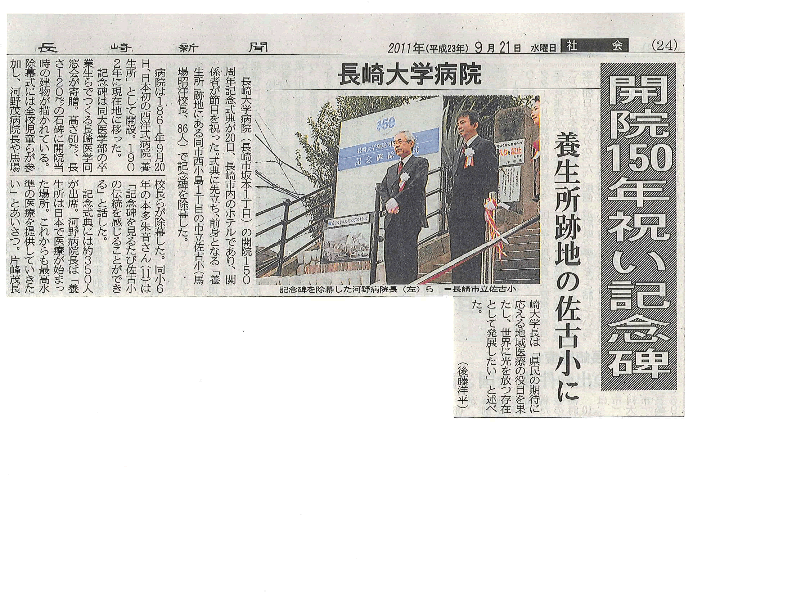 7回目の今日の新聞には、昨日行われた記念式典の記事が掲載されました。私は、記事の最後にあった「県民の期待に応える地域医療の役目を果たし、世界に光を放つ存在として発展したい」という、長崎大学長の言葉が心に残りました。