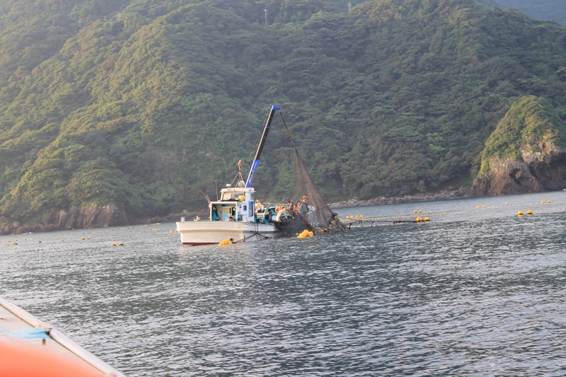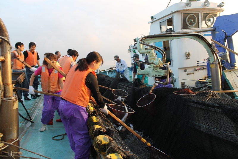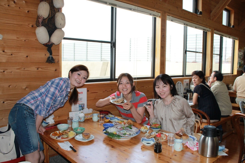 夏合宿の2日目は、朝5時に病院を出発して、マイクロバスで白石漁港へ向かいました。向かった先は、漁師体験ができる綾香水産「母の手」です。大きな漁船に乗り込み、定置網を引きます。網にひっかった魚を大きなタモですくいました。獲れたばかりのピチピチとはねる魚を見て、皆大興奮でした。中には、2日酔いと船酔いのダブルパンチの人もいましたが、船を降りて朝食がはじまると元気になっていました☆とれたばかりの魚を贅沢に焼き魚にしていたら、八坂院長と向原参事監、調機構長がかけつけてくれました。新鮮なお刺身と、魚のだしで作ったお味噌汁は絶品でした!!平戸人の私も、今まで食べたイカの刺身の中で一番おいしかったです!!お腹も大満足になった漁師体験でした。好評につき、来年もするようです。たくしま