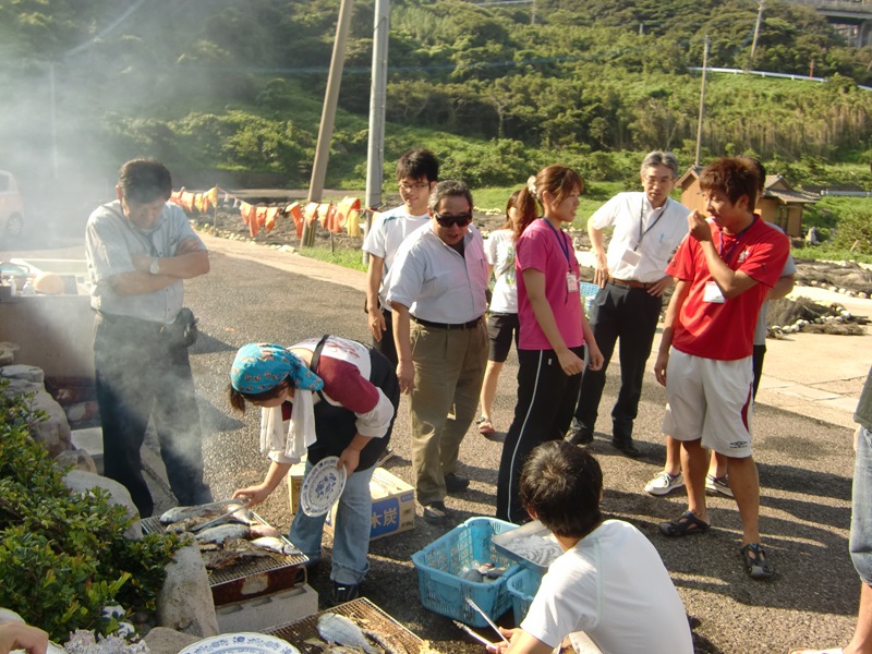 いよいよ、大和田先生の研修が今日で終わりました。昨日の夕方、レジデントハウス研修室で実習発表をしました。研修を通して感じた、市民病院のドクターを含めたスタッフのマルチさと地域医療に対する情熱を話しました。また、こちらに以前来られた研修医の先生の現在を紹介され、懐かしさと先生のおもしろい話で会場から笑い声もでました。発表を終えて、各師長さん達から、感想の言葉を言われました。いつも笑顔で頑張っていた姿が印象的だったようです☆最後に、市民病院互助会より平戸焼を、押淵院長からいただきました。機構からは、プチアルバムをお渡ししました。この時、ここでの研修が終わることを、じ〜んと感じられたようです。感動覚めあらぬうち、根獅子の浜で泳ぎました。大和田先生は、最後に平戸の海で泳ぐことができ、嬉しそうでした。ひと泳ぎした後、生月病院の送別会にお呼ばれして、バーベキューを食べました。波の音を遠くに聞きながら、食べる平戸牛は、とてもおいしかったです。最後に、いい思い出ができました☆☆たくしま