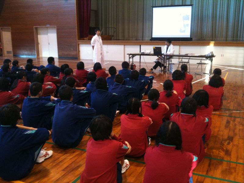 先週金曜日、卜部先生と中桶先生は、平戸高校へ講義に行きました。最初、卜部先生が「喫煙と健康」について講義をしました。タバコのイメージやリスク等についてクイズ形式で、話はじめました。卜部先生は、講義をしたのは初めてでしたが、とてもお上手で、中桶先生も思わず「うまい!」と言葉が出ていました。学生さんは、一言も聞き洩らさないような勢いで、講義の内容を書き取っていました。その後、中桶先生が、「チーム医療」や「血圧」「熱中症」について講義をしました。講義が終わってから、聴診器をあてるところや、なぜ背中にも聴診器をあてるのかという質問にこたえていました。先生が来られるので、質問も用意していたようです☆卜部先生は終始、笑顔で最後の地域医療研修を終わりました。