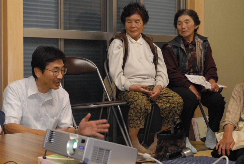 介護保険のサービス内容や受けられる支援について、ケアマネージャーからの講義を受ける井上先生。平戸では多職種による指導体制なのです。