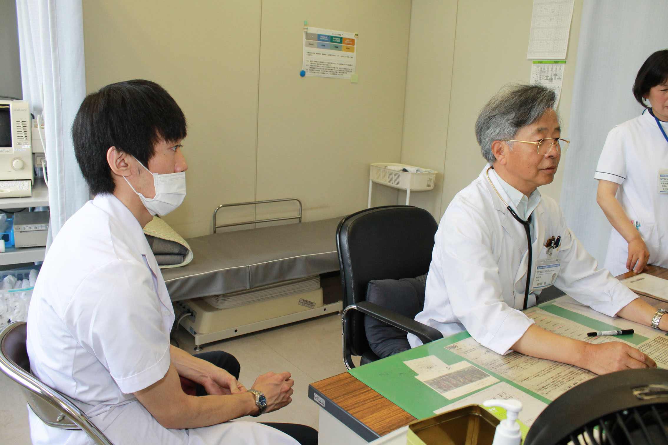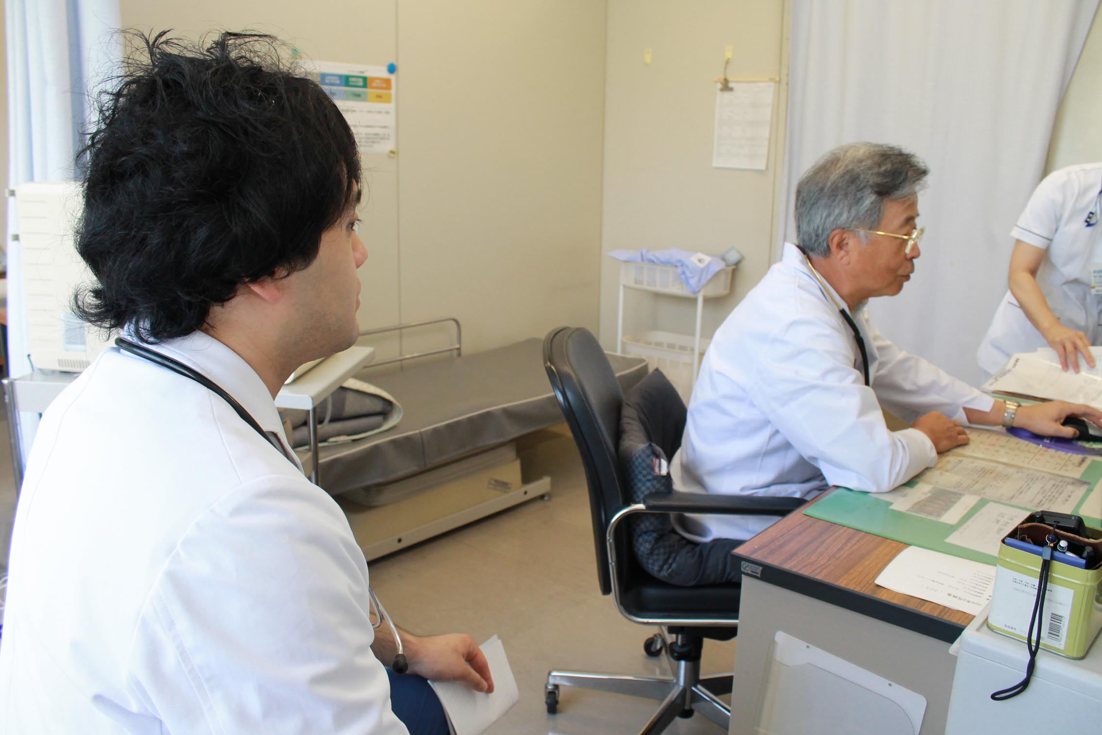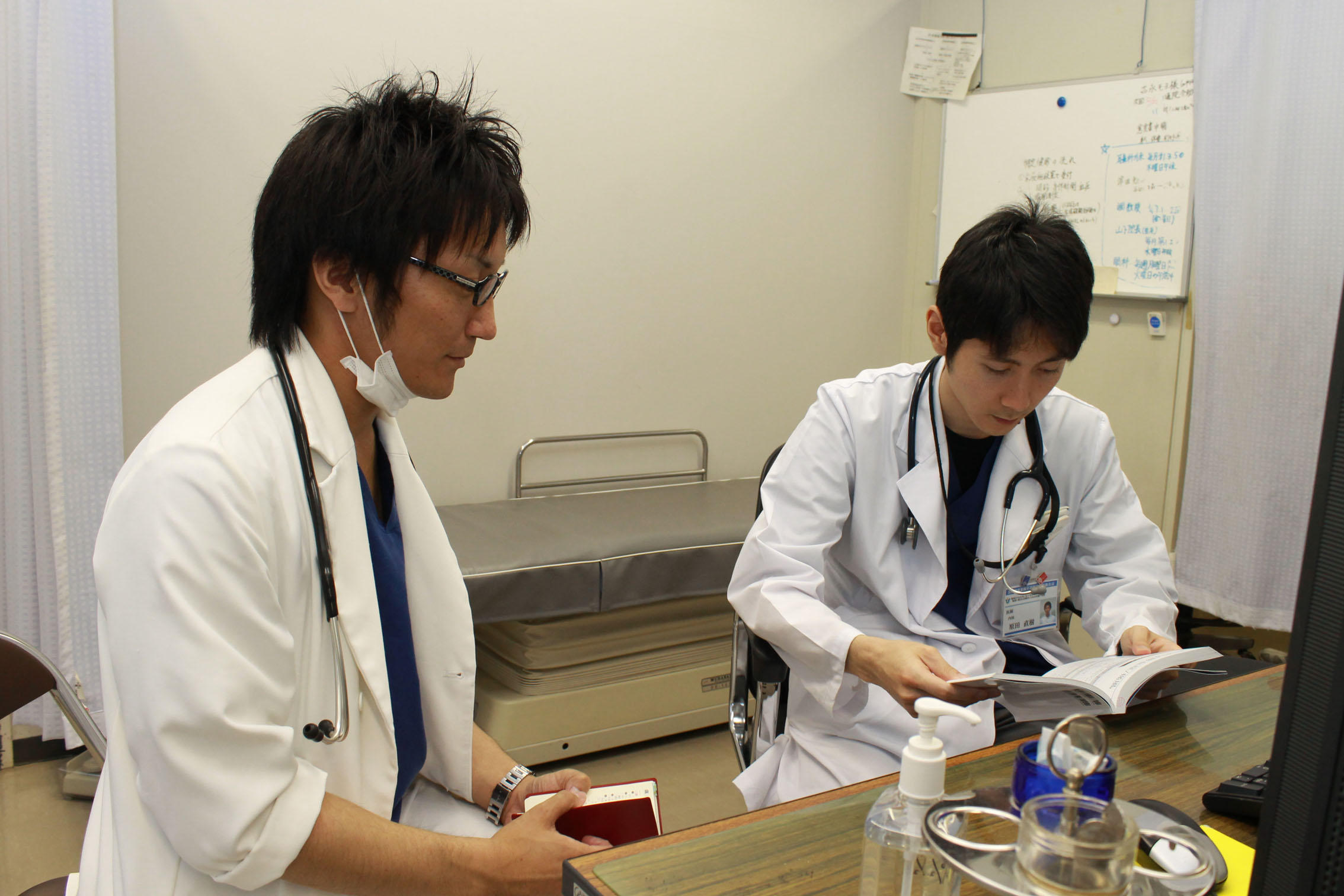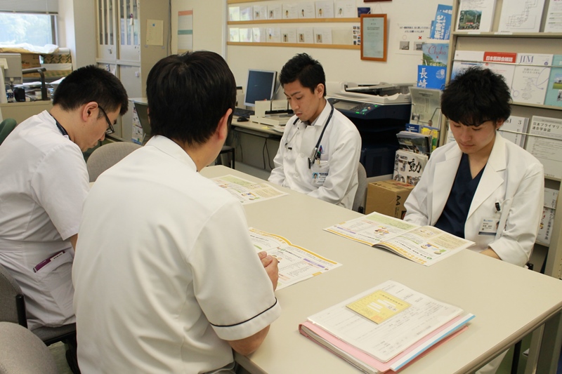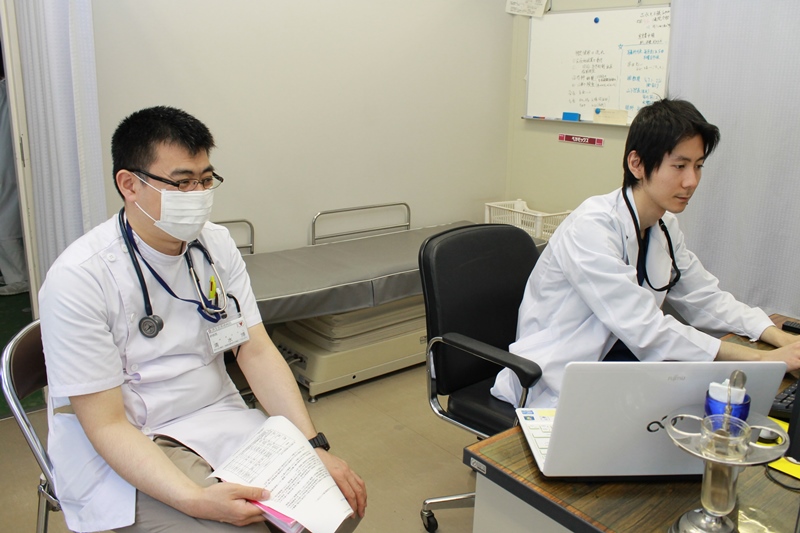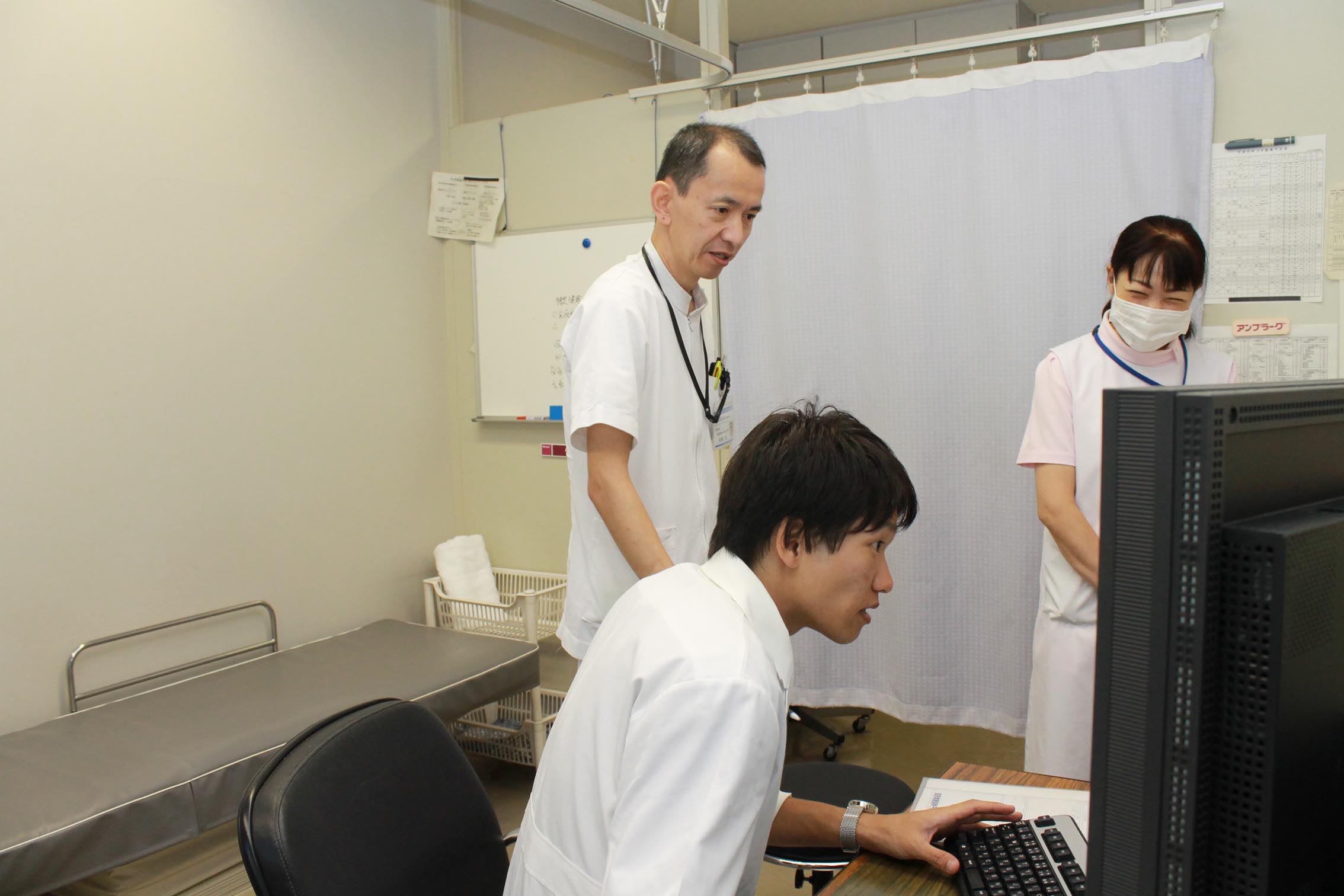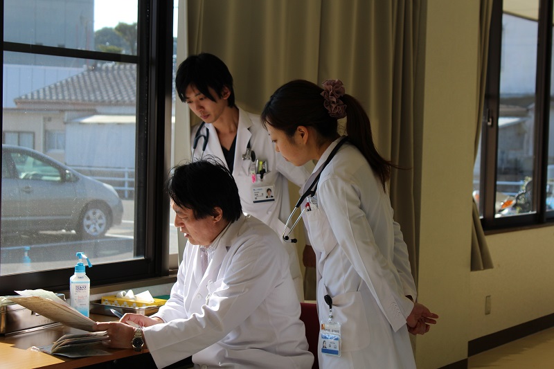 研修医の先生方は、毎朝、医局ミーティングの後に事業所健診に取り組みます。