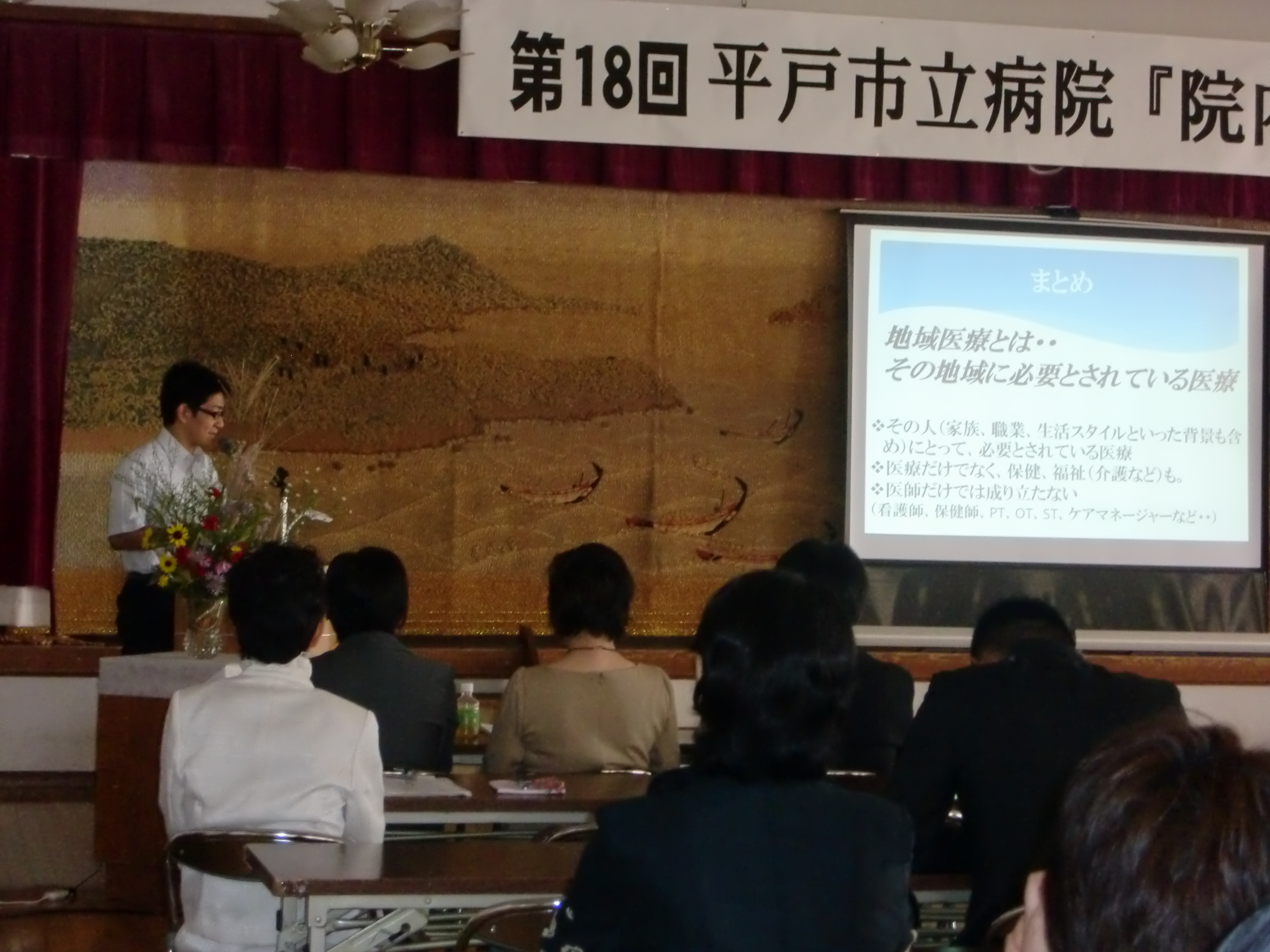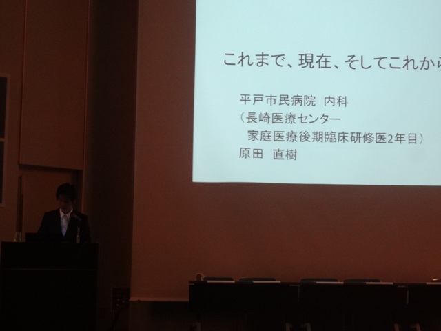 平戸市民病院の後期研修医の原田先生はシンポジストとして「これまで、現在、そしてこれから」とプライマリケアのキャリアパスについて発表しました。
