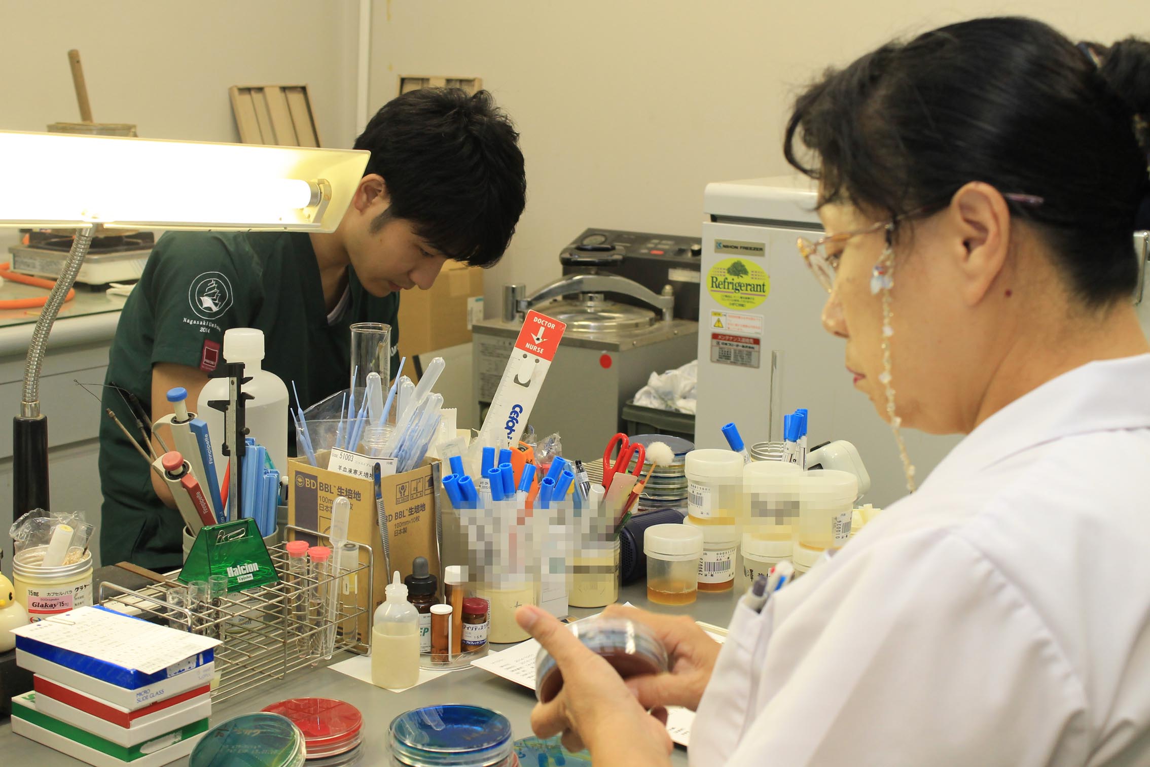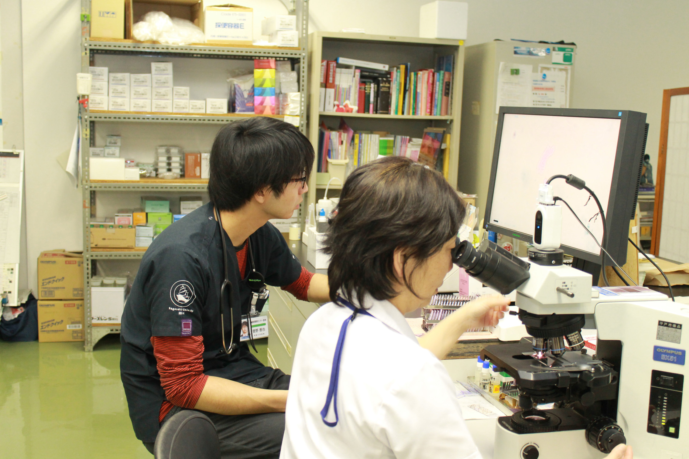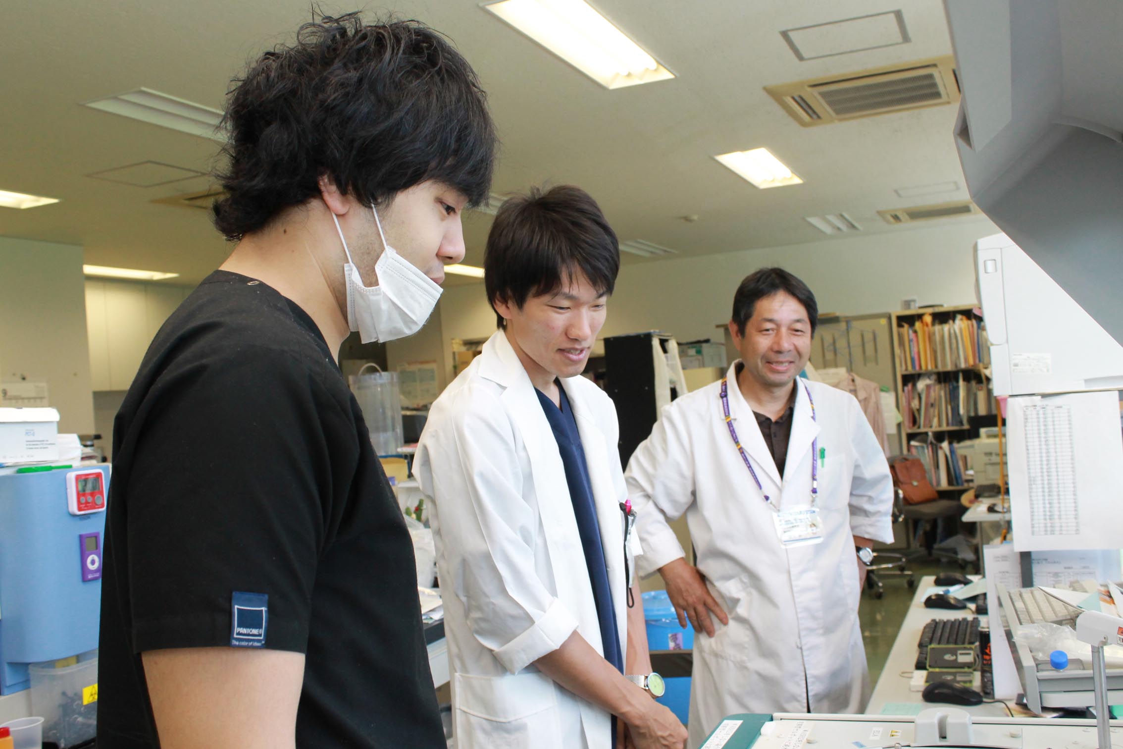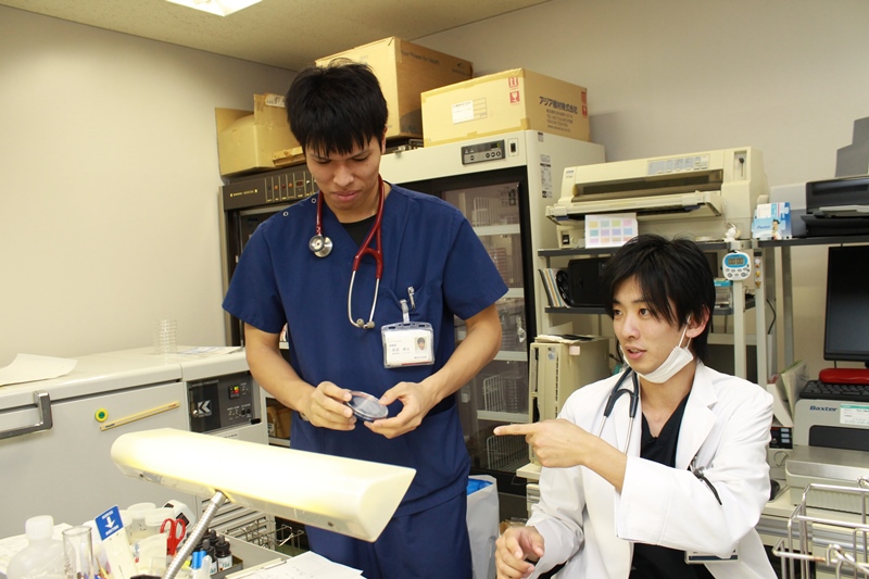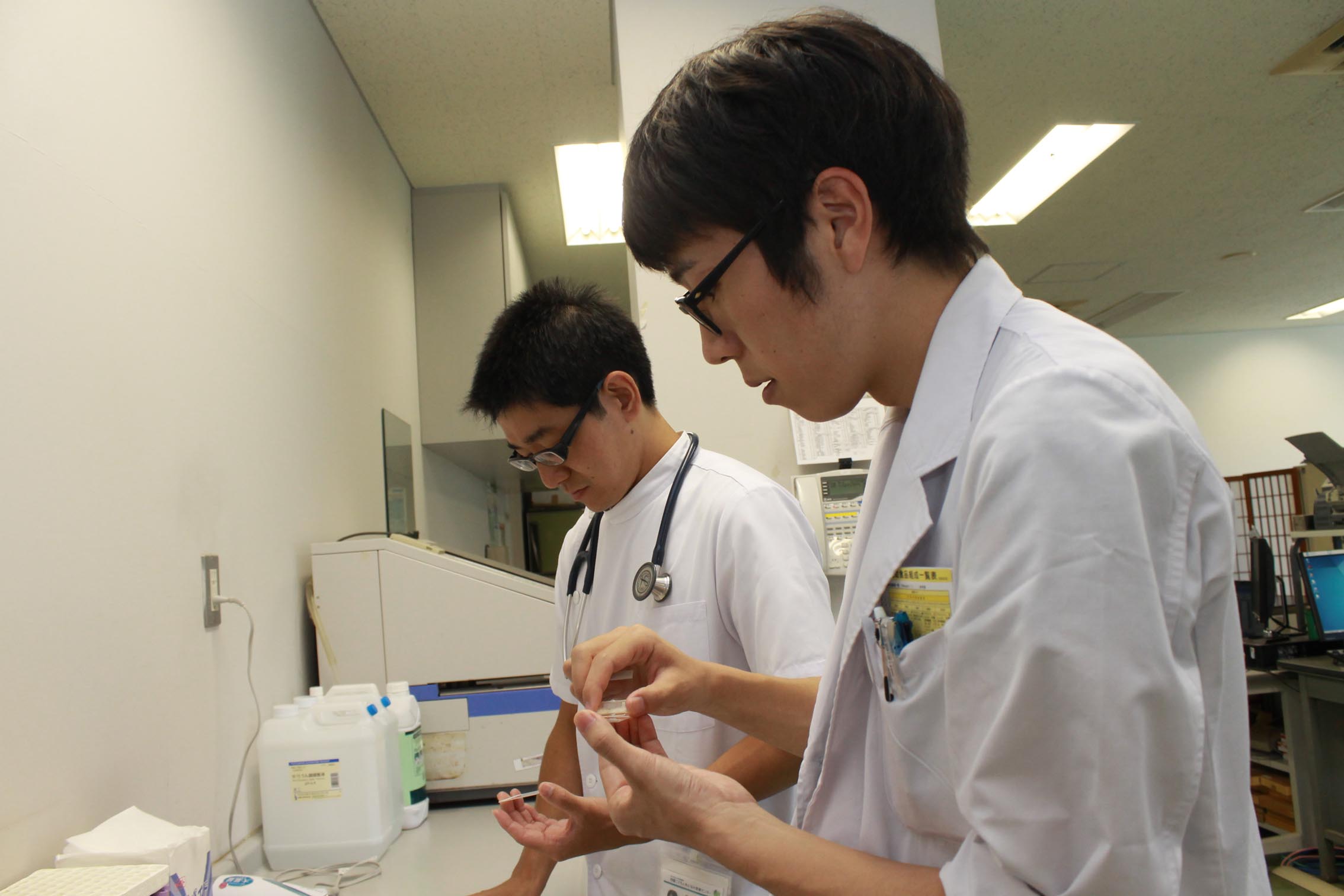 中山先生と明石先生は検査科実習。グラム染色やギムザ染色などを行います。いろんな検体を見れるのも魅力です。