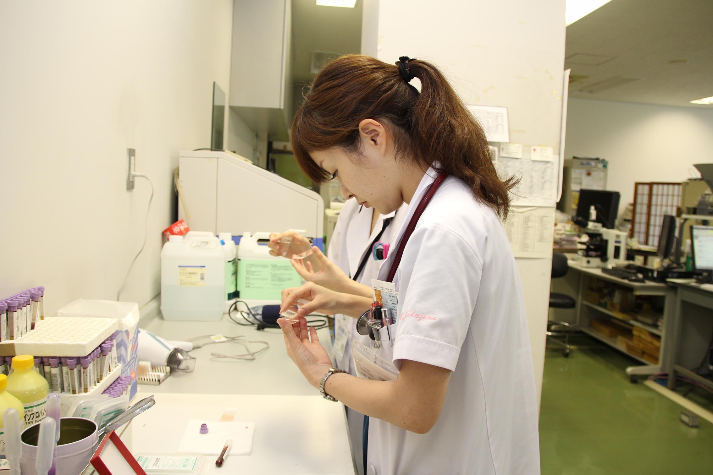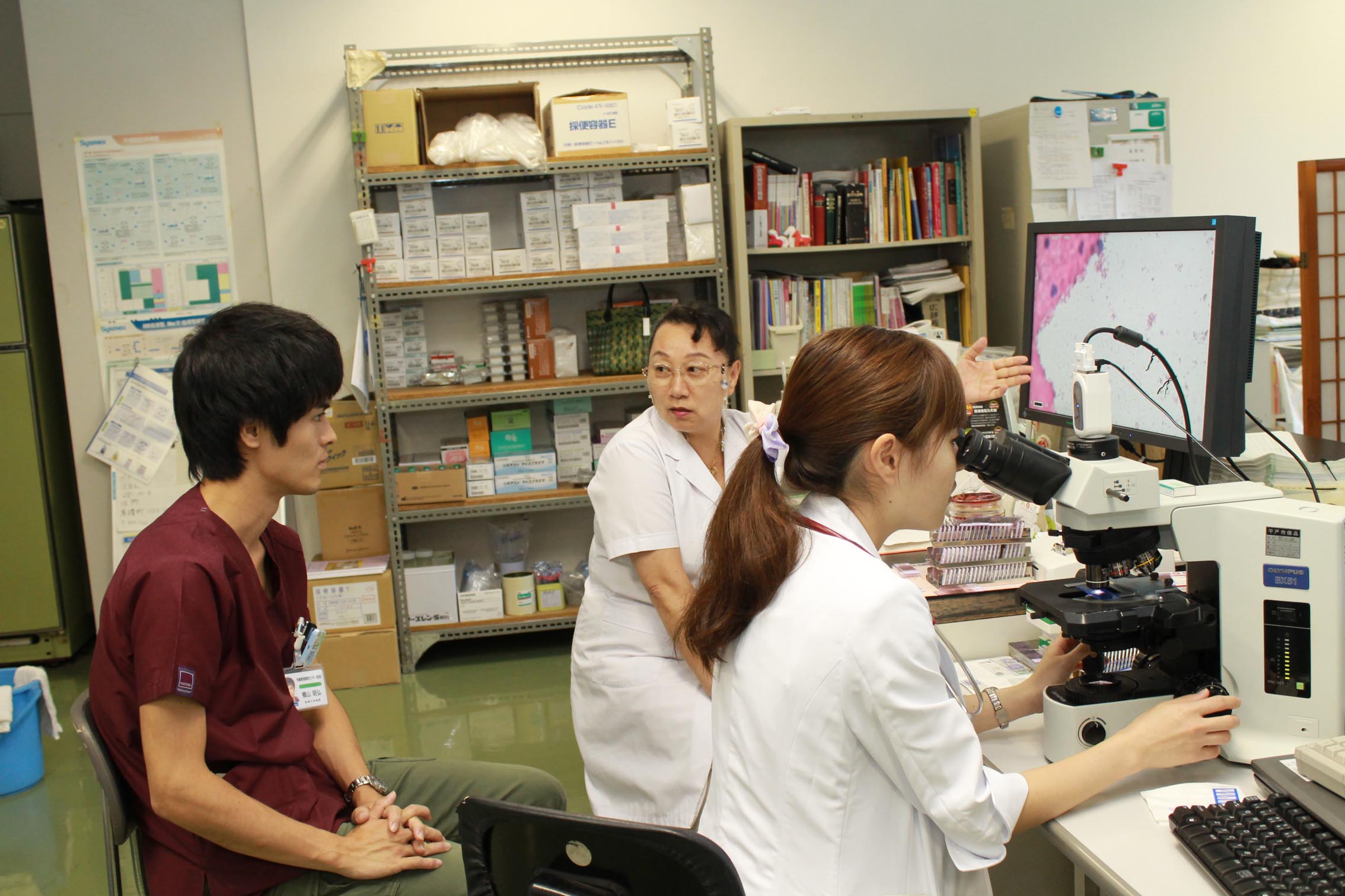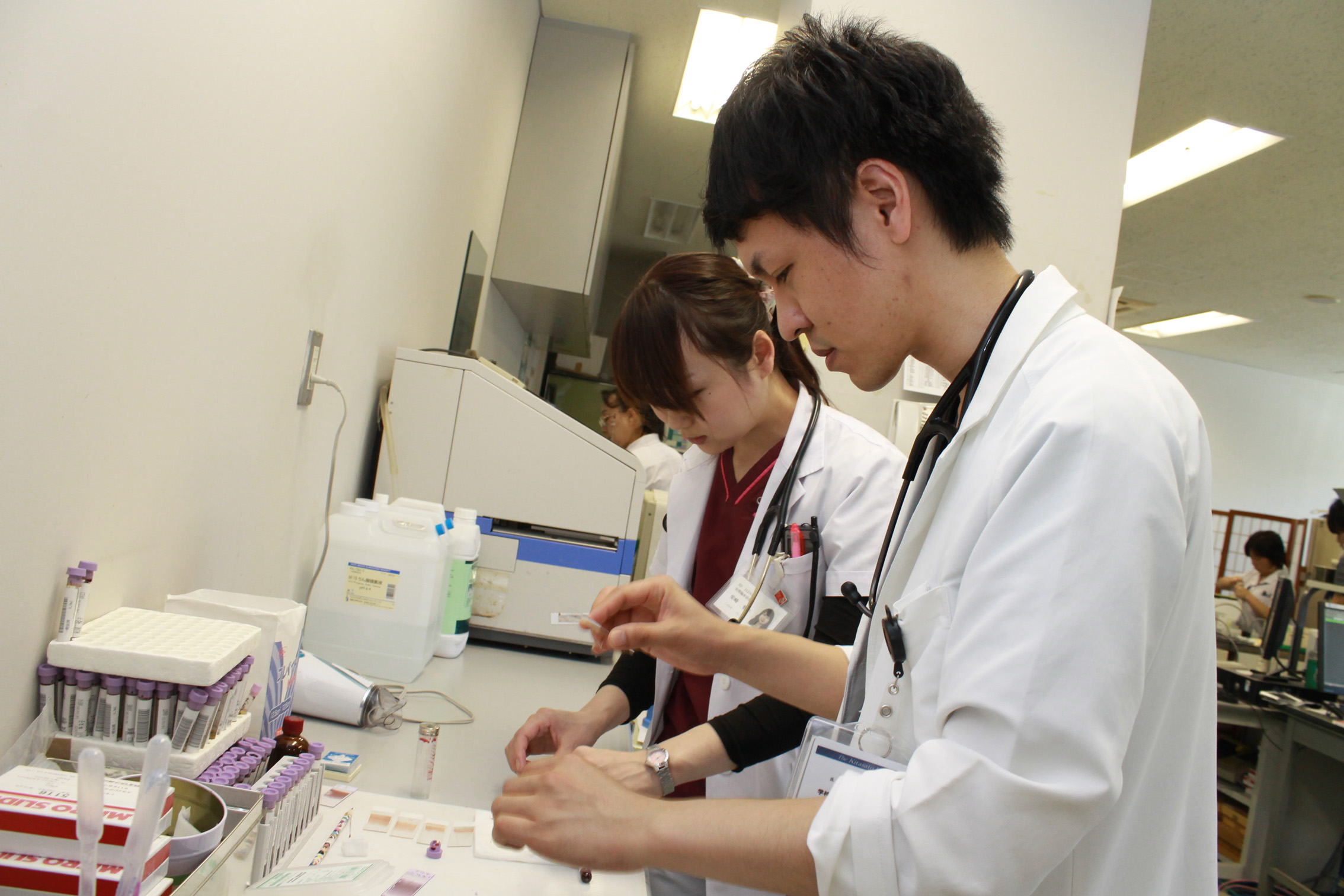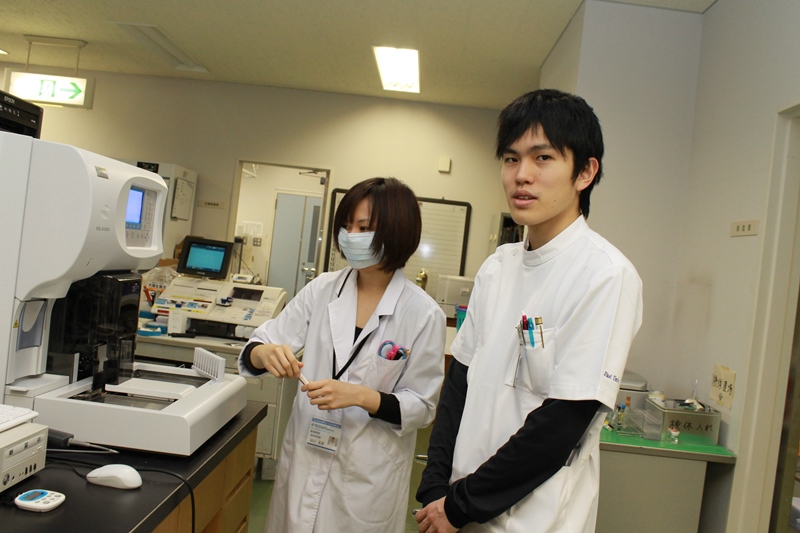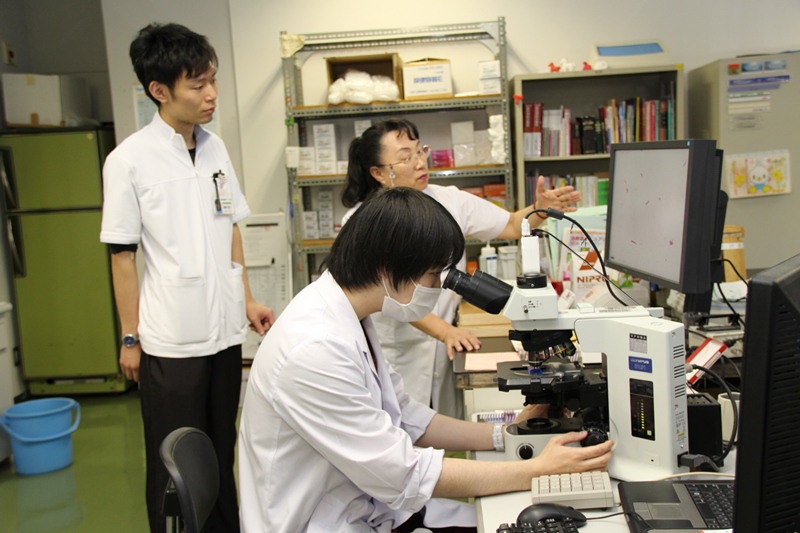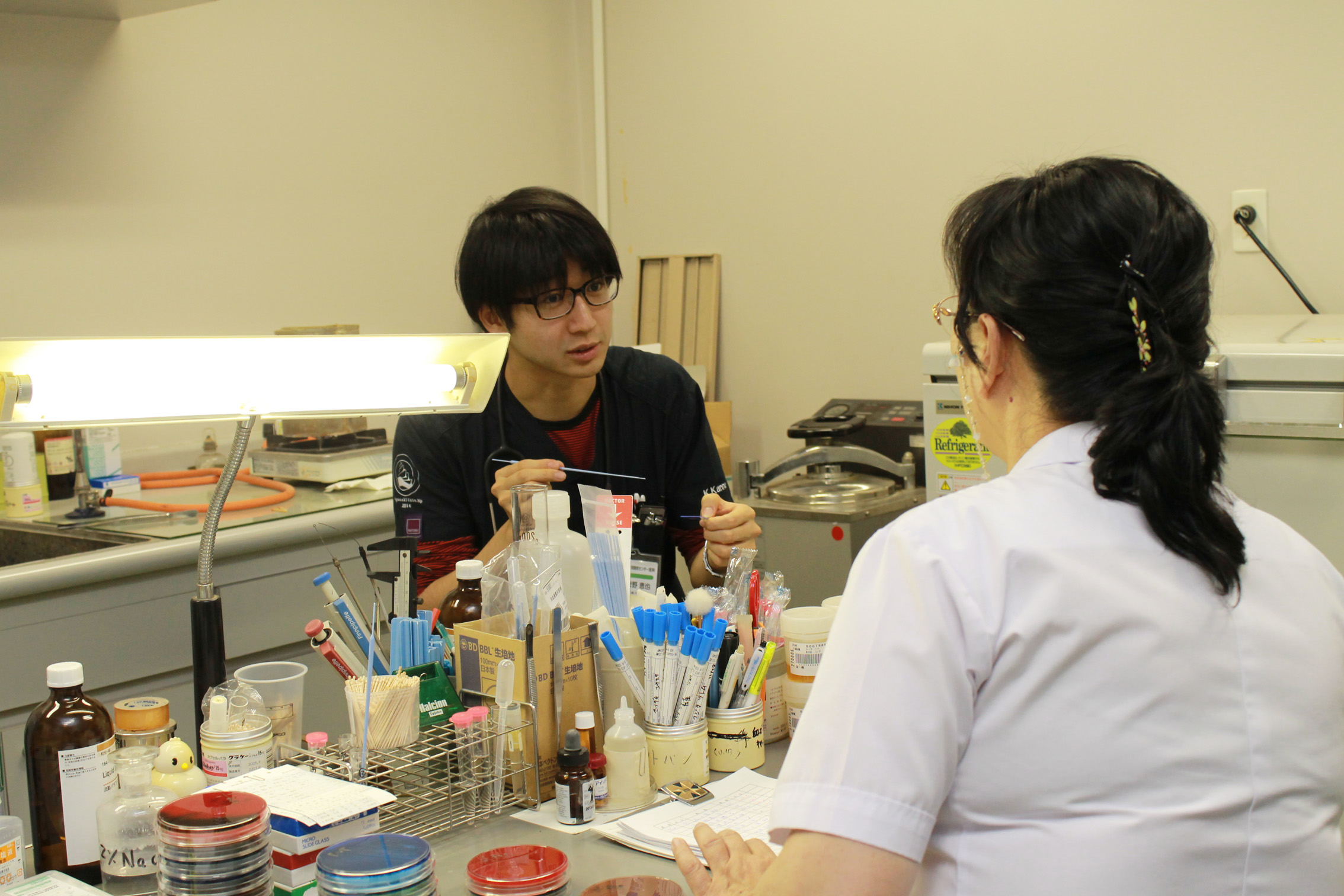 中山先生と明石先生は検査科実習。グラム染色やギムザ染色などを行います。いろんな検体を見れるのも魅力です。