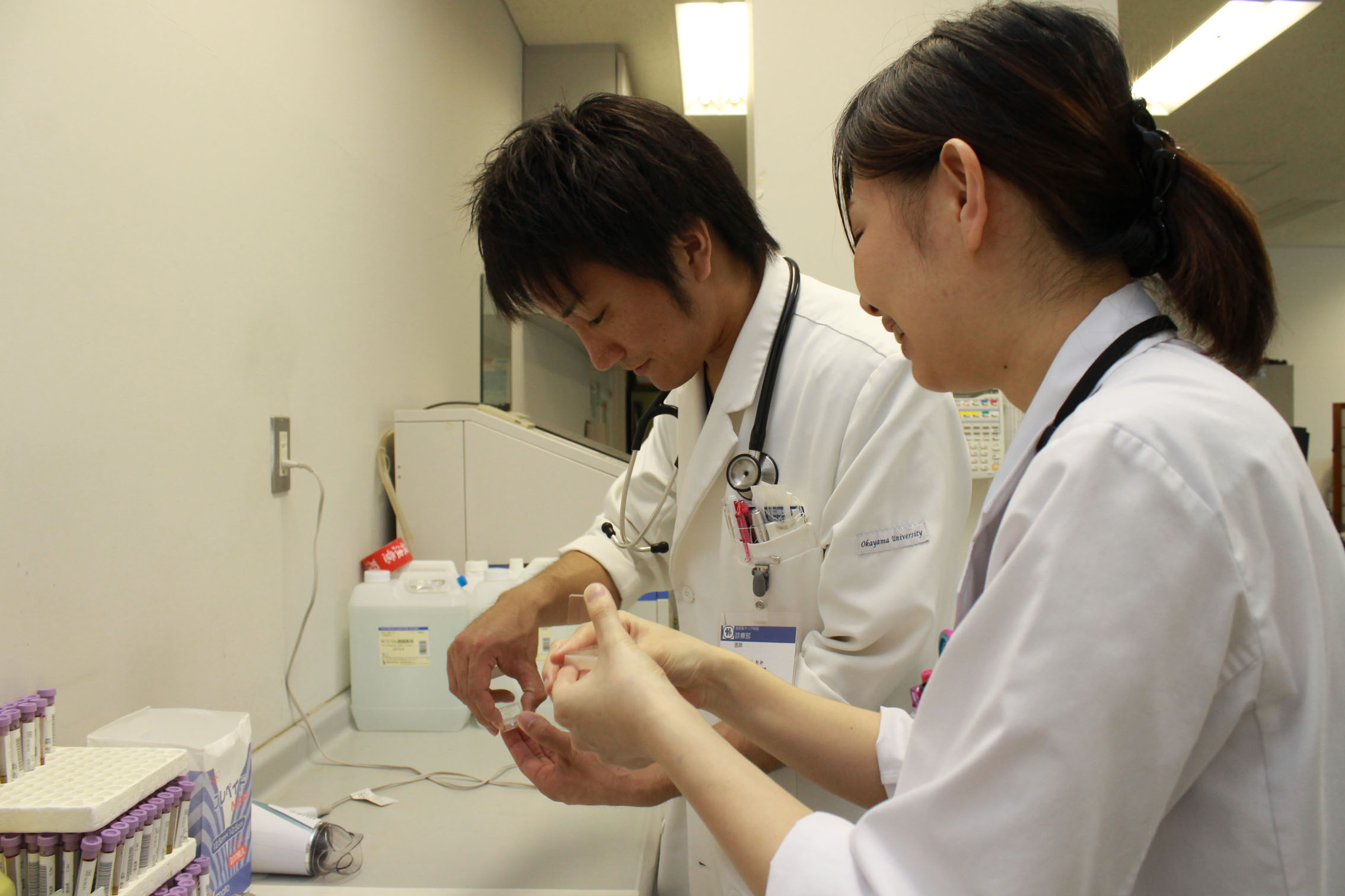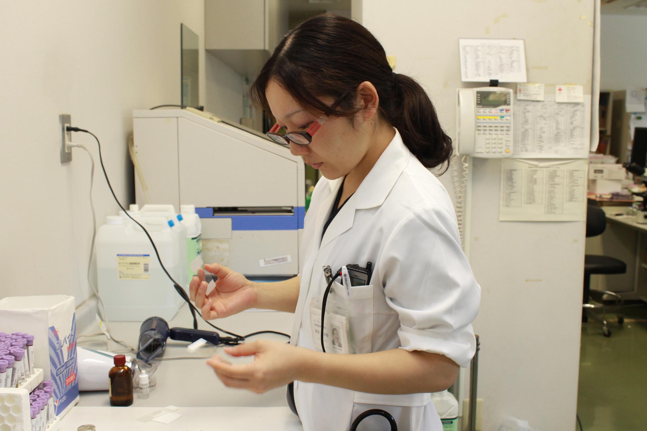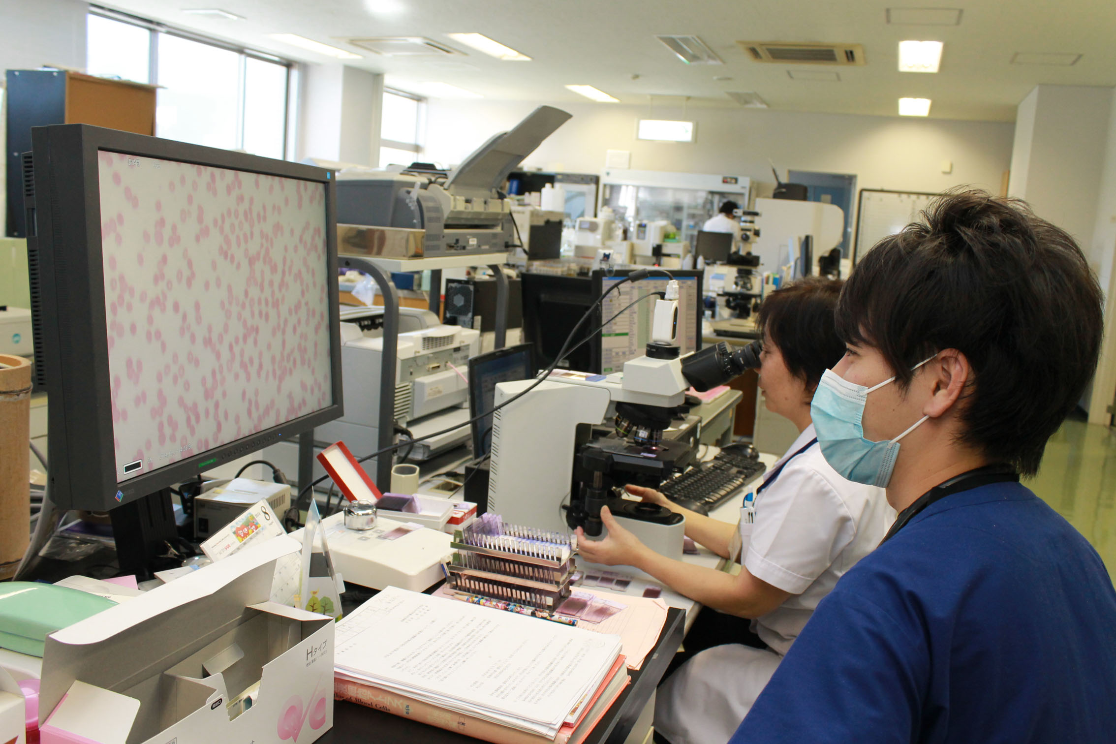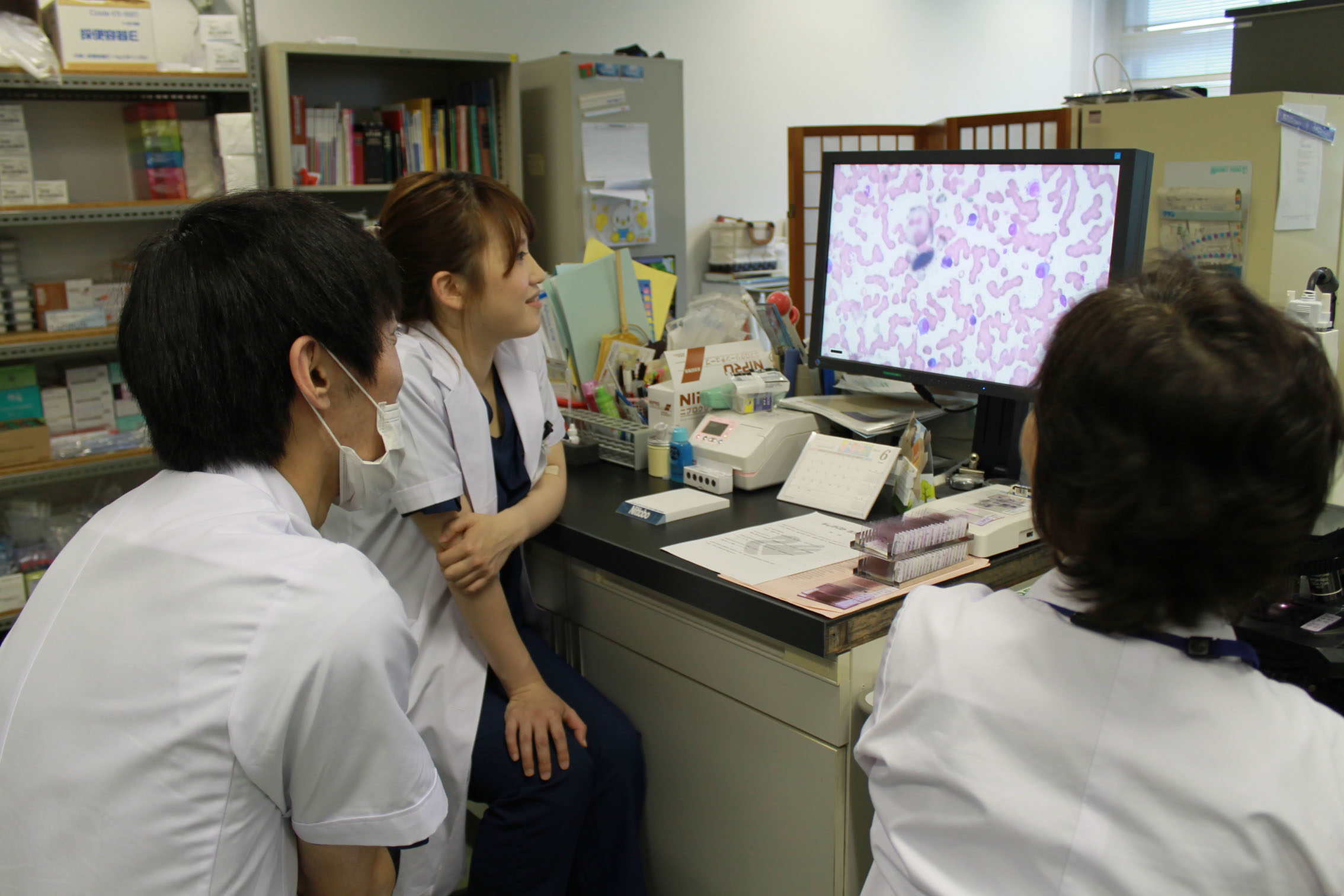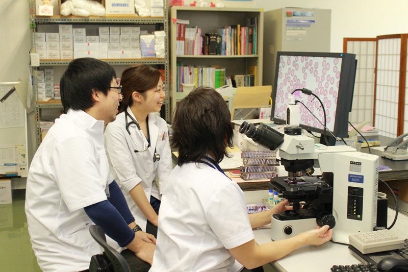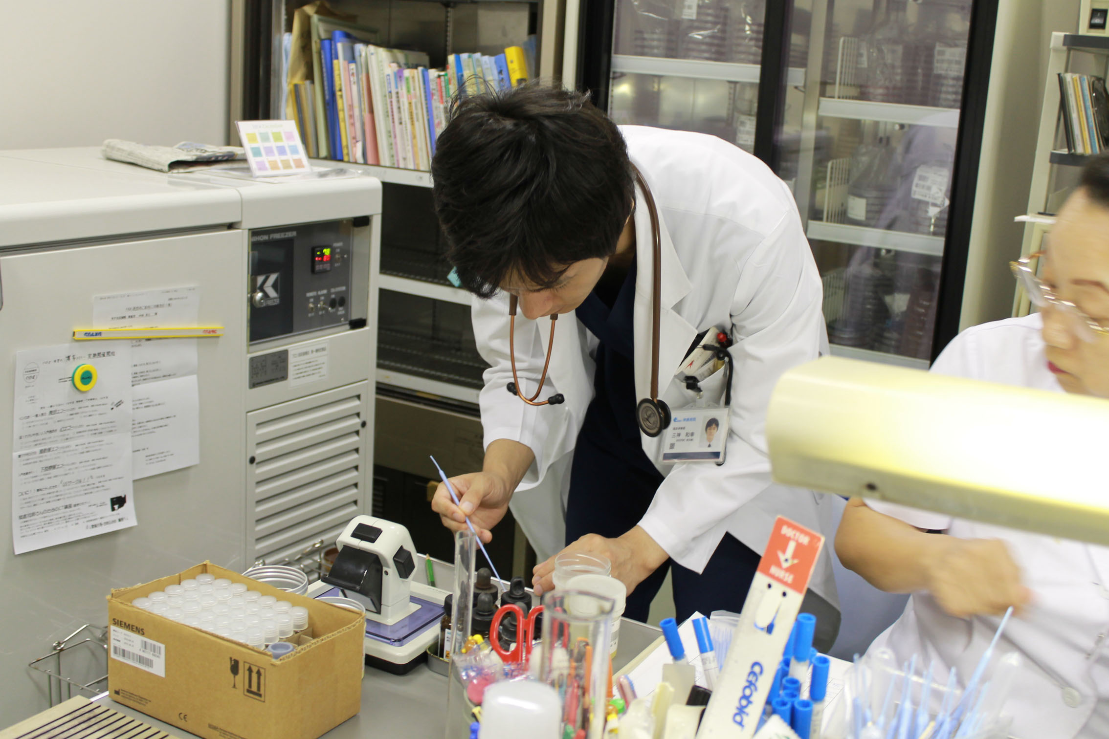 中山先生と明石先生は検査科実習。グラム染色やギムザ染色などを行います。いろんな検体を見れるのも魅力です。