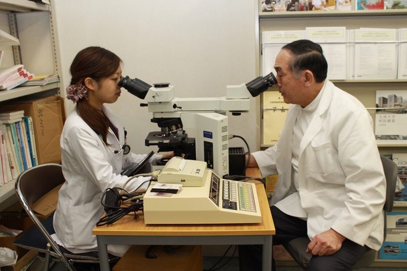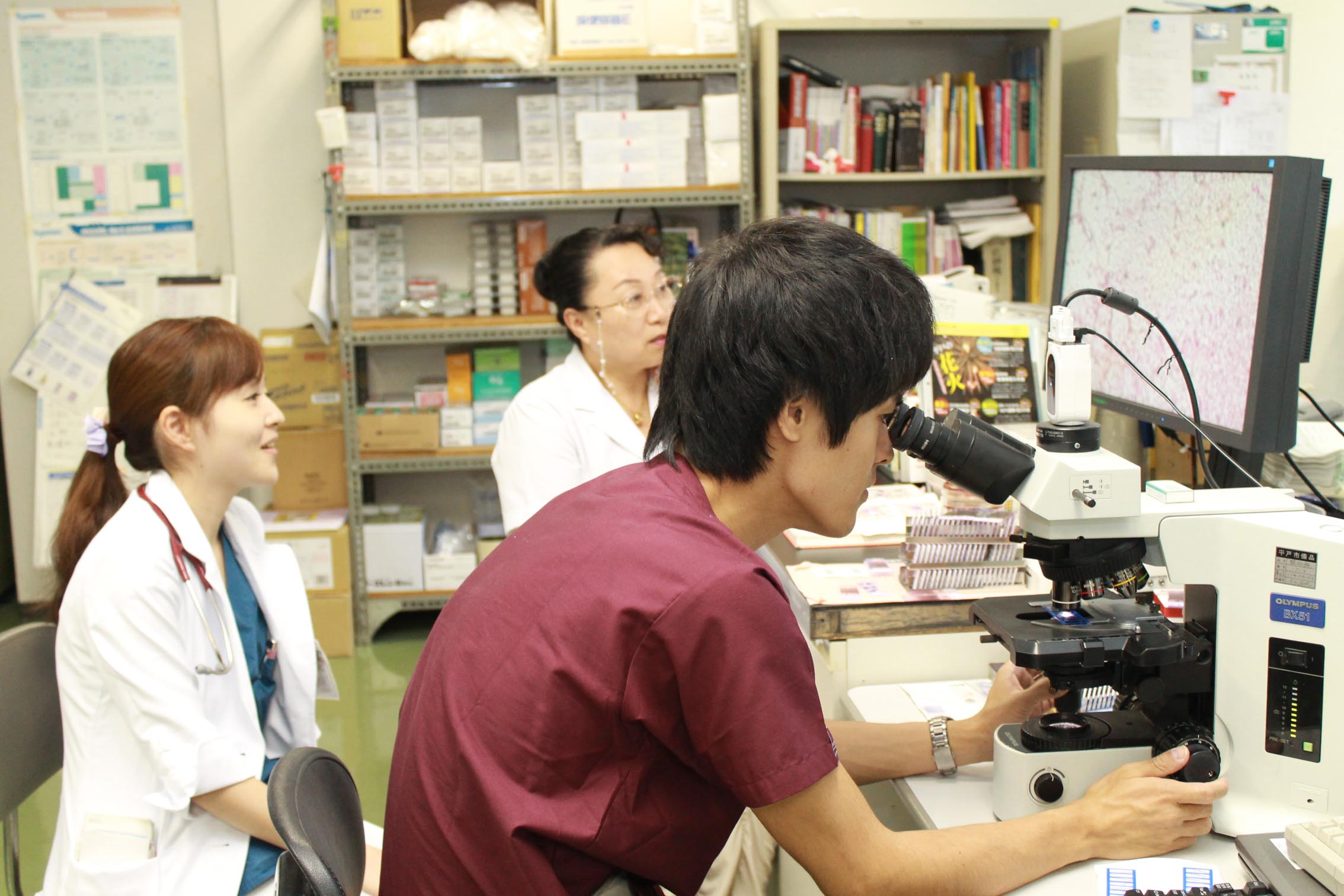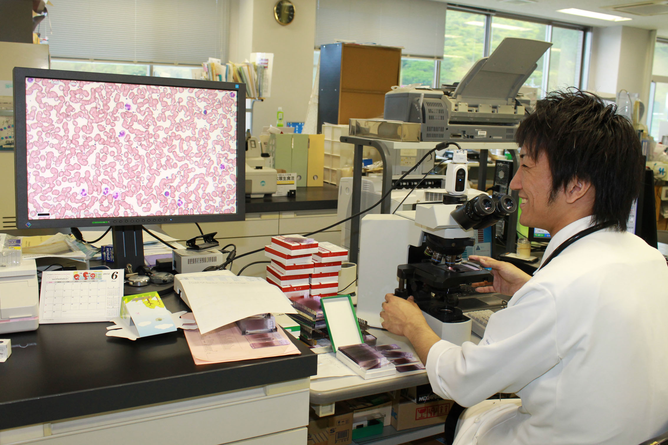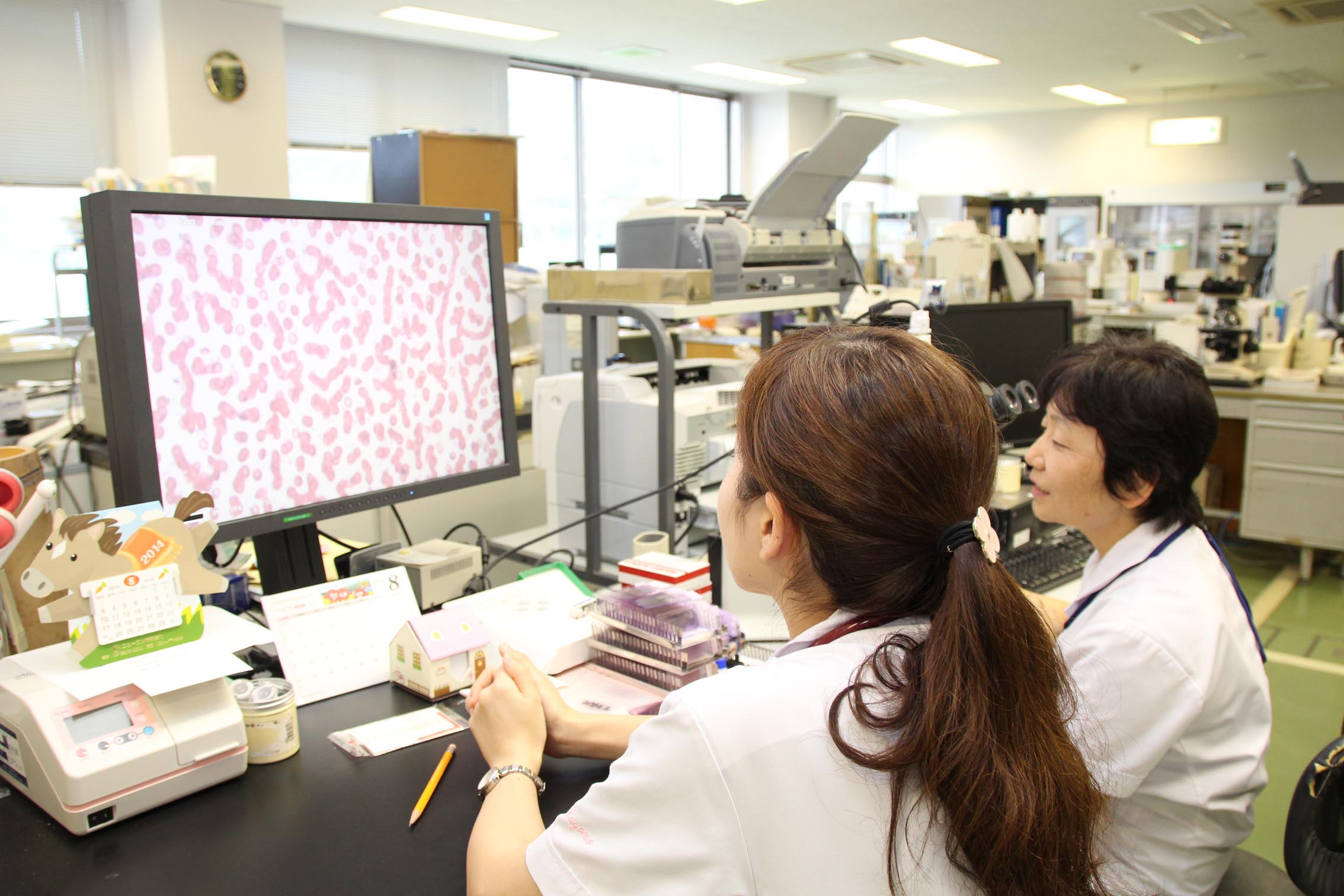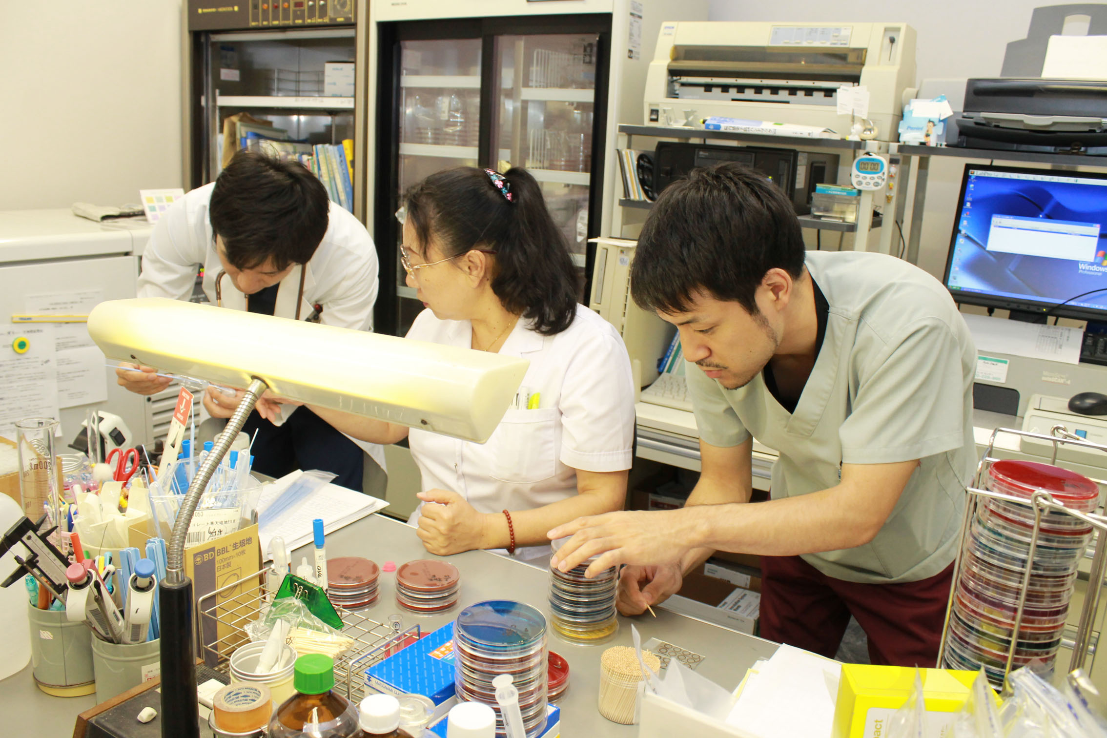 中山先生と明石先生は検査科実習。グラム染色やギムザ染色などを行います。いろんな検体を見れるのも魅力です。