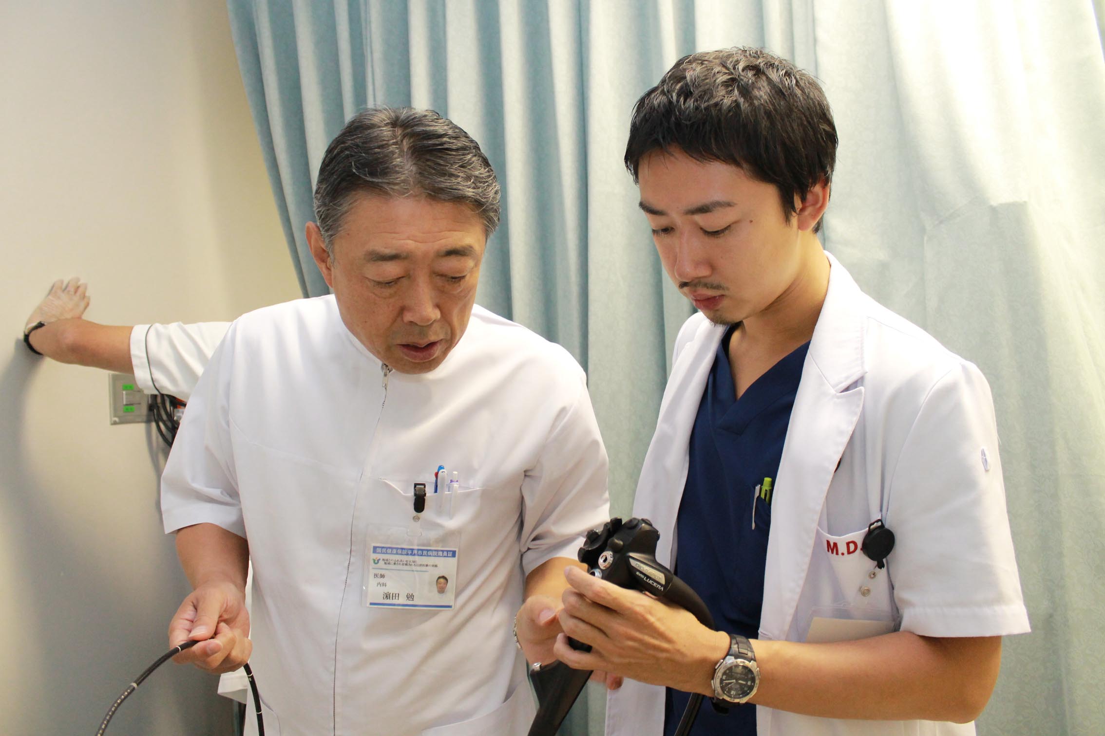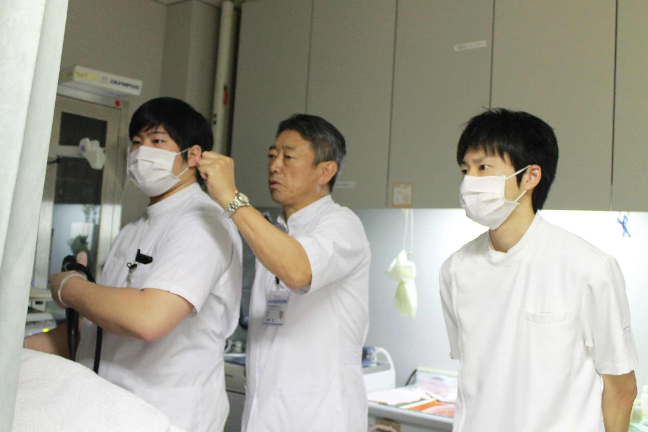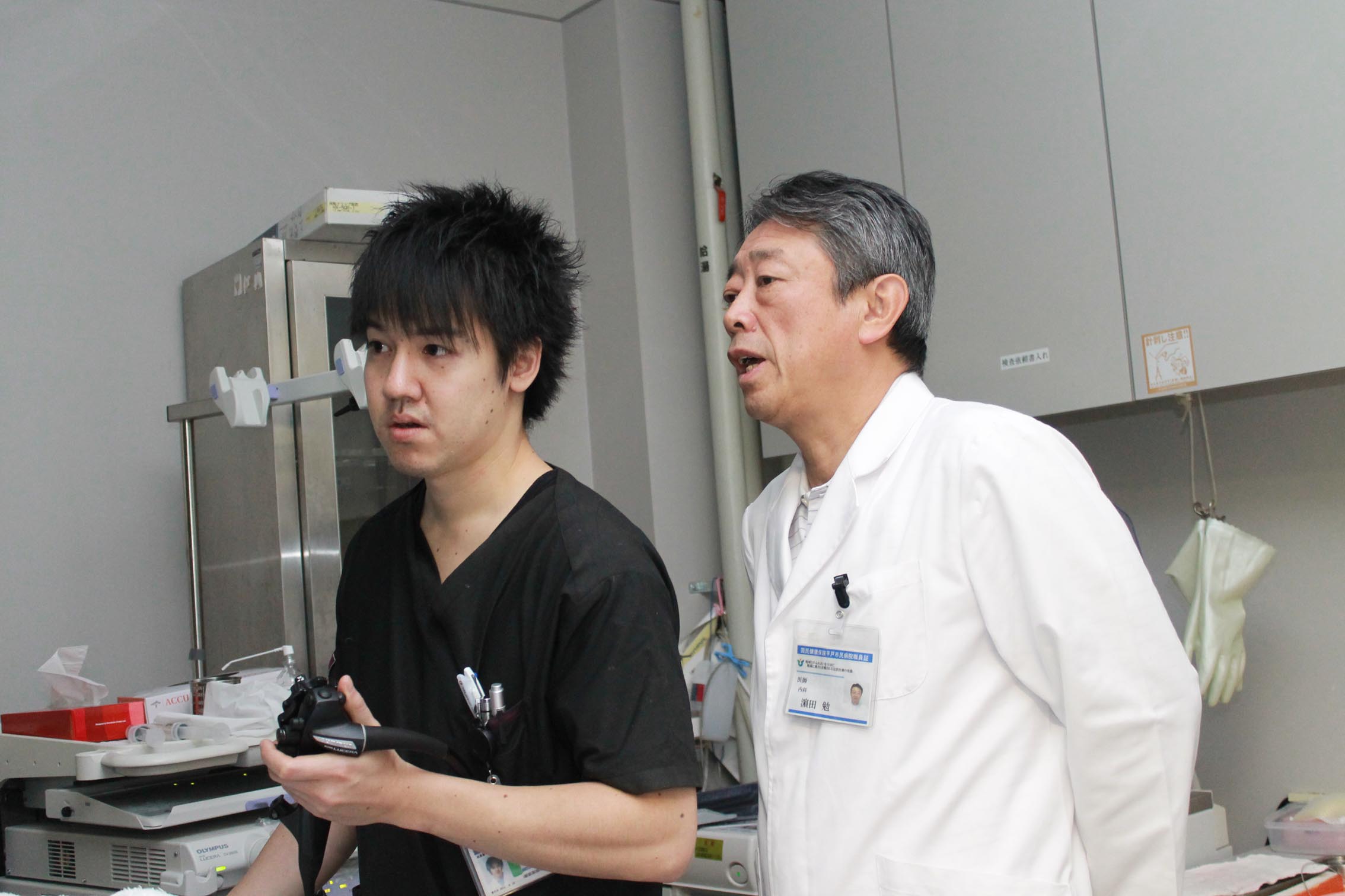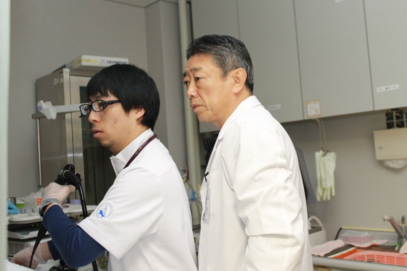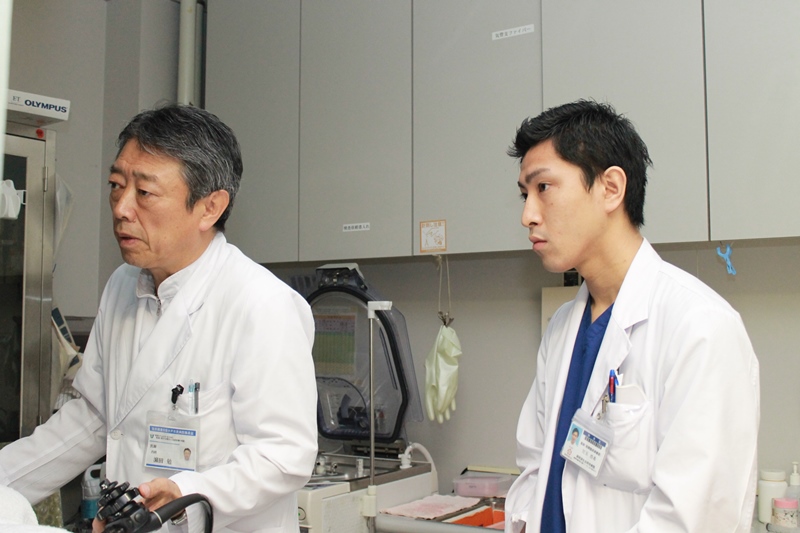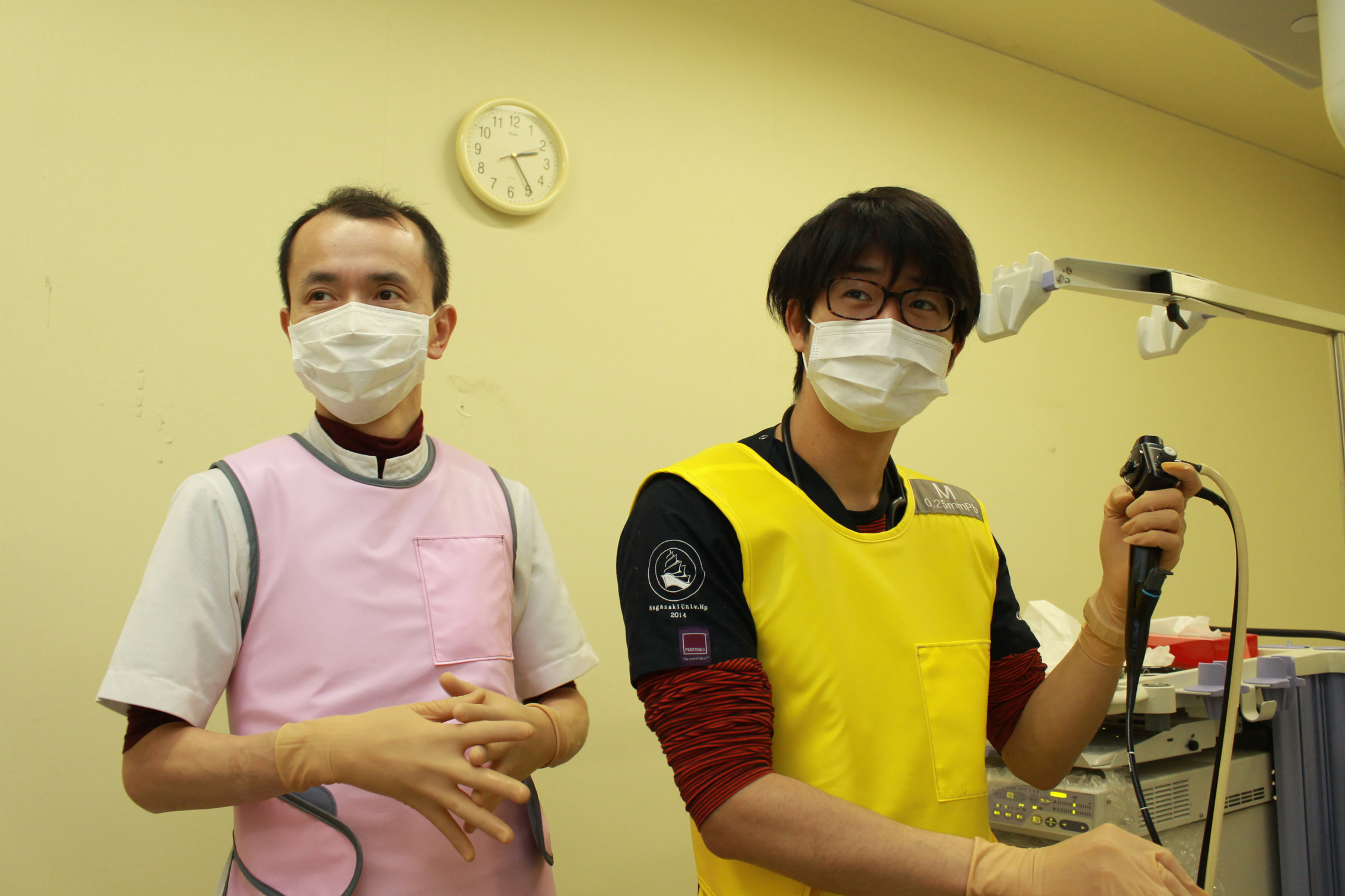 濱田先生指導による赤羽先生の内視鏡検査実習。