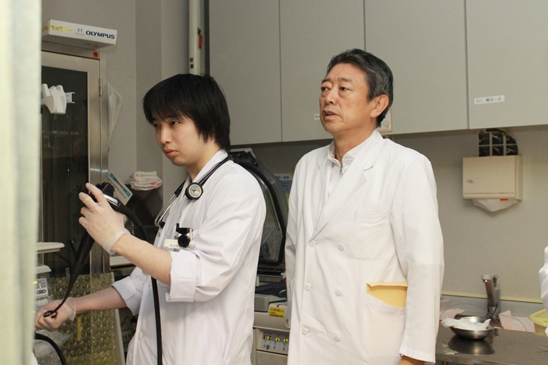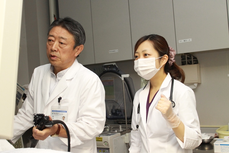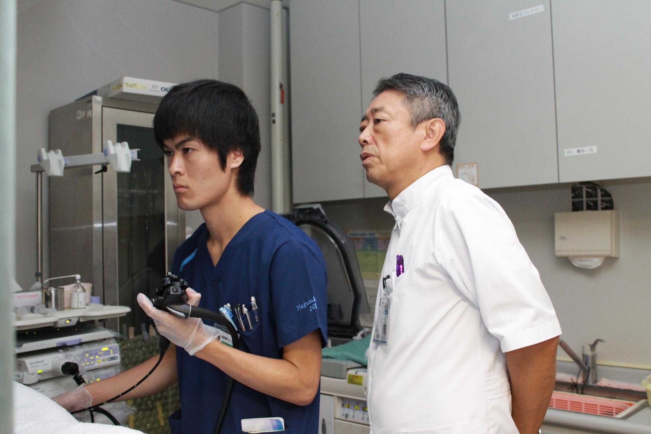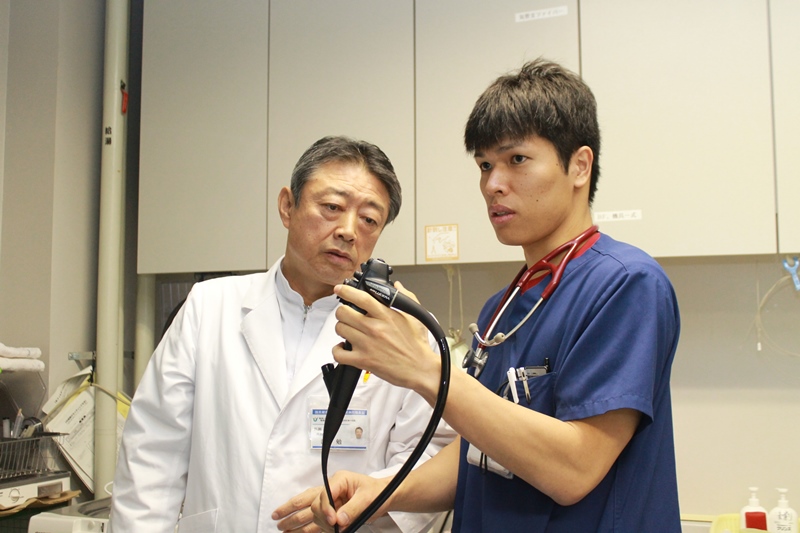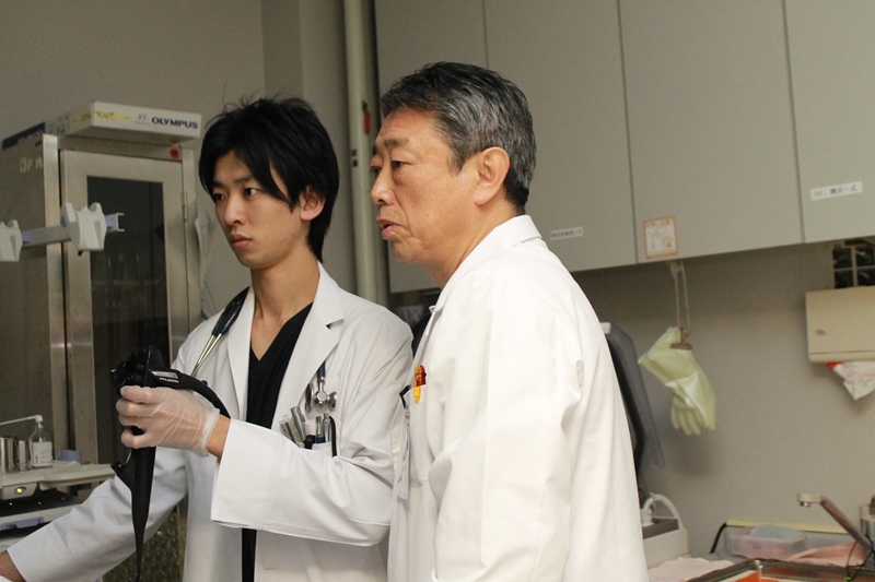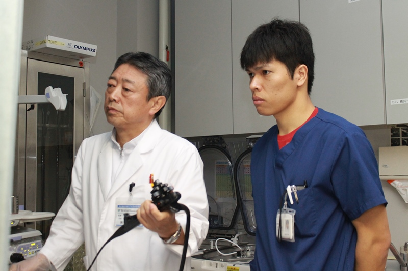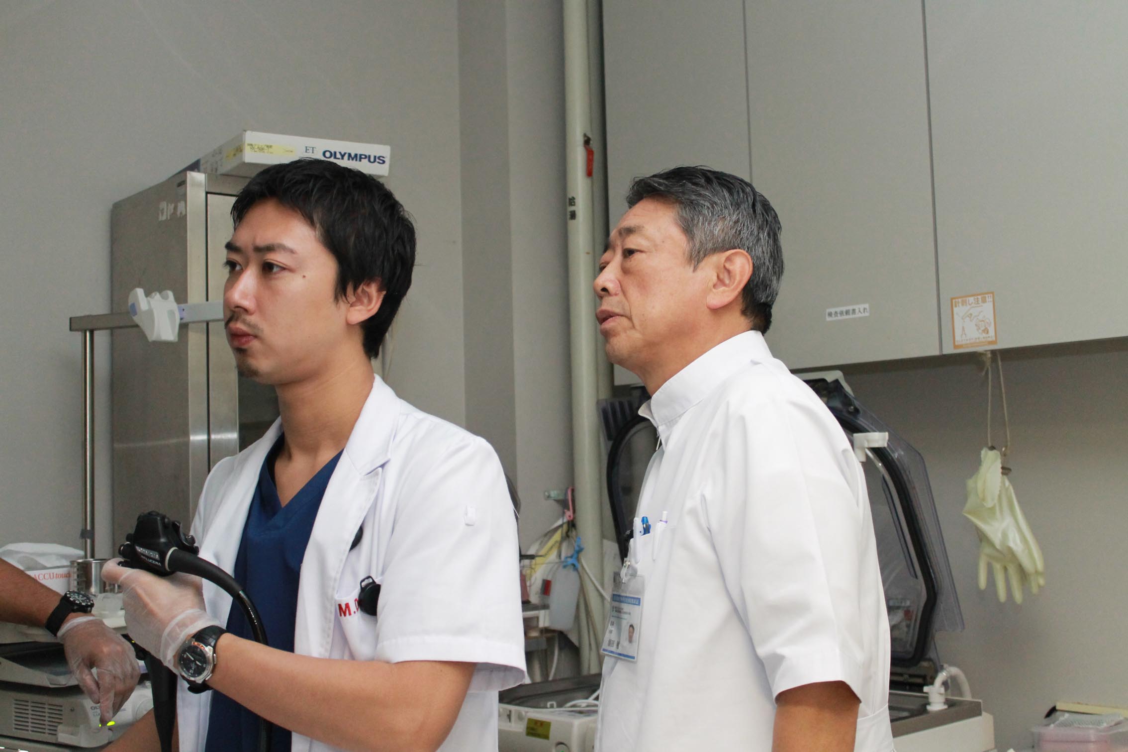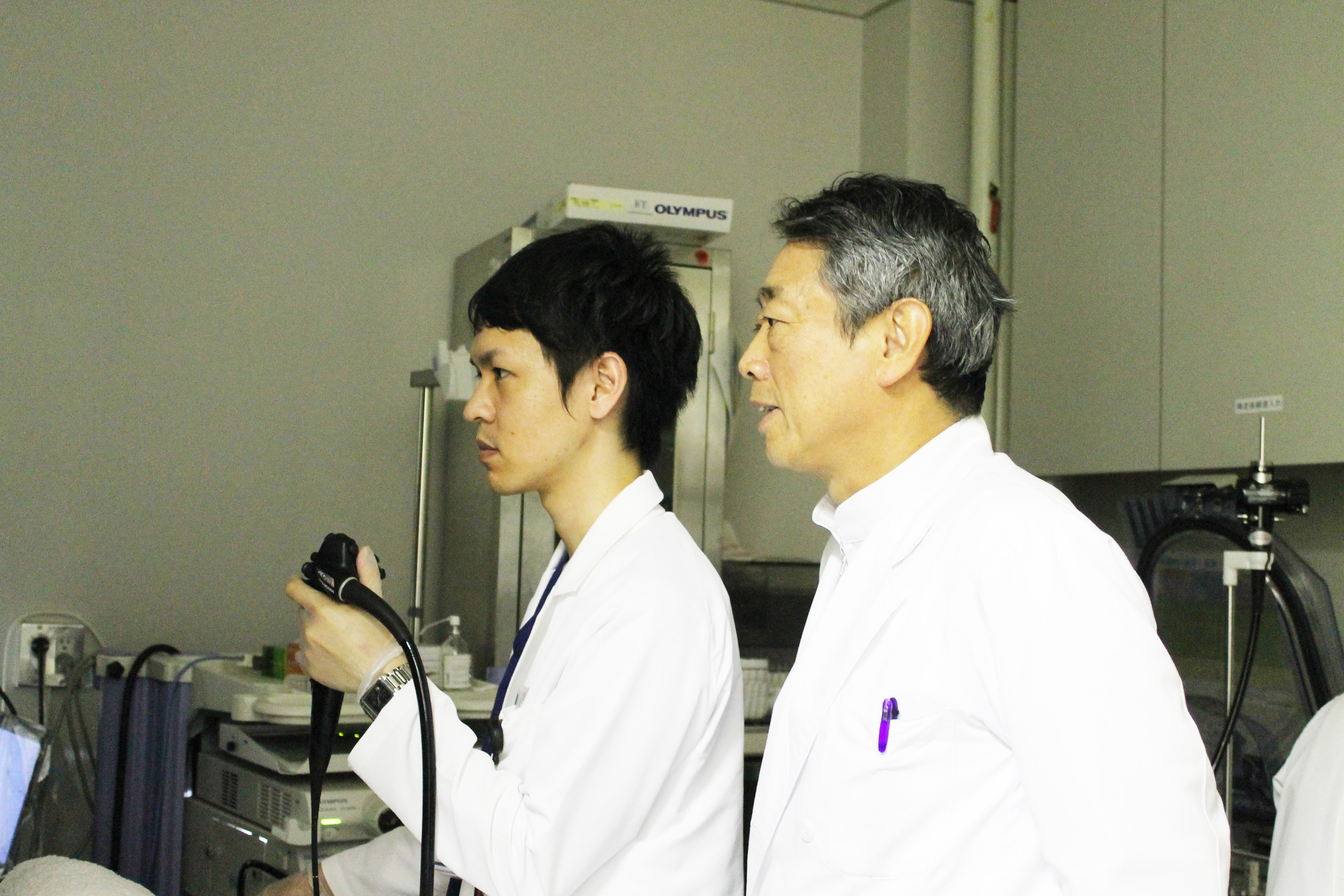 濱田先生指導による赤羽先生の内視鏡検査実習。